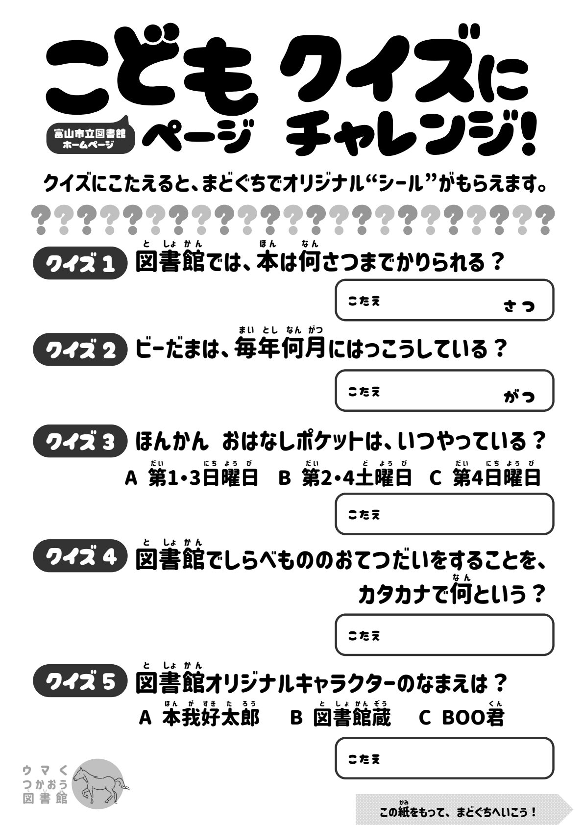 クイズせいかいで、シールもらえる!※ほんかん3かいまどぐちでくばります