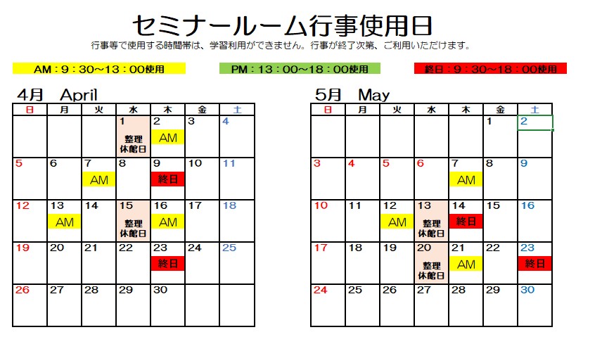 本館では、5階閲覧室(高校生以上対象)と3階セミナールーム(高校生以下対象)を学習室として使えます。セミナールームは行事のない日しか使えないため使用可能日は↓で確認してください。