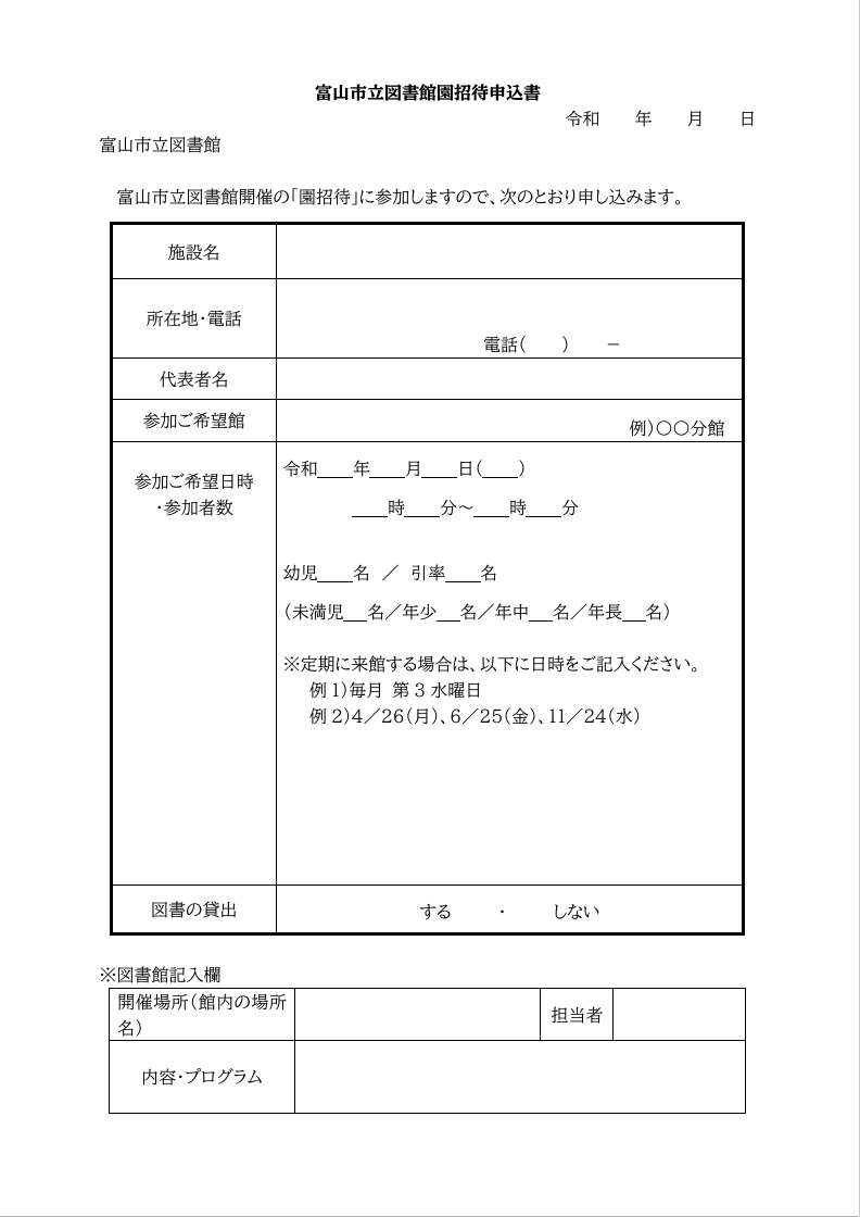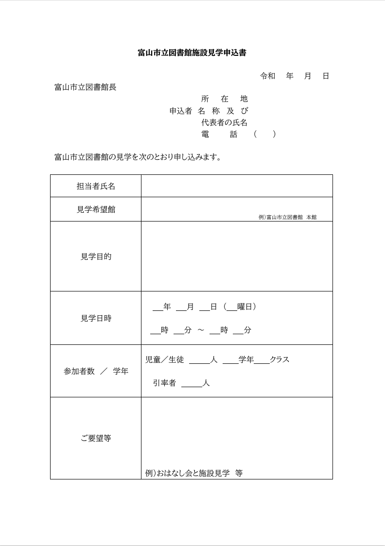 ※日時については、図書館行事等のためご希望に添えない場合もありますので、ご了承ください。