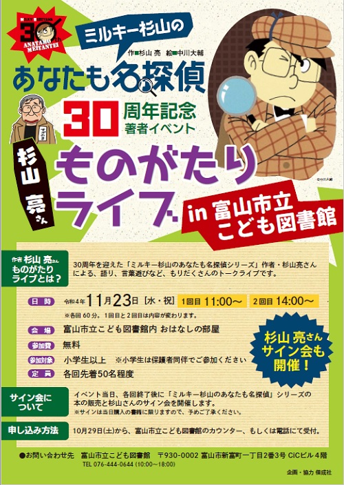 午前の部(11~12時)は定員に達したため受付を締め切りました。 「ミルキー杉山のあなたも名探偵」シリーズで人気の児童書作家が、自作の物語や古今東西の物語をアレンジして語ります。 日 時:2022年11月2 … 続きを読む 【こども】11/23 杉山亮さんの「ものがたりライブ」【終了しました】