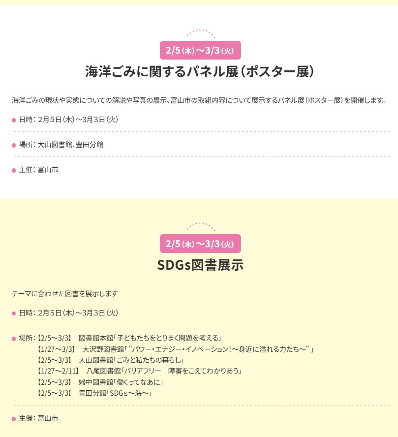 富山市立図書館では、豊田分館と大山図書館「海洋ごみに関するパネル展(ポスター展)」を開催するほか、一部の館でSDGsに関連した展示も開催します。
