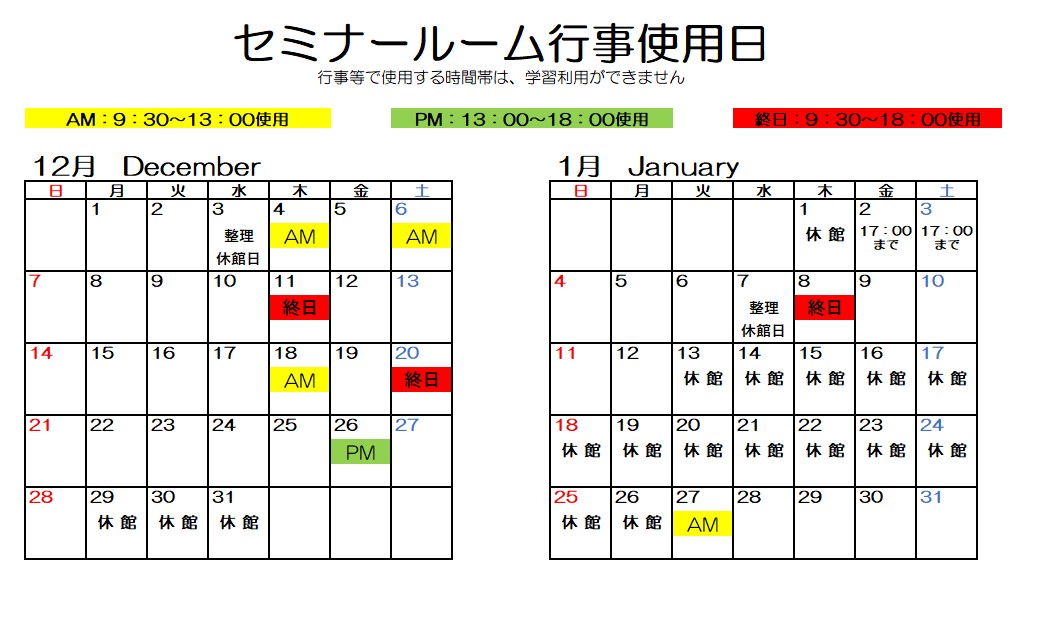 12~1月のセミナールーム使用可能日はこちら↓