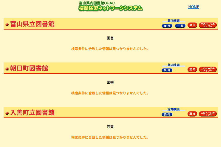 富山県立図書館ホームページ、「県内図書館横断検索システム」(複数の図書館の蔵書を一度に検索できるシステム)において、当館の所蔵資料が検索結果に表示されないという不具合が発生しています。