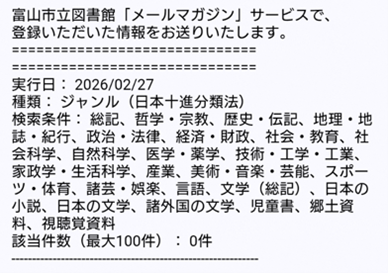 【内容】登録済みの「ジャンル」や「キーワード」に該当する資料の情報が送られてこない。「該当件数(最大100件):0件」というメールが送られてくる。
