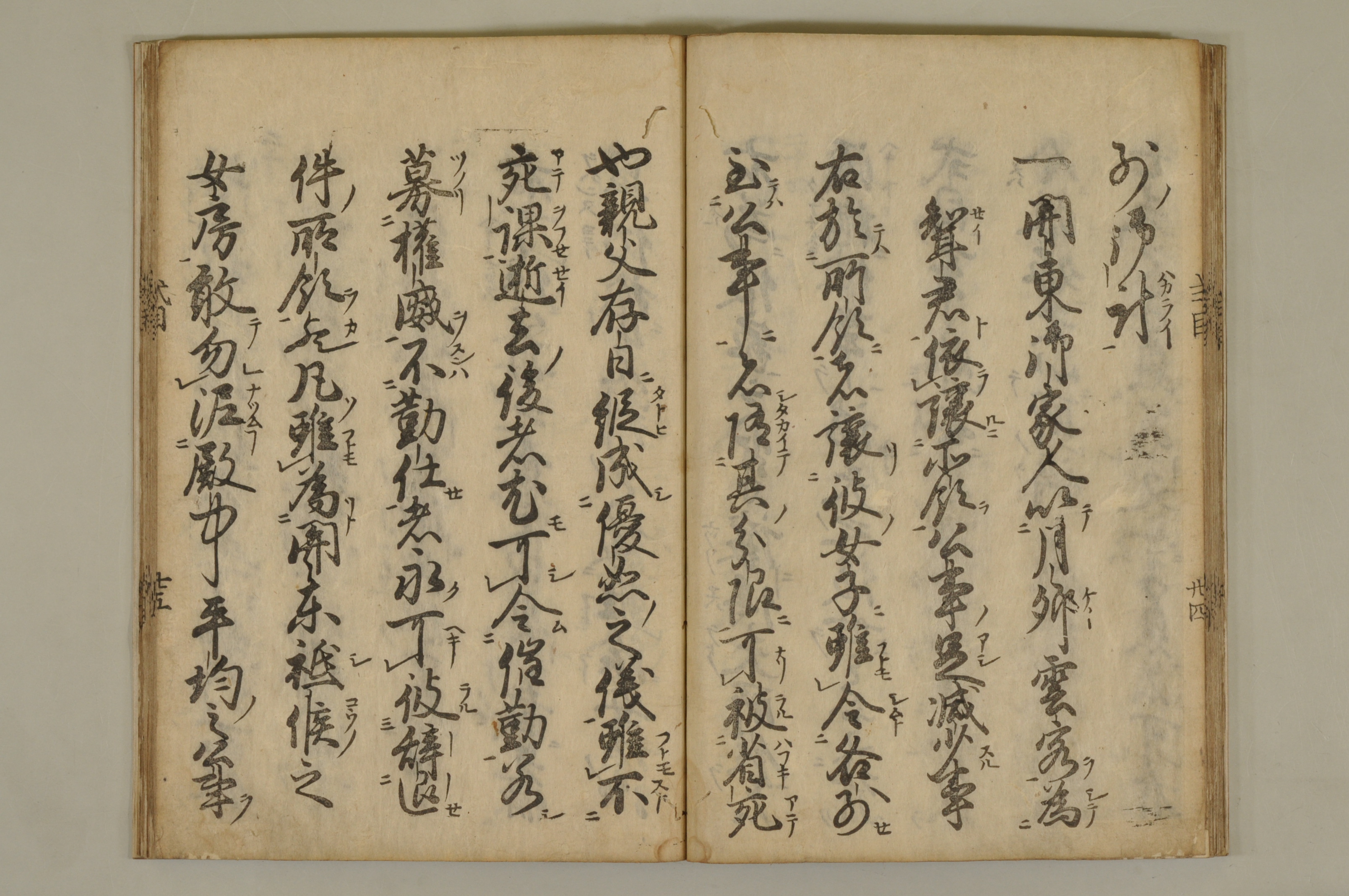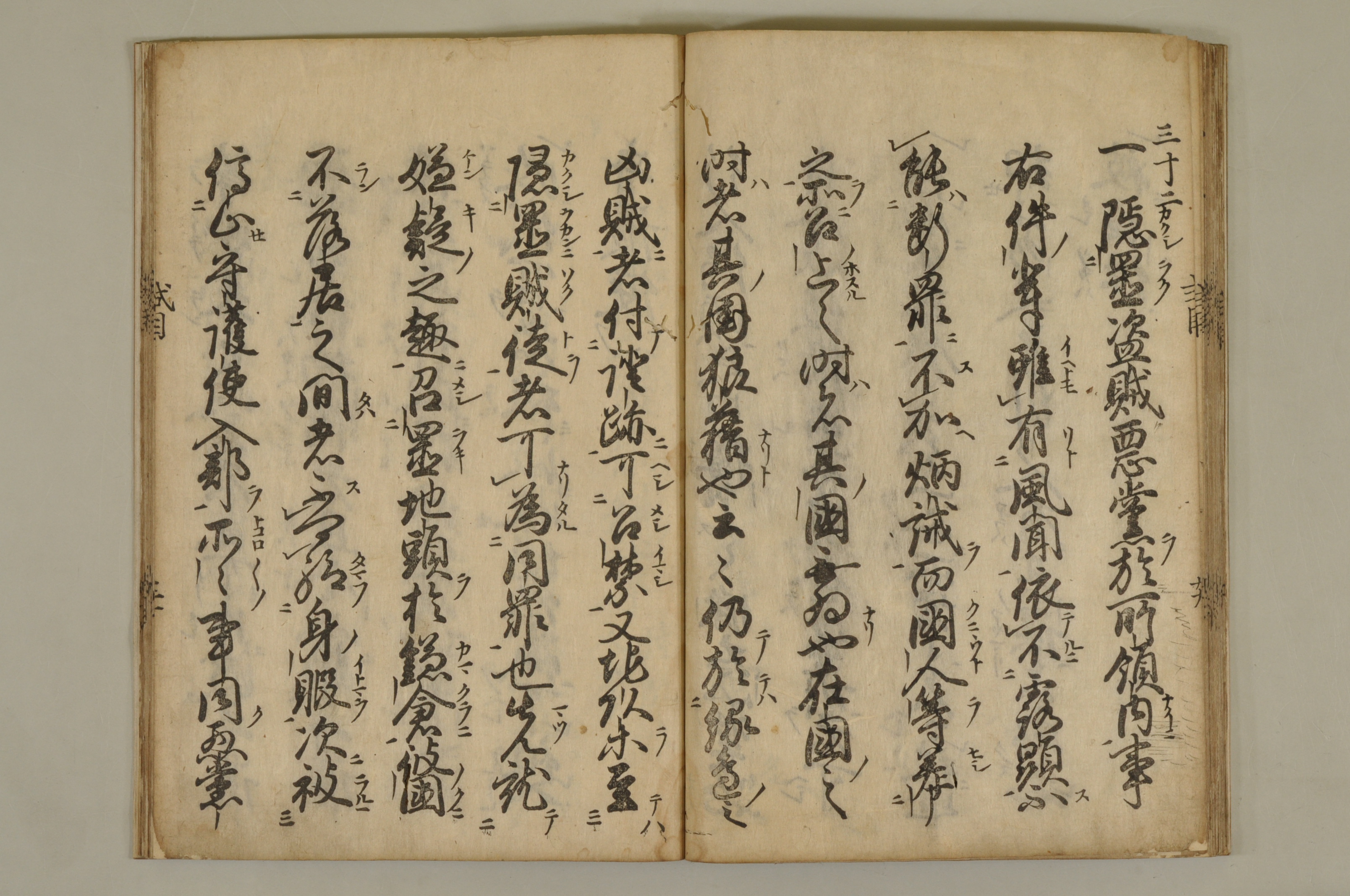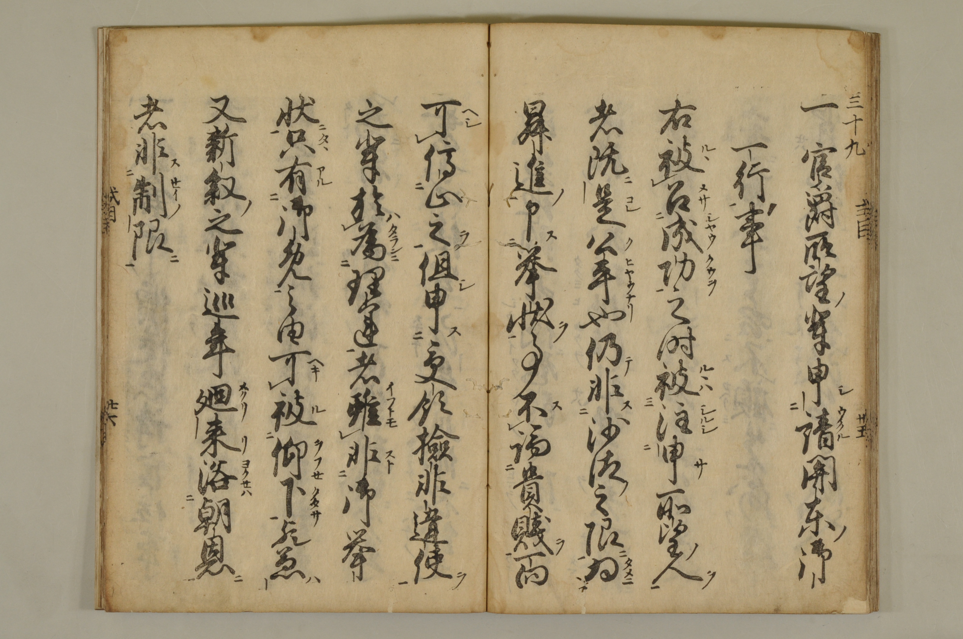 - 版心:「式目」跋:「此書廼万代不易之法也□□[欠損]/清家點以重鋟諸梓矣盖為□[欠損]/夫愚蒙輩易讀也苟易讀則□[欠損]/理速通理速則犯法者稍少□[欠損]/非師道少補乎抑郷有先生村/有夫子而時習之学日新予寧/□[欠損]之哉博雅君子庶幾諒察焉/□□[欠損]己丑秋八月日/従四位下行大史兼算博士小槻宿□□□[欠損]」刊記:「慶長十二丁未暦九月日」
