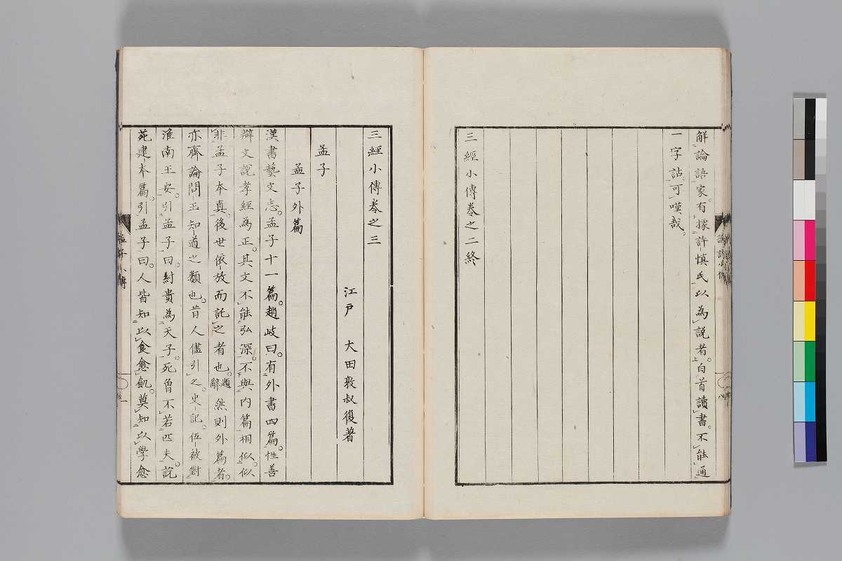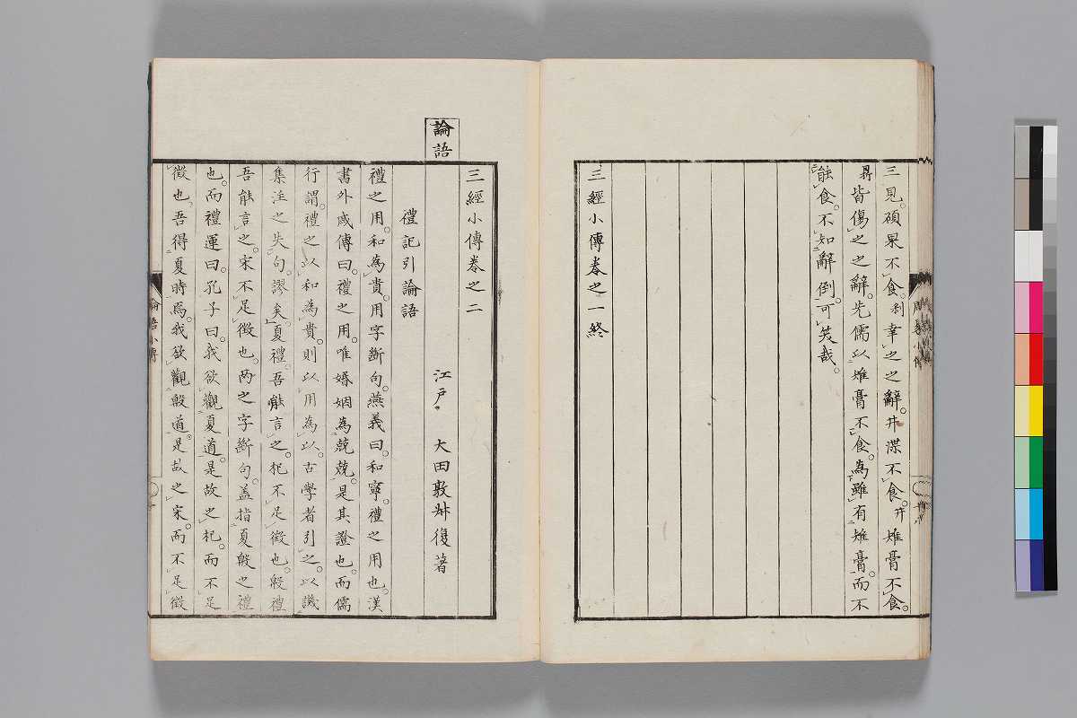 - 版心:「周易小傳」「論語小傳」「孟子小傳」見返:「錦城太田先生著(千里/必究)/(周易/論語/孟子)三經談/東都書林玉巖堂〔版元印「玉巖堂記」あり〕」巻頭の著者表示:「江戸太田敦叔復著」奥附書肆:「京都寺町通松原下ル町勝村治右衛門/大坂心齋橋通北久太郎町河内屋喜兵衛/同安堂寺町秋田屋太右衛門/同博勞町河内屋茂兵衛/同南久宝寺町伊丹屋善兵衛/尾州名古屋本町七丁目永樂屋東四郎/江戸日本橋通一丁目須原屋茂兵衛/同淺草茅町二丁目須原屋伊八/同日本橋通二丁目山城屋佐兵衛/同芝神明前岡田屋嘉七/同横山町三丁目和泉屋金右衛門板」
