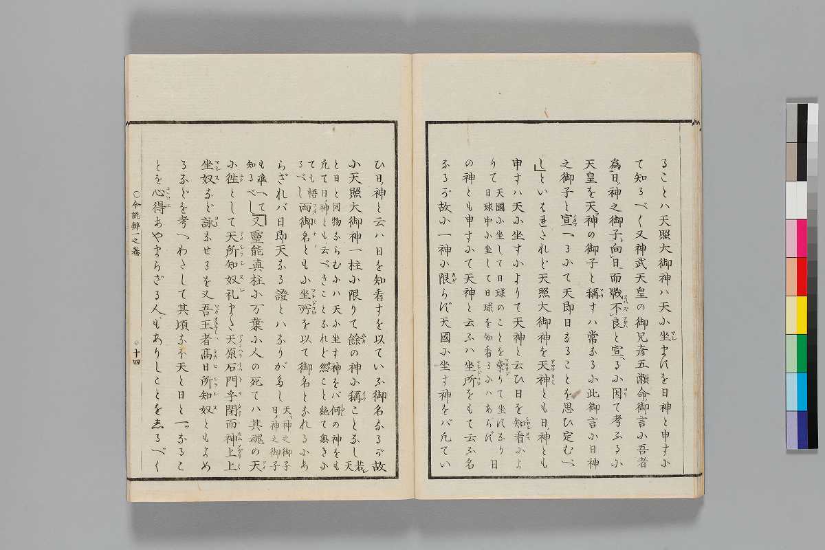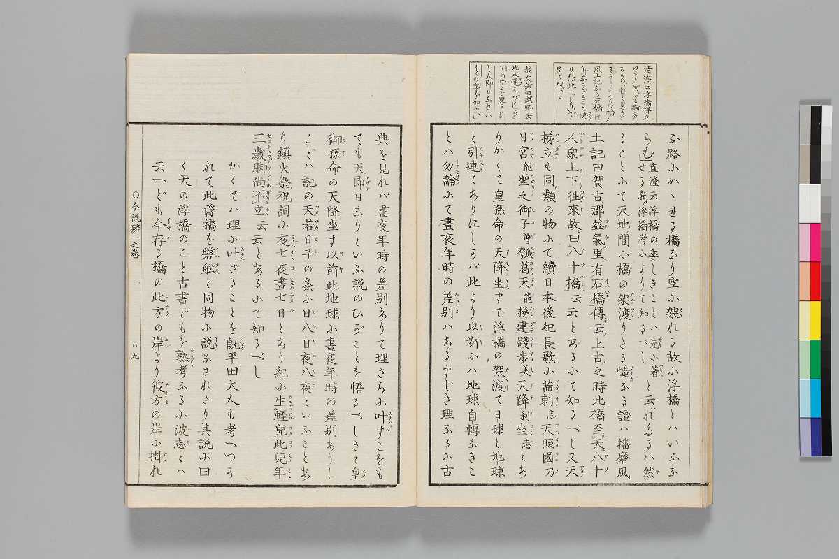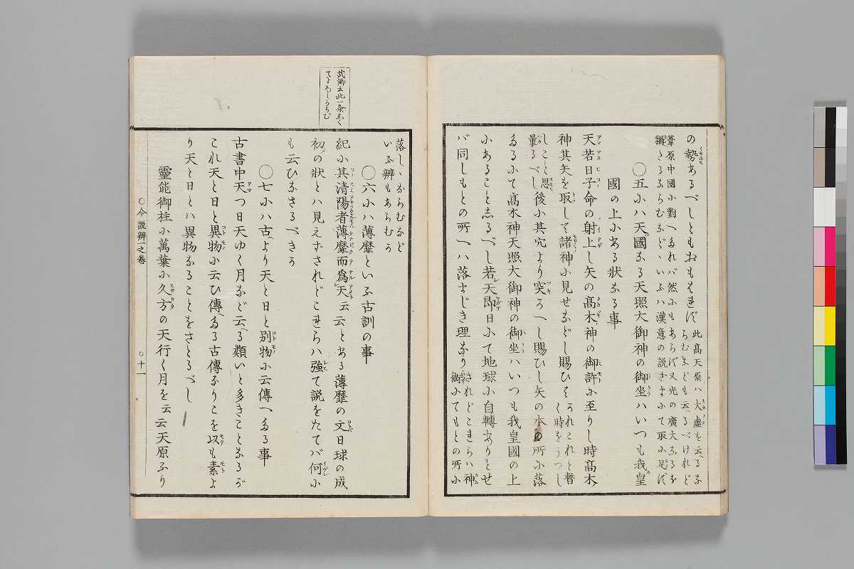 - 見返:「慶應二年丙寅中冬新刻/落合先生著/三大考后辨(今説辨/一之巻)/甲斐名取清濟拝」序:「慶應二年十一月甲斐國名取直濟」末尾:「慶應元乙丑年春同國篠原里新海吉哉が家に/清書す同二丙寅年十月多豆の舎に再清書す/落合直澄」
