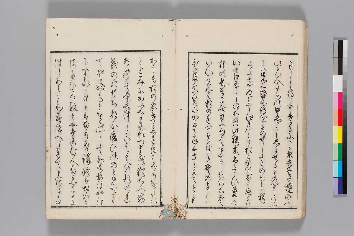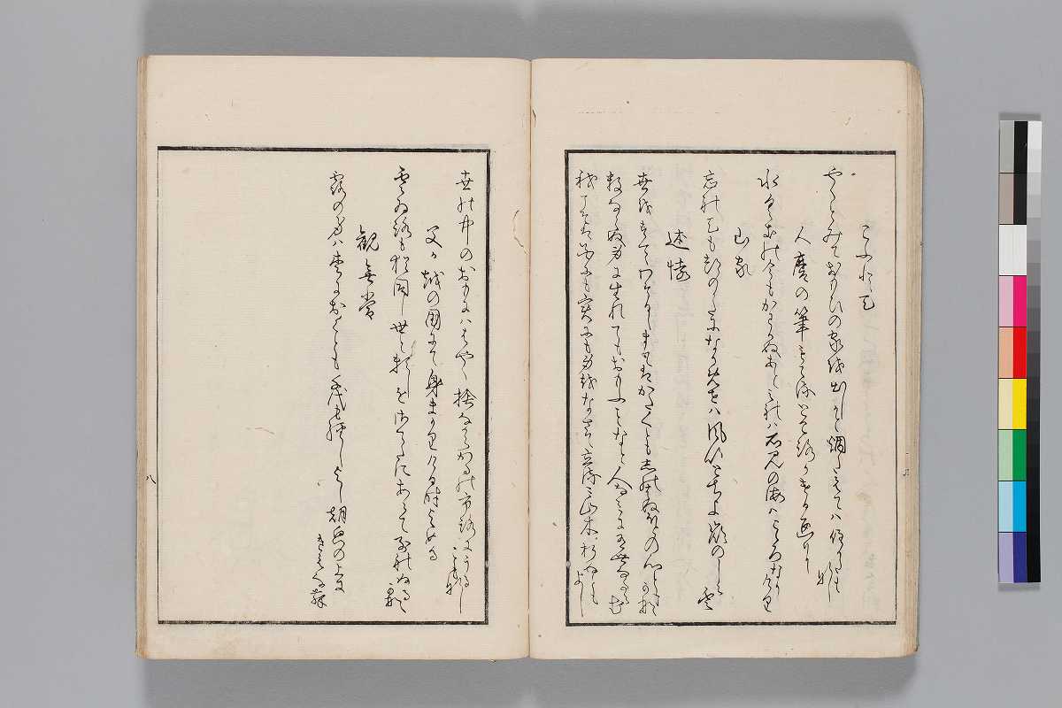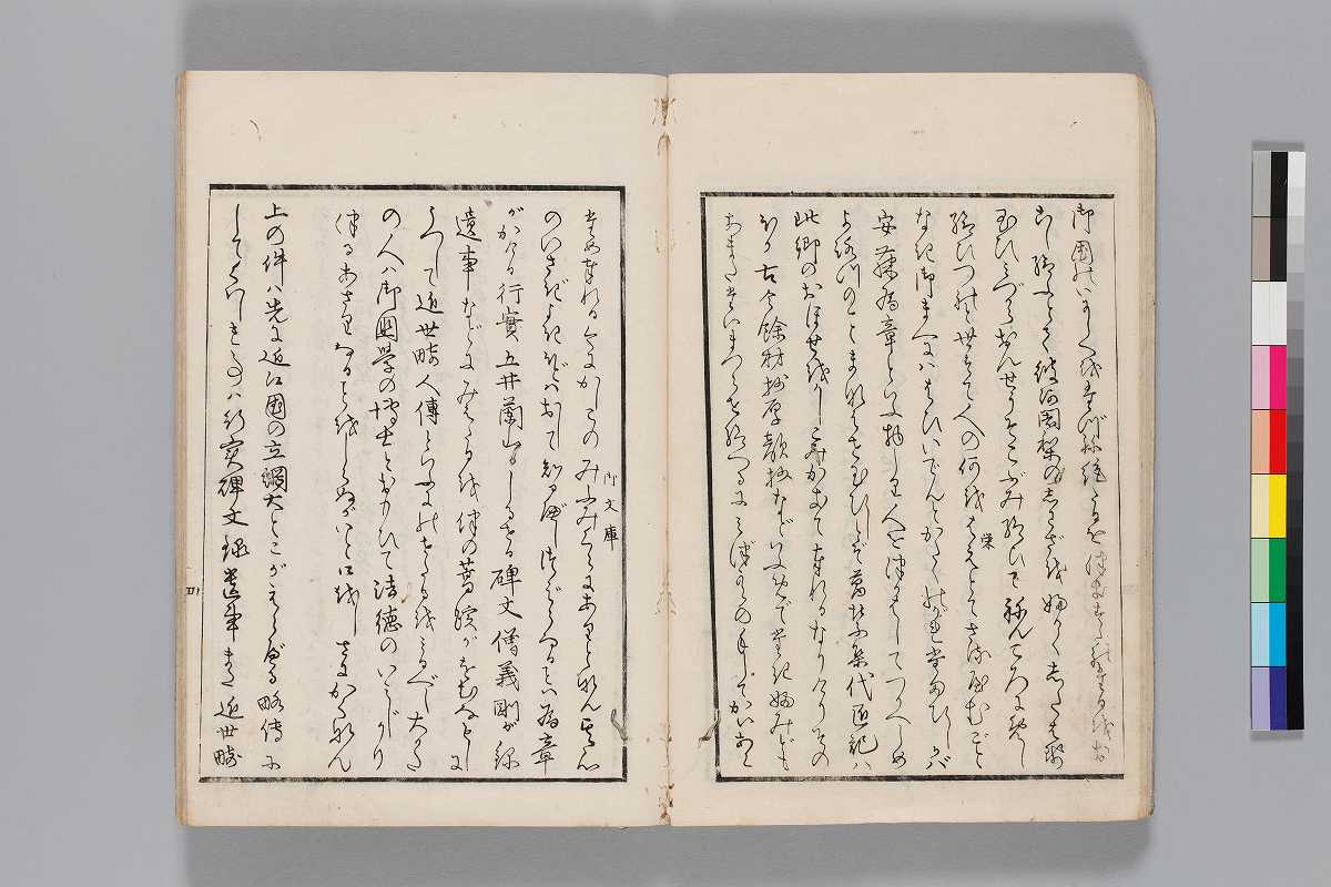 - 序:「天保辛夘秋□重陽前一日餘に/孝經楼南窓下/學半山本信錫撰」「天保三年閏十一月五日五十翁平小山田与清」「文政十一年といふとしの/夘月睦堂江澤講修」跋:「文政十一年といふとし/の神無月能美賀年の山人/桜廼屋白井信常」奥附:「天保二年辛夘九月/江戸書林英大助/北島順四郎/前川彌兵衞」印記:「生田家藏書印」