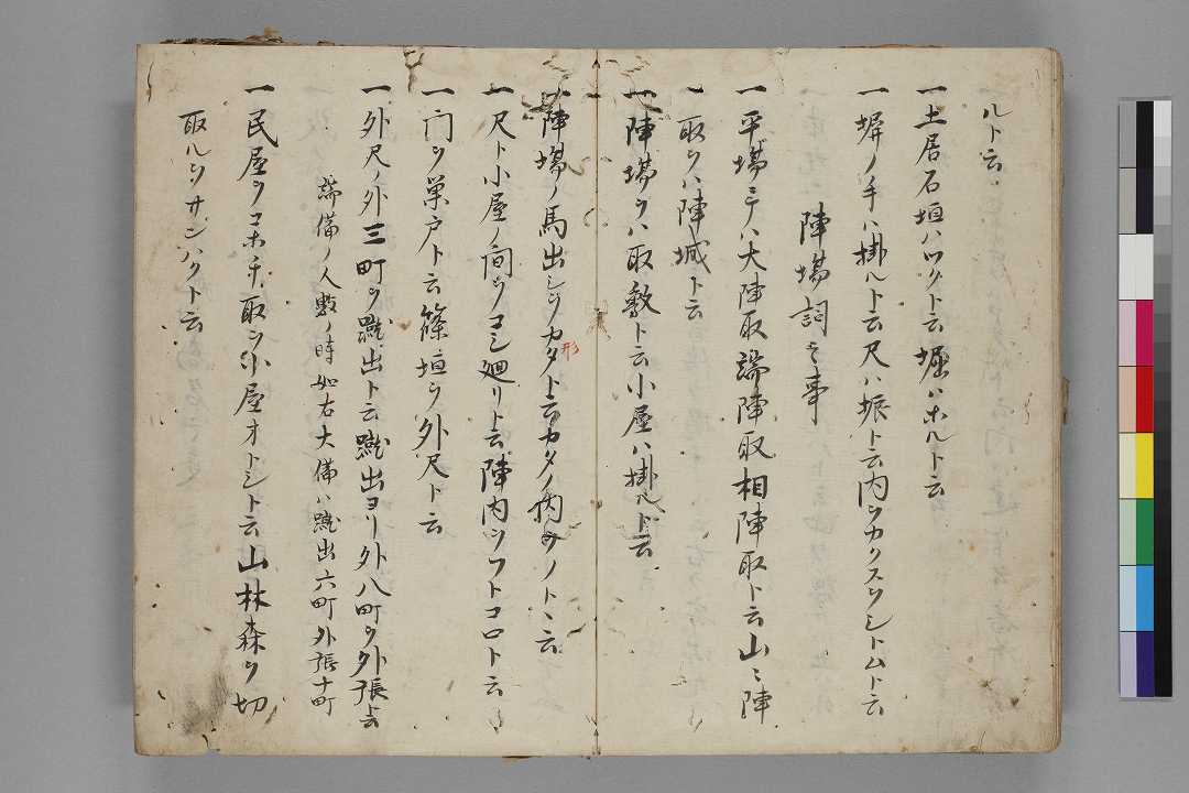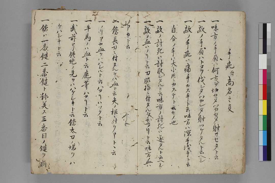 - 奥書:「右此一冊者帯勤命鎮西え下向之御方/因懇望而古来名将□[虫損]御詮議考先弼/遺訓書□之者也努々他見不可有也仍/如件/天和二(壬/戌)暦/九月下旬要門末守亭政豪弼/朝倉小軒入道景実」