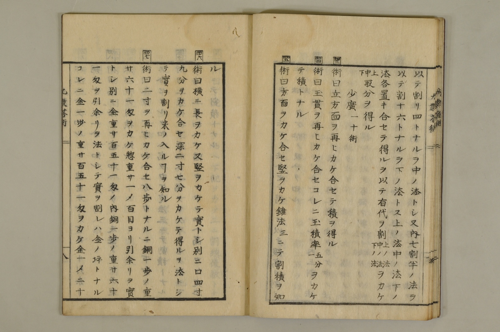 - 見返:「文政甲申新刻/九數答術/渾沌齋藏板」巻尾:「渾沌齋門人/(佐藤祐之/永井清包)校訂」巻末出版広告:「渾沌齋著述藏書/仙臺國分町十九軒高橋屋忠吉梓」