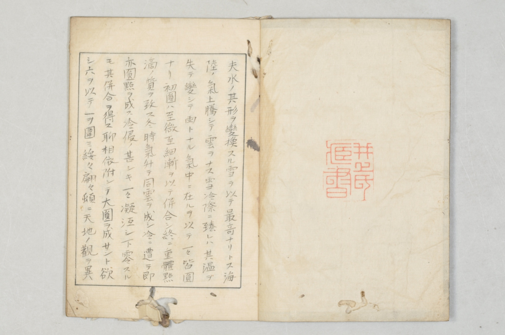 - 本文末:「壬辰夏六月許鹿源利位述」跋:「天保三年龍集壬辰秋七月翠藍柱國寧謹撰」奥書:「天保十年己亥三月八日請片山先醒而臨寫焉/井上湛(印)」印記:「井上氏藏書」