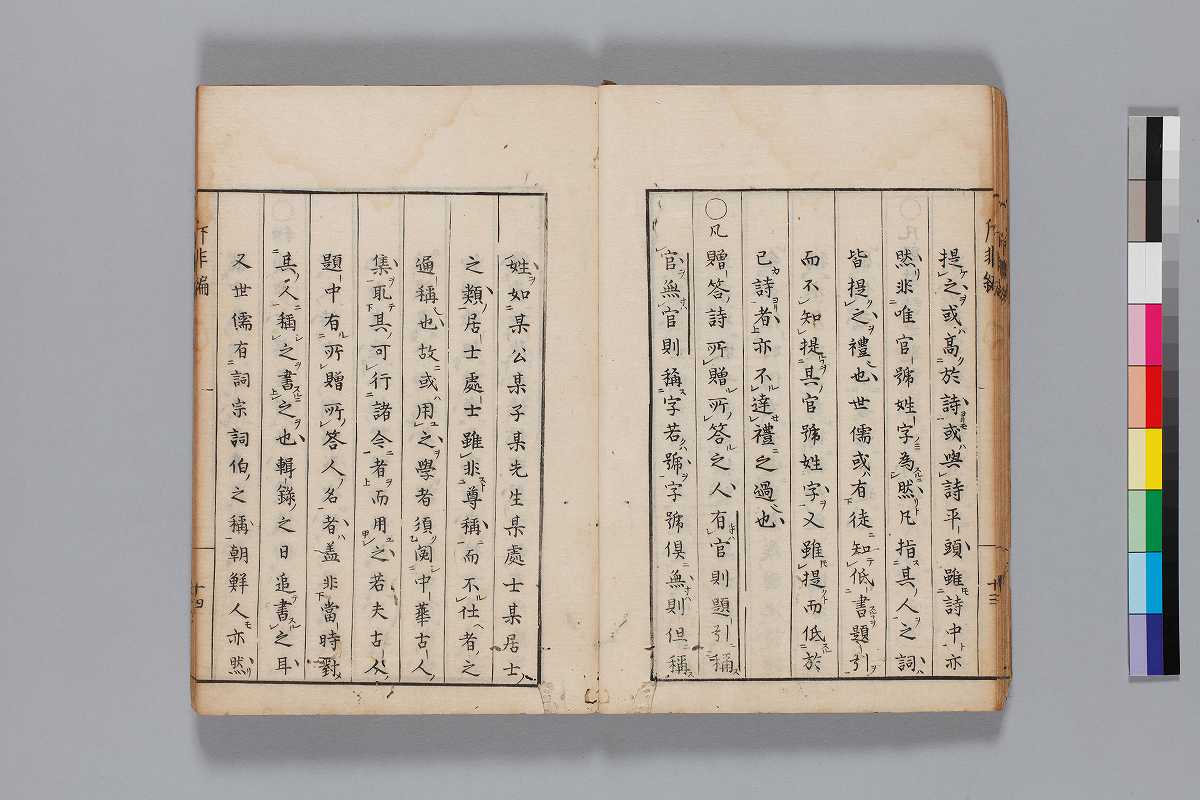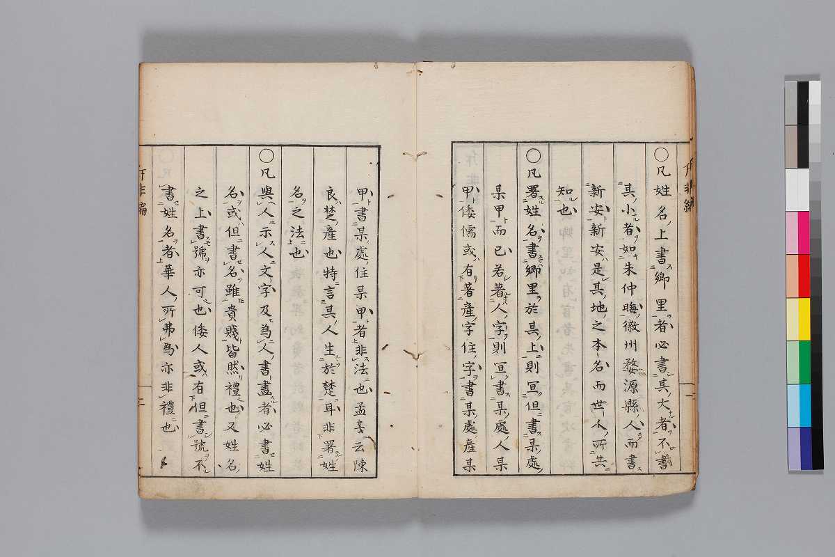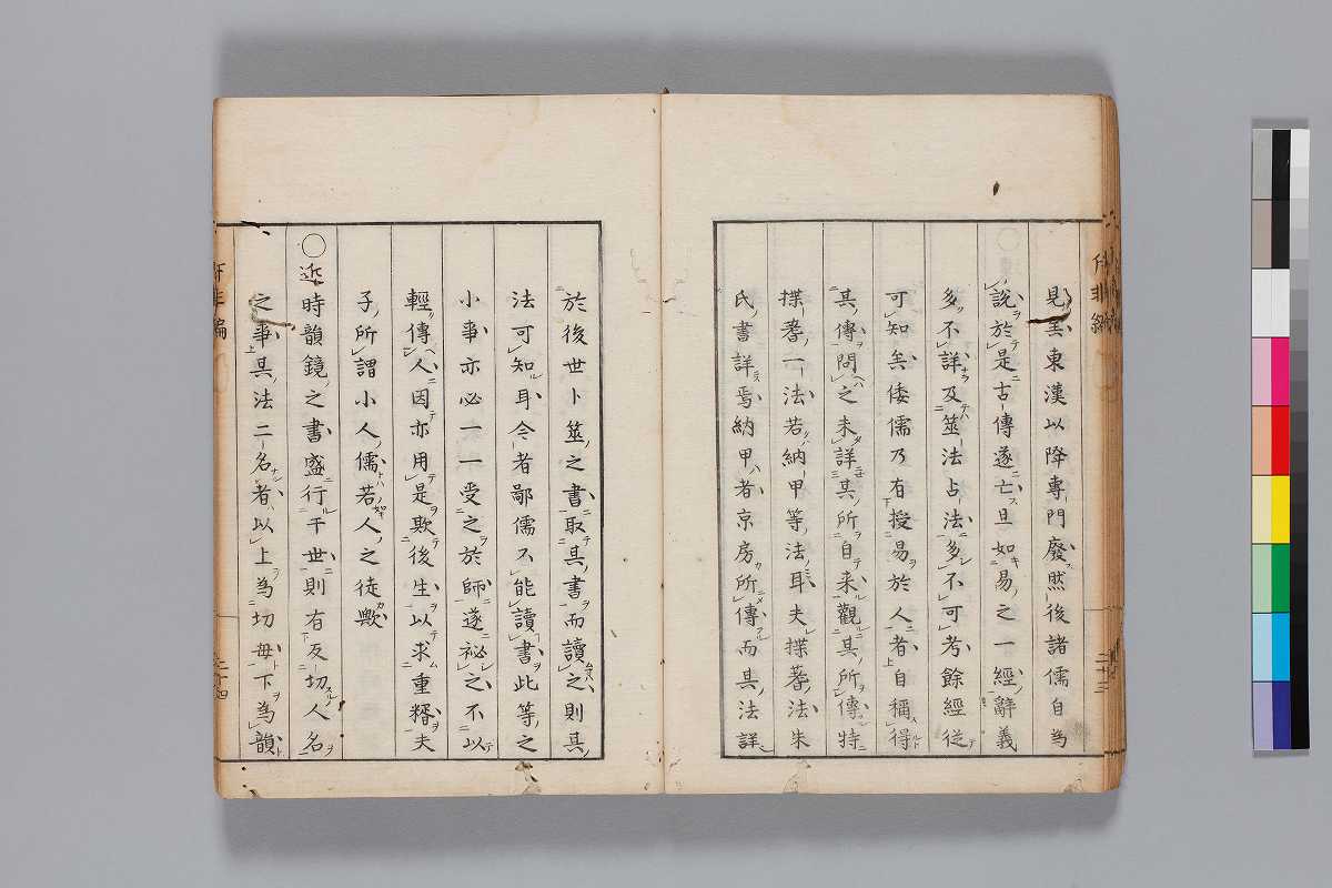 - 見返:「春臺先生著(千里必究/不許翻刻)/斥非編/浪華書肆菅生堂梓行〔版元印あり〕」序:「延享改元春三月/林義郷題」奥附:「延享元年甲子秋八月卯行成/浪華書肆河内屋宇兵衞壽梓」