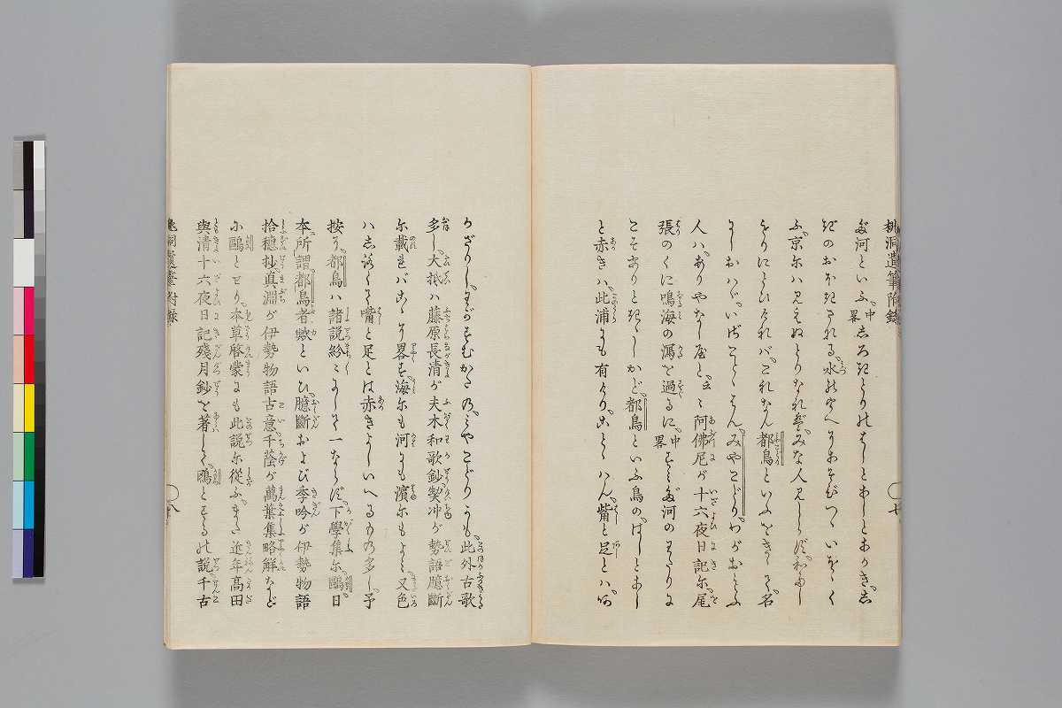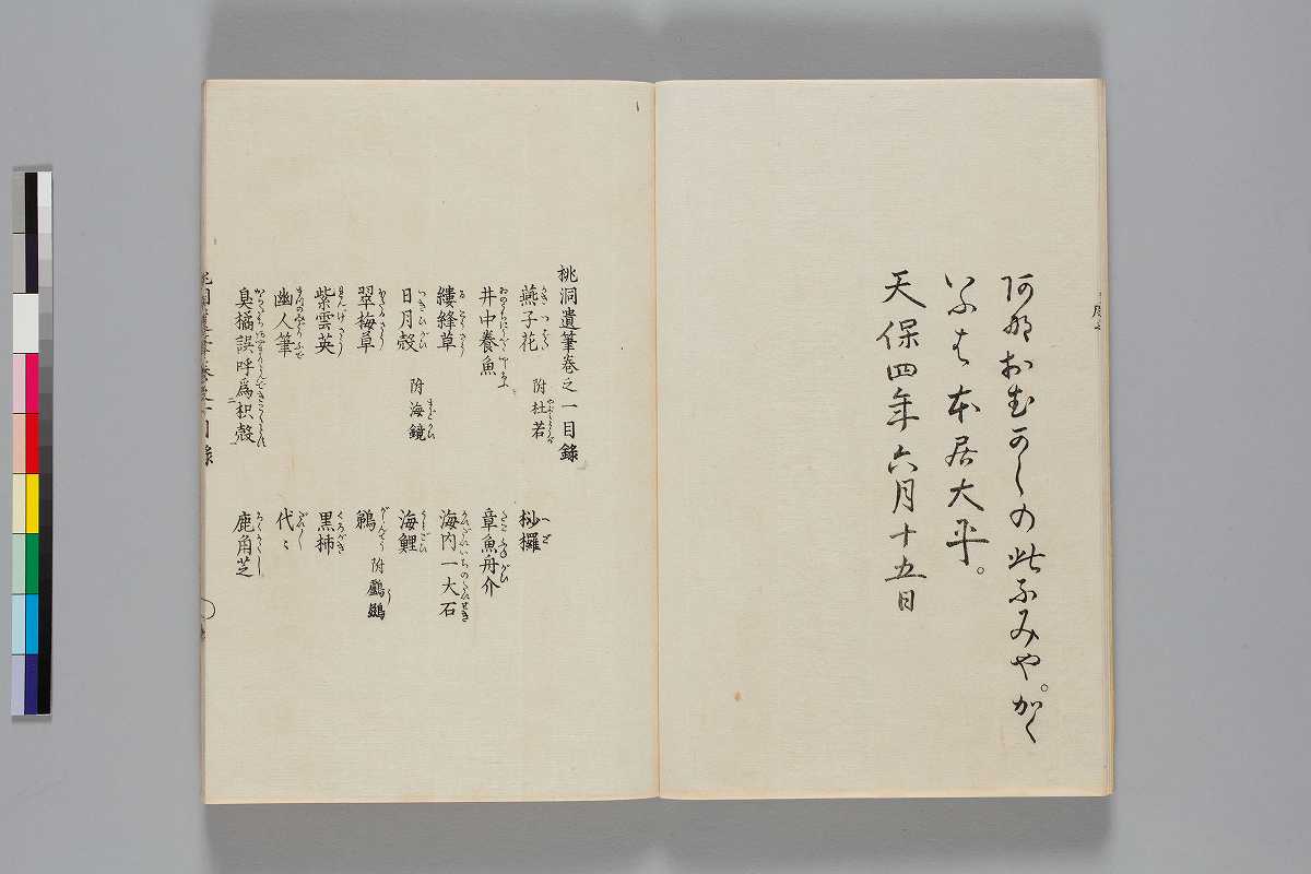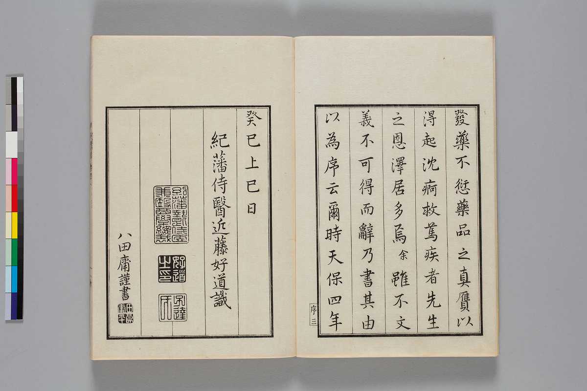 - 序:「時天保四年/癸巳上巳日/紀藩侍醫近藤好道識」「本居大平/天保四年六月十五日」印記:「西荘文庫」巻之一:序4、序3、1、26丁[23丁の後に「又ノ二十三」あり]、巻之二:1、31丁[6丁の後に「又六」あり]、巻之三:1、18、13丁