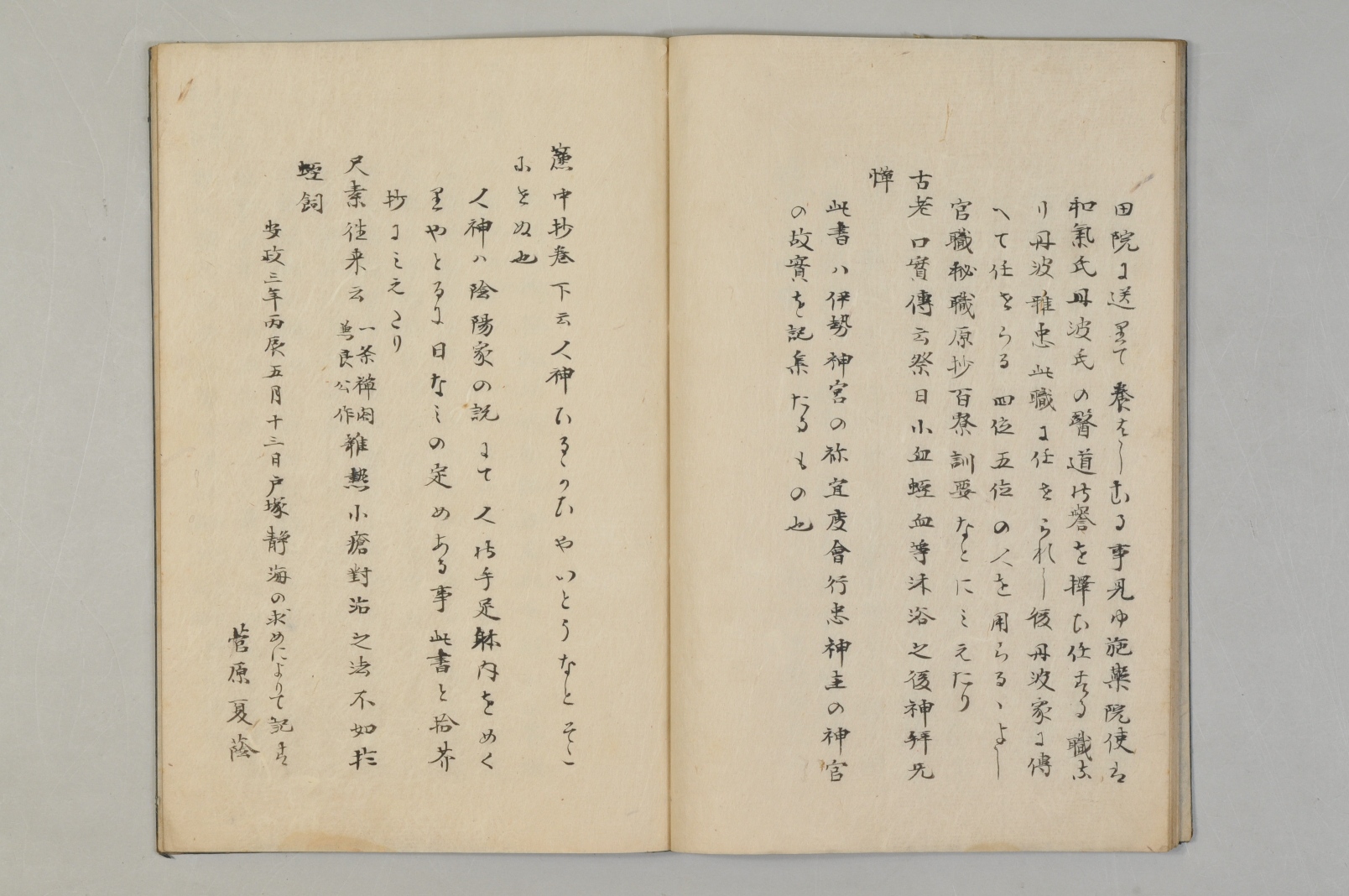 巻頭:「亡友前田夏蔭蛭飼考證」本文末尾:「况齋岡本保孝」追加一條の末尾:「孝又識」岡本保孝の書入あり