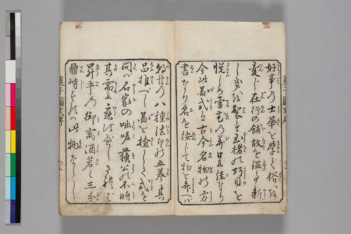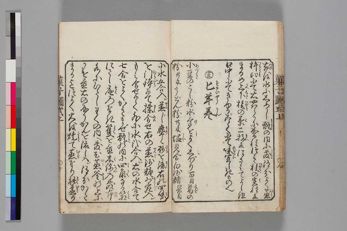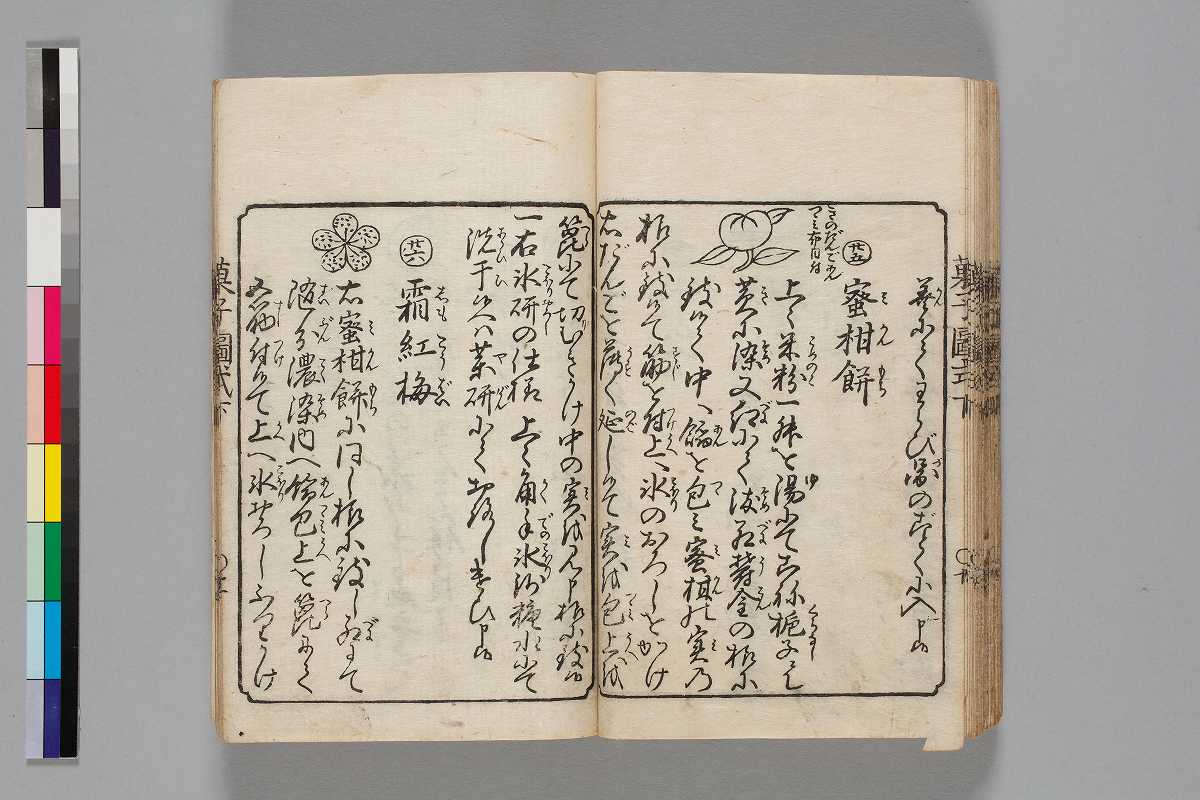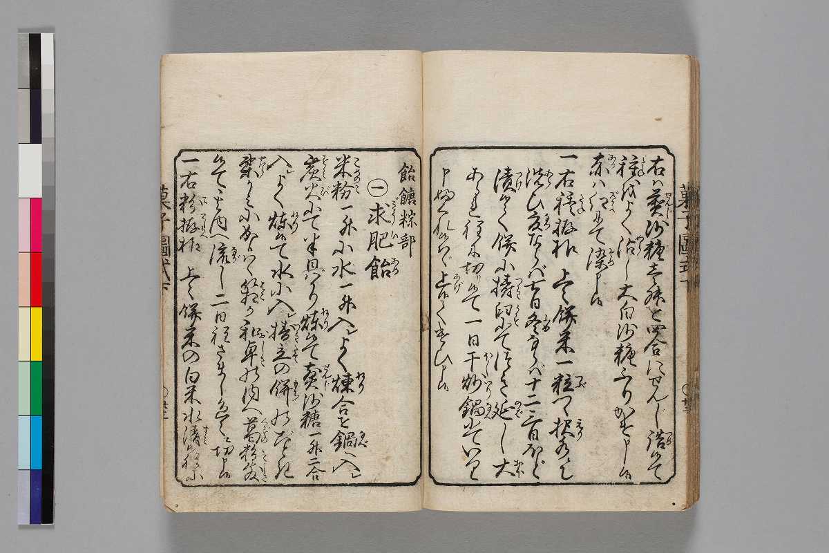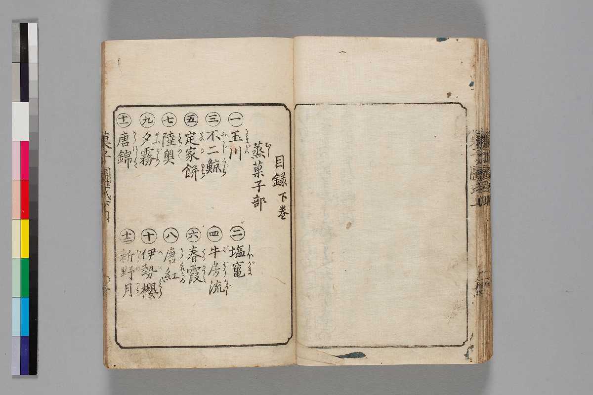 - 序題:「菓子圖式」見返:「(古今/名物)御前菓子圖式/蒸菓子/干菓子」序:「宝暦庚辰の春/洛陽長谷川良隅撰」刊記:「寳暦十一辛巳年正月大吉祥日/帝都書林寺町五條上ル町天王寺屋市郎兵衛板行」上巻:2、2、1、18丁、下巻:3、28丁