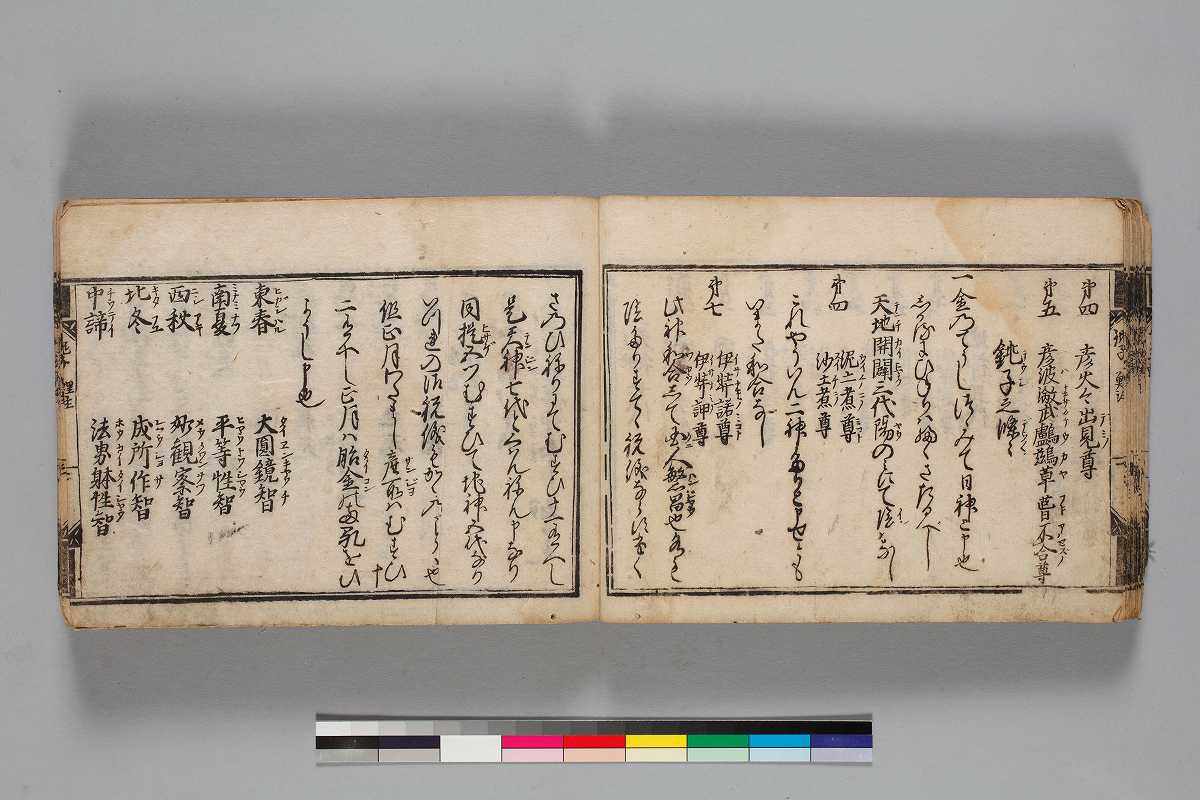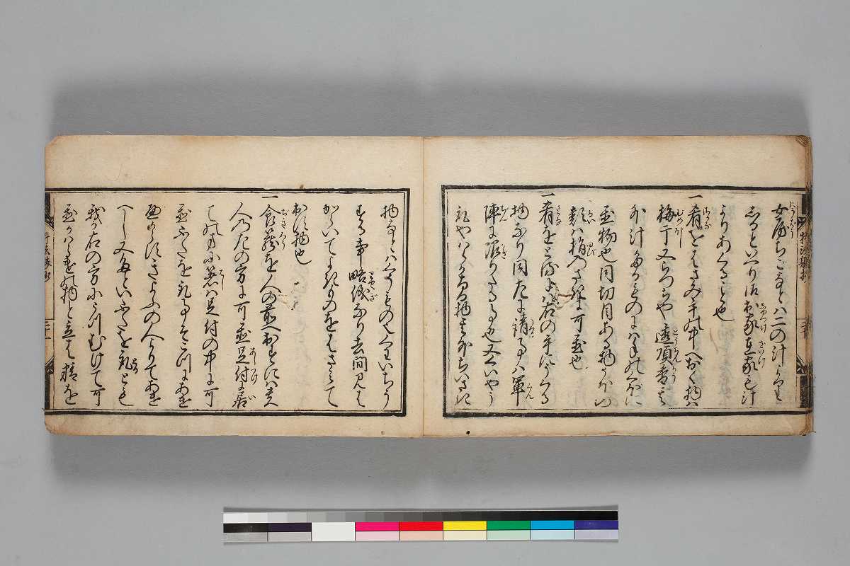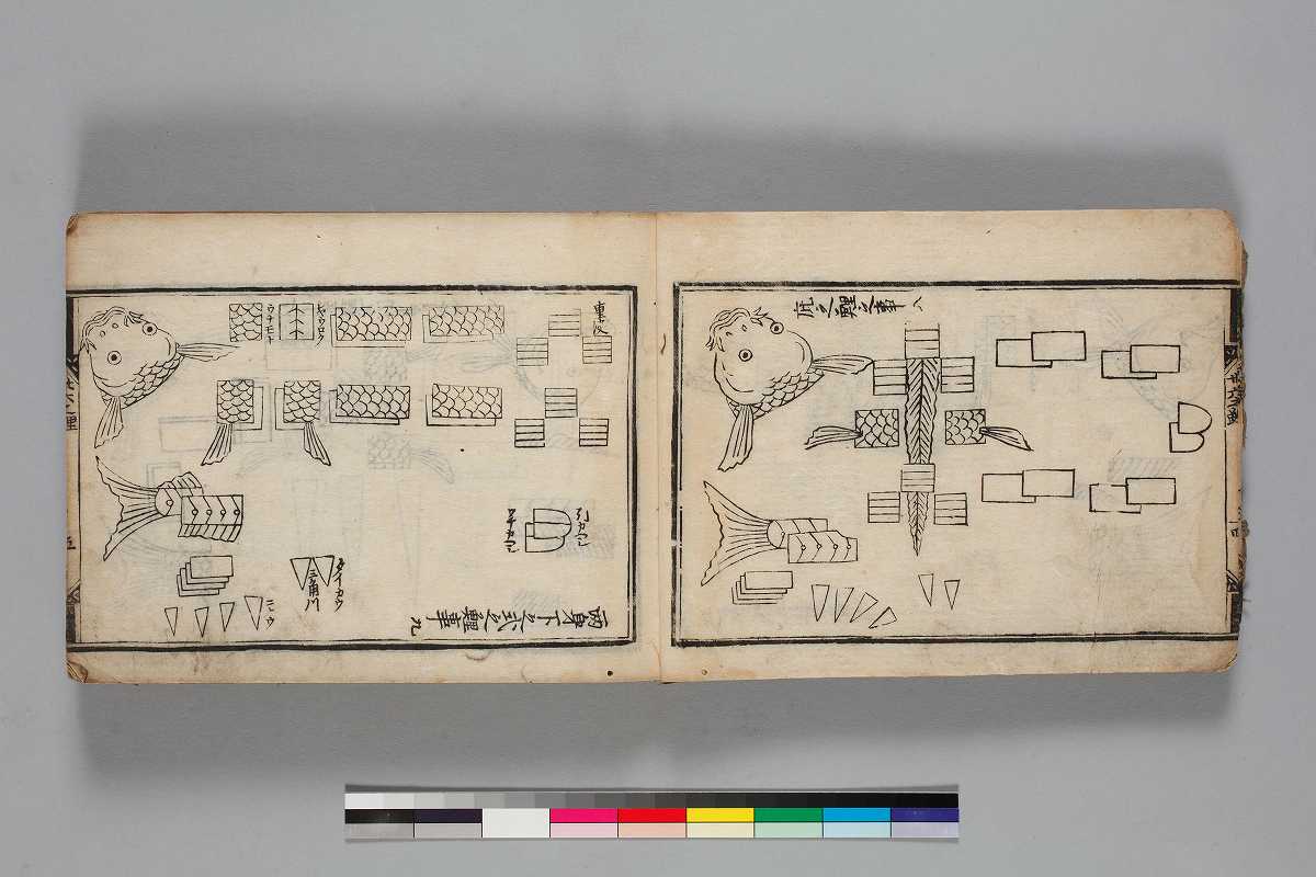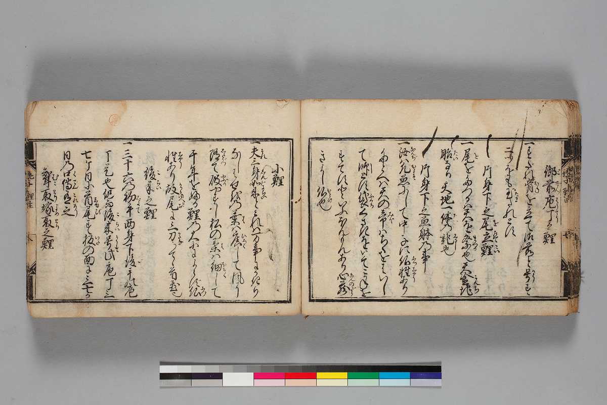 - 横本目録の版心:「鯉目録卅六ノ」前1丁‐27丁の版心:「卅六之鯉」中1丁‐11丁の版心:「銚子鯉注」後1丁‐26丁の版心:「料法躾抄」前19丁オ:「已上三拾六之鯉也/右四條家之秘傳不可有他言者也〔中略〕官営十九年/午ノ五月廿一日/中村十右衞門殿」中11丁オ:「已上三十六之鯉(但片身兩身之鯉ハ/別紙ニシテ也)右四条家秘傳也/薗部新兵衞尉/吉田五右衞門尉/薗部和泉守/羽田神右衞門尉/高橋権兵衞尉/寛永十九年/午ノ五月廿一日高橋五左衞門尉/中村十右衞門殿」