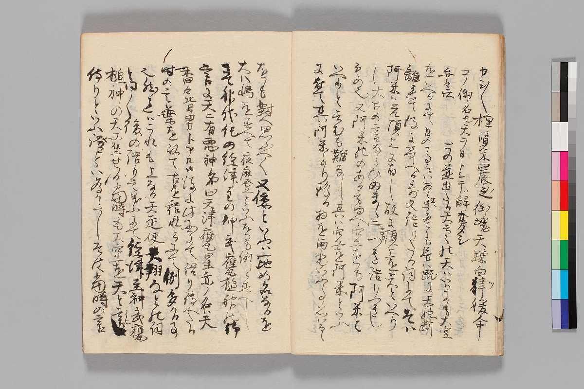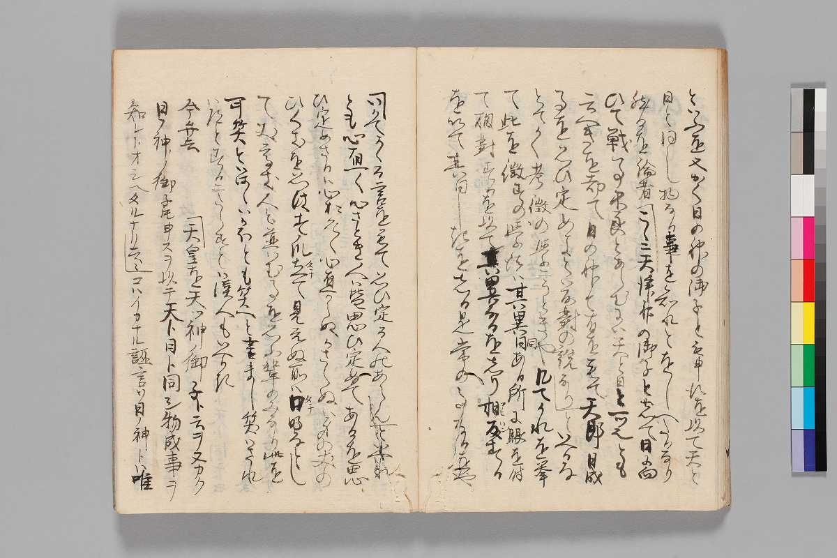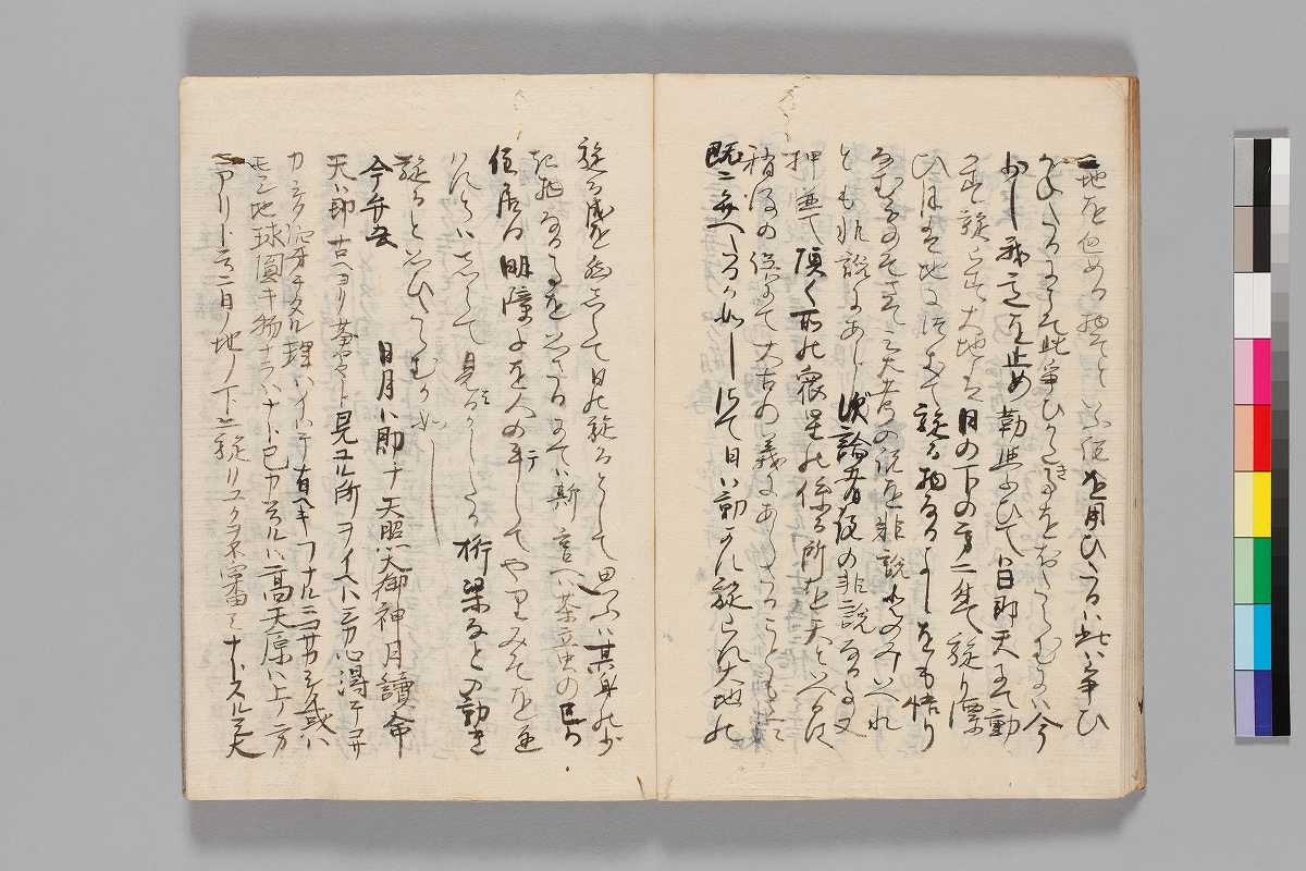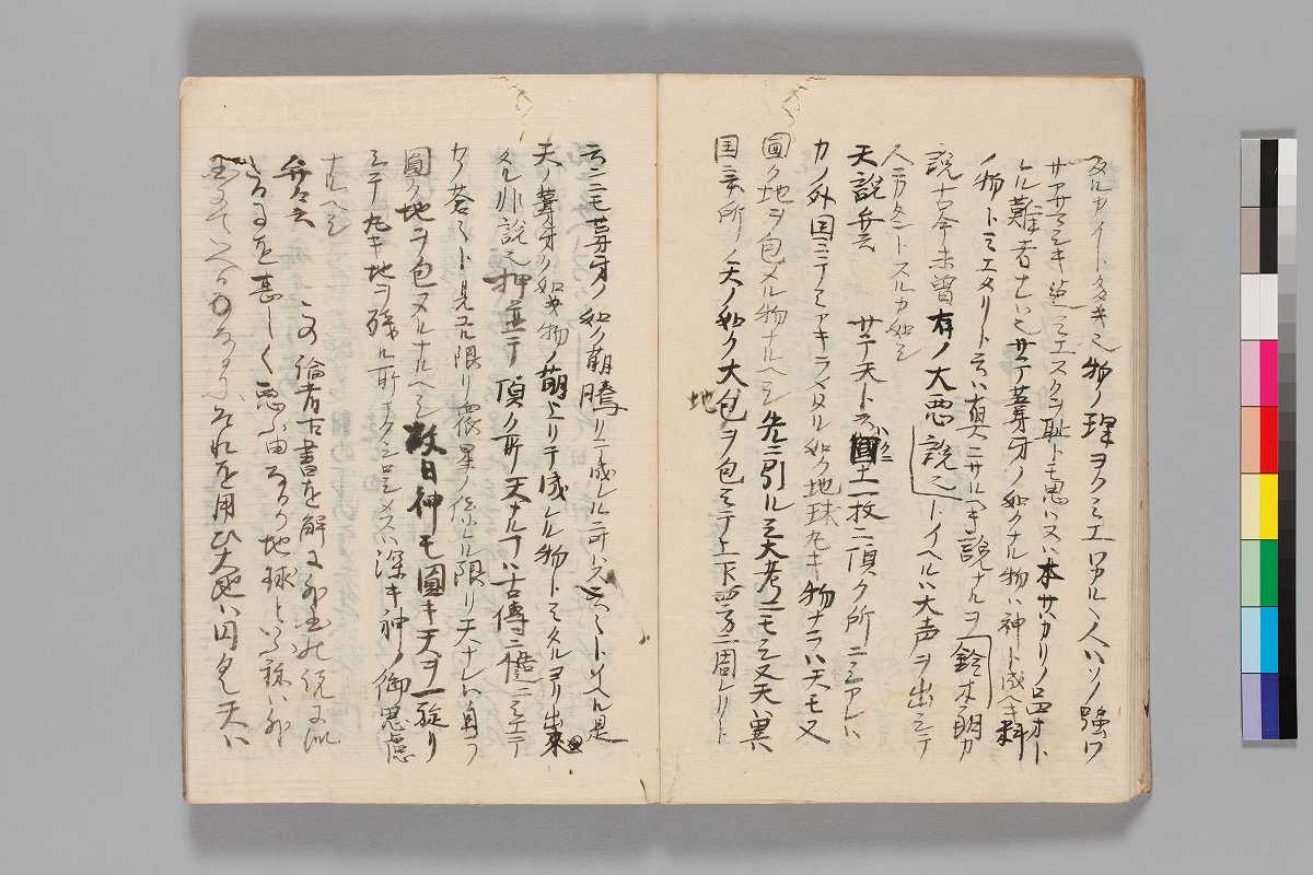 冒頭:「天説弁ニ云玉ノ真柱ニ云天日ハ高ク上ニ位ヲ定/テ動キ旋ル事ナク」奥書:「天保七年九月代吉良写/辨々之辨□」印記:「多□□舎蔵書」
