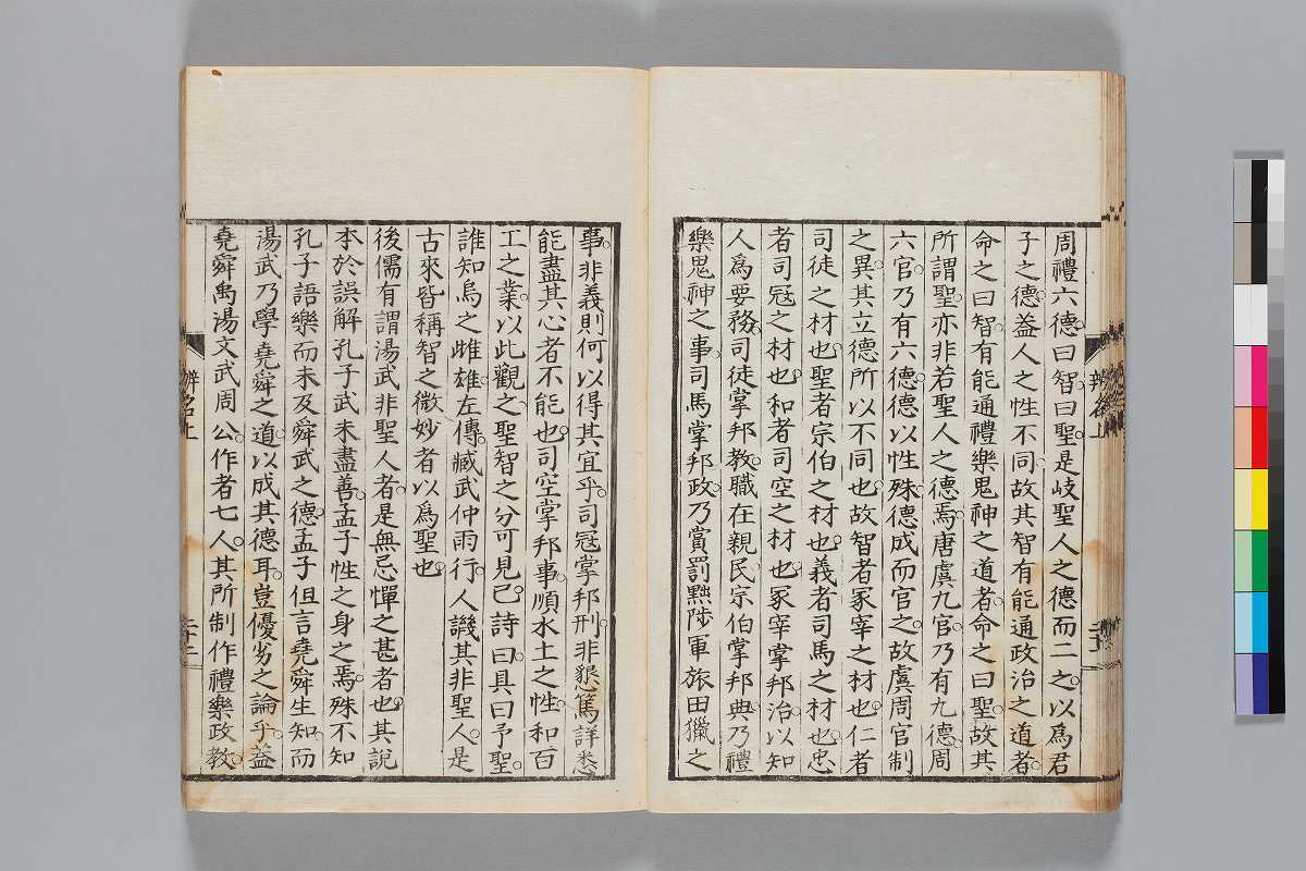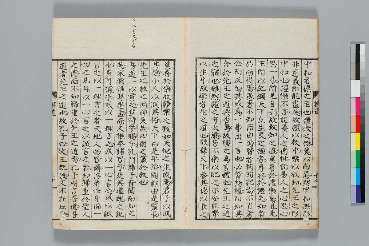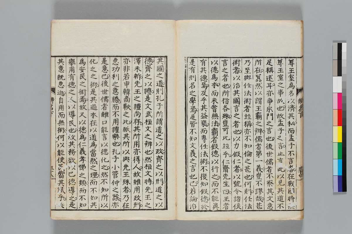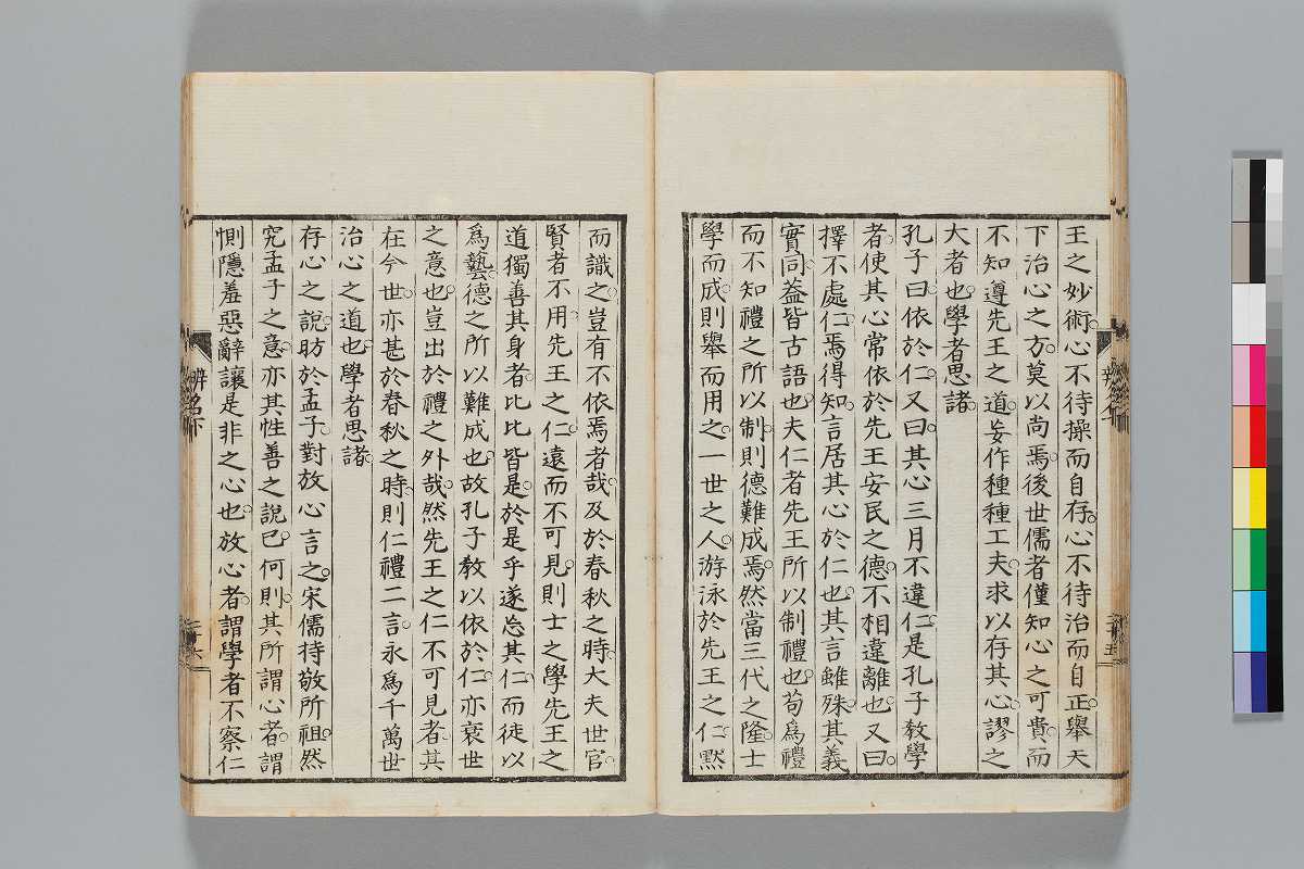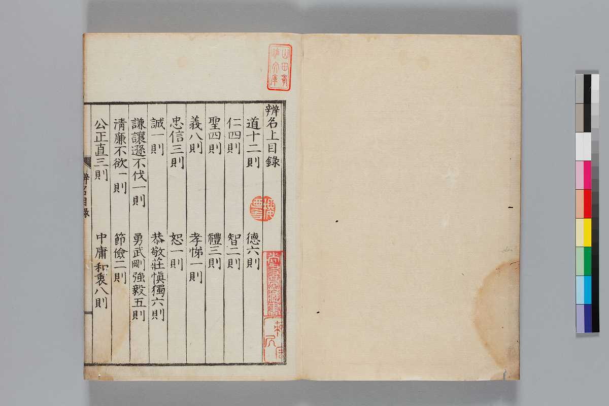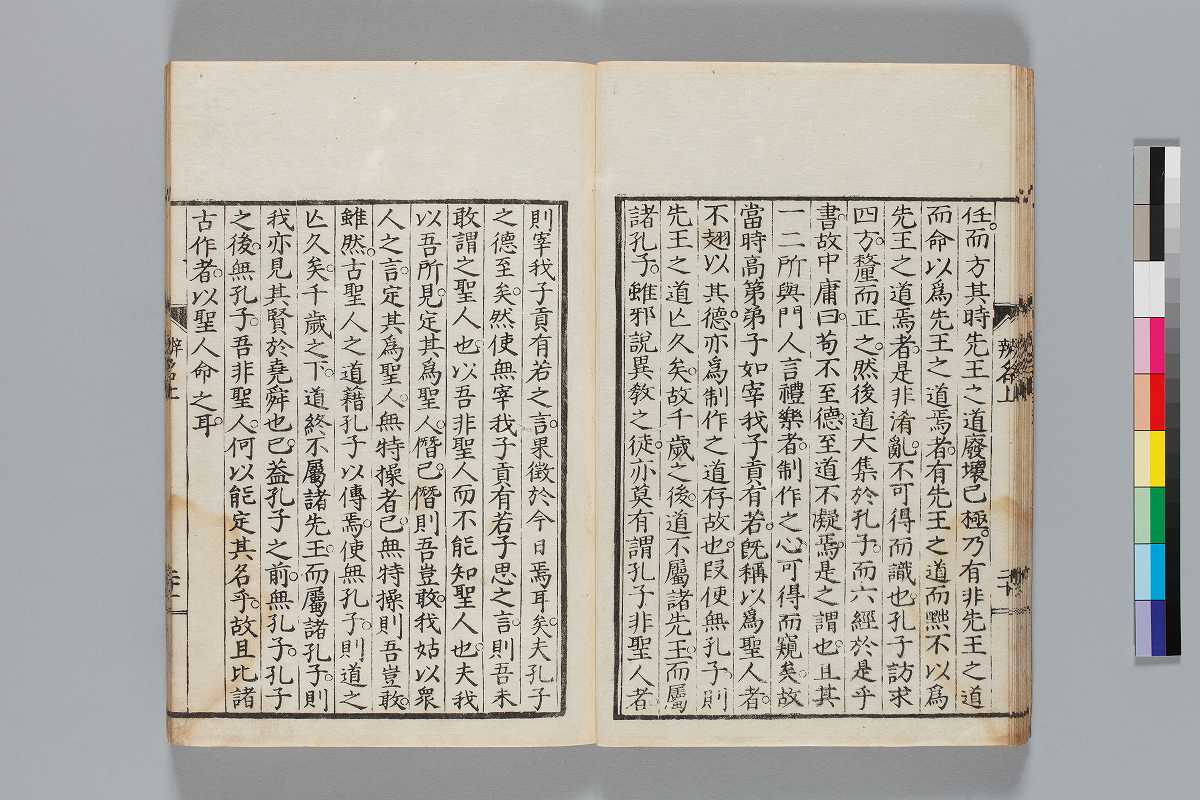 - 辨道1冊、辨名2冊「辨道」に朱・墨書込あり辨道末尾:「享保丁酉秋七月望/物茂卿」辨名下冊裏表紙見返蔵版目録:「辨道辨名(徂徠先生著/三冊)」「東都書林(松本新六/同善兵衞)」印記:「櫻廼舎」「尚友亭藏書」ほか印文未詳印1顆辨道:22丁〔23丁目は裏表紙見返に張付〕、辨名上:1、61丁、辨名下:58丁