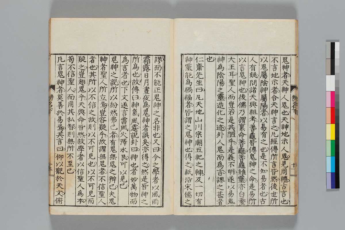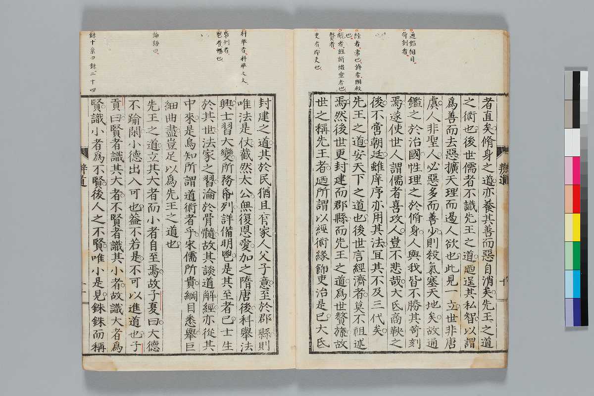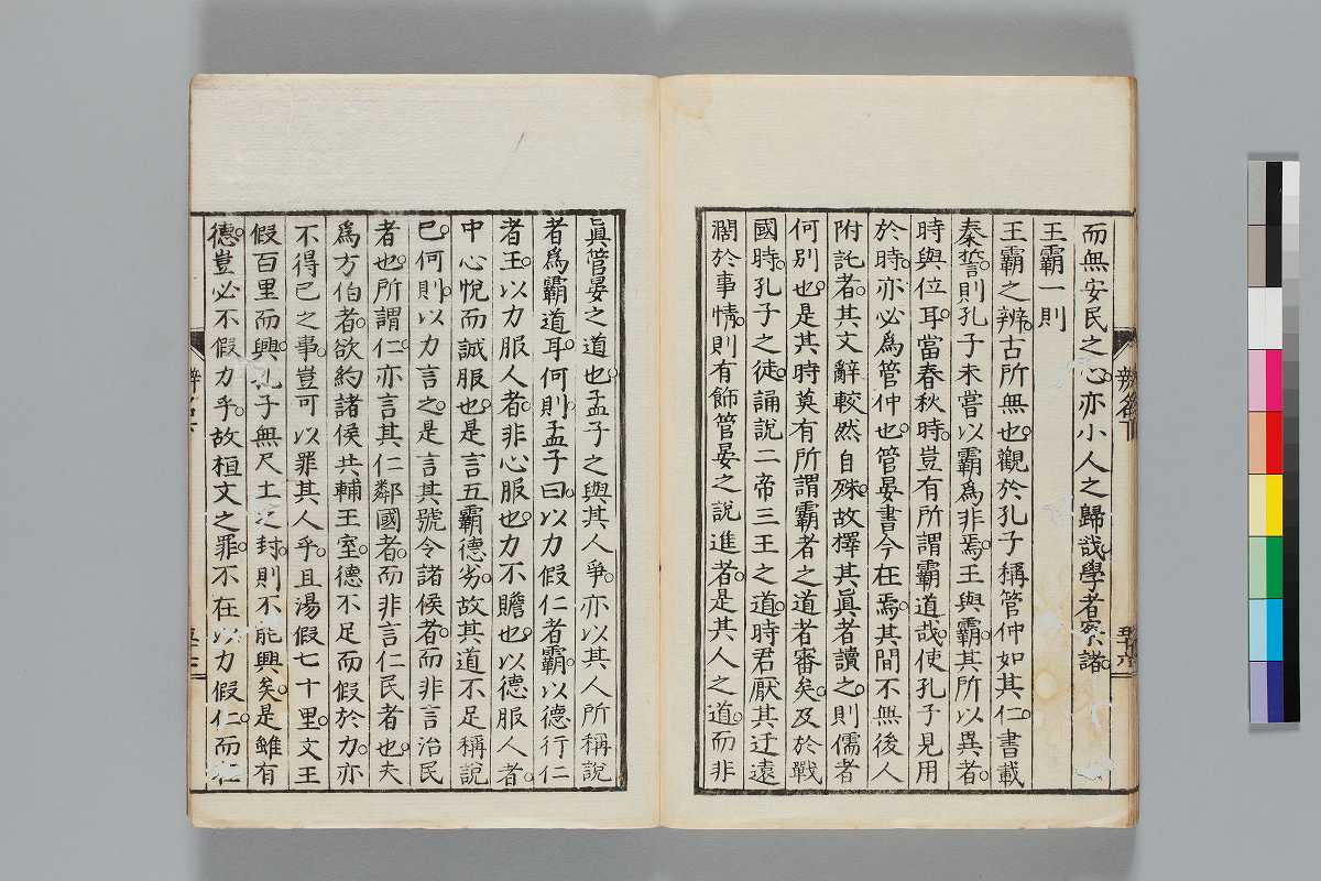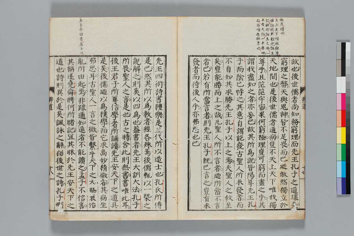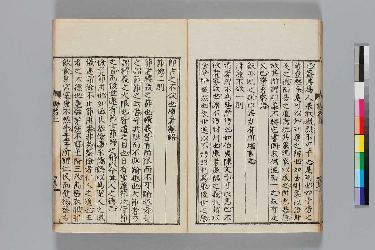 - 辨道1冊、辨名2冊「辨道」に朱・墨書込あり辨道末尾:「享保丁酉秋七月望/物茂卿」辨名下冊裏表紙見返蔵版目録:「辨道辨名(徂徠先生著/三冊)」「東都書林(松本新六/同善兵衞)」印記:「櫻廼舎」「尚友亭藏書」ほか印文未詳印1顆辨道:22丁〔23丁目は裏表紙見返に張付〕、辨名上:1、61丁、辨名下:58丁