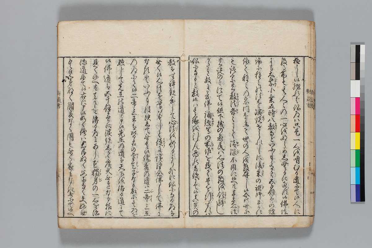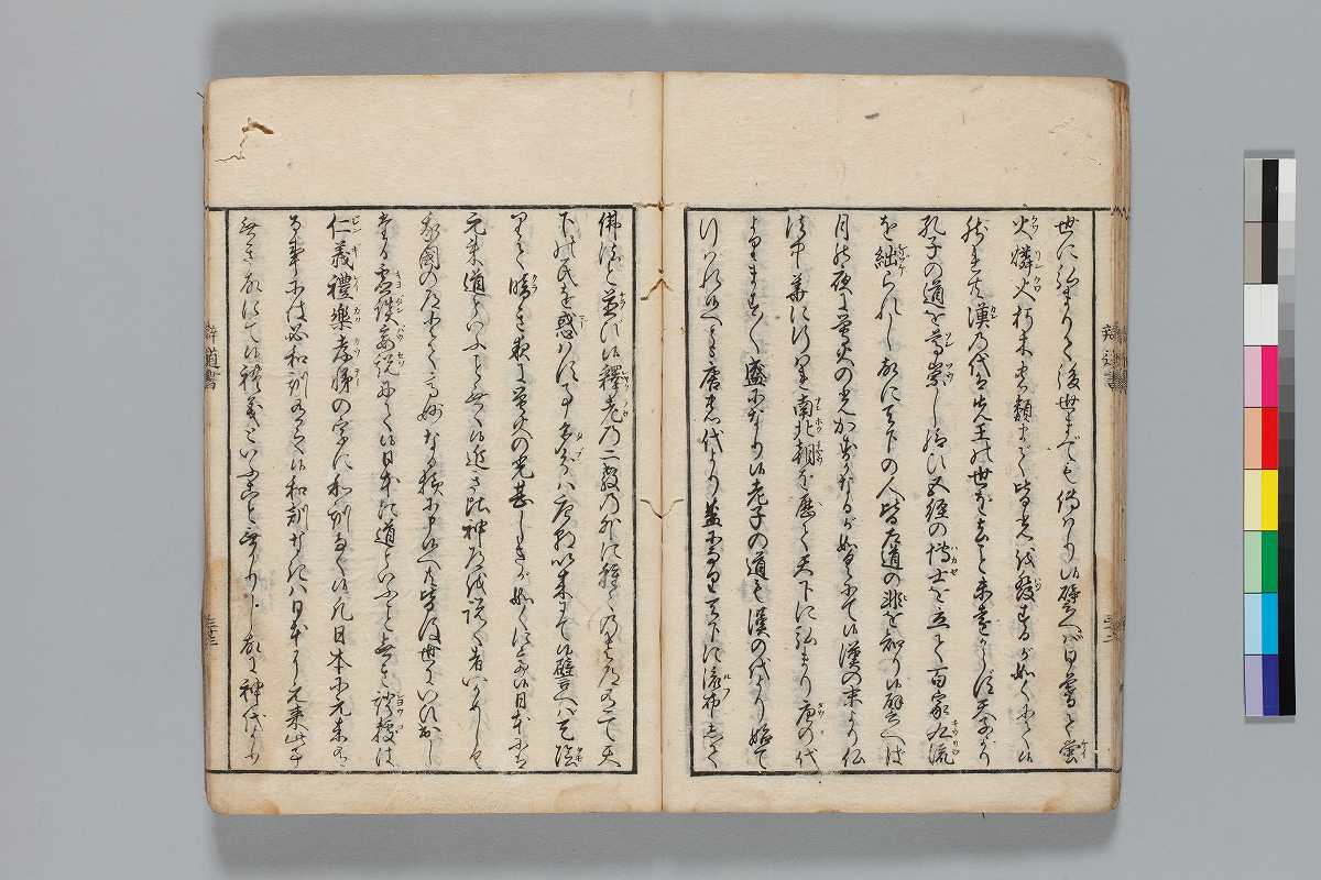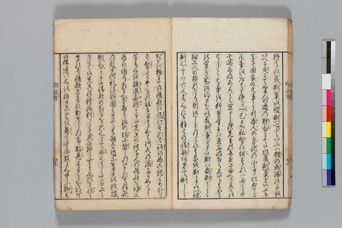 - 見返:「春臺先生撰/辯道書/江都書肆嵩山房開板〔魁星印あり〕」跋:「享保乙卯復月下浣/大泉莊内水野元朗書于東都神門邸」奥附:「右辯道書は太宰弥右衛門撰にて御座候/追付聖学問答も板行仕候/享保二十年乙卯十一月冬至日/江都書肆嵩山房/須原屋新兵衞開板」印記:「永井藏書」