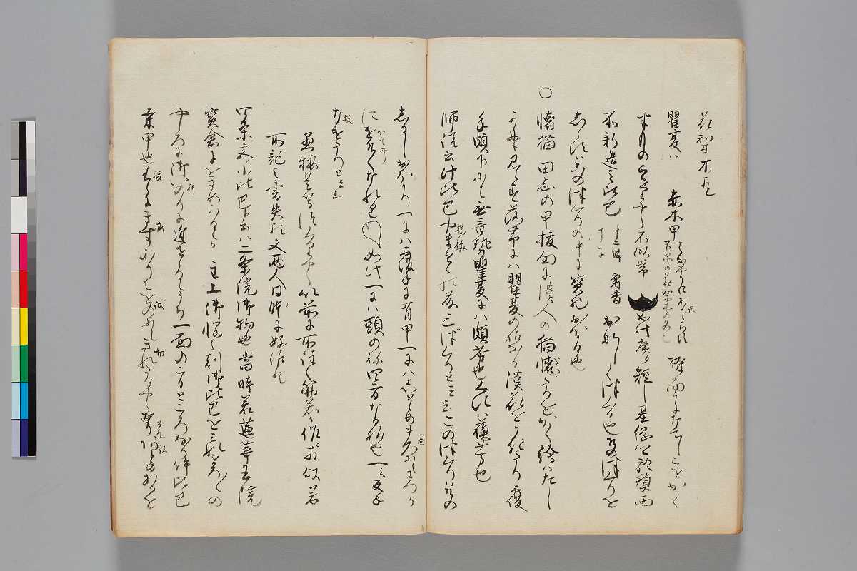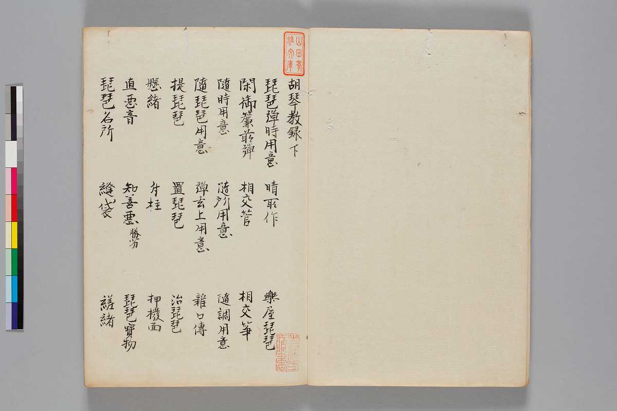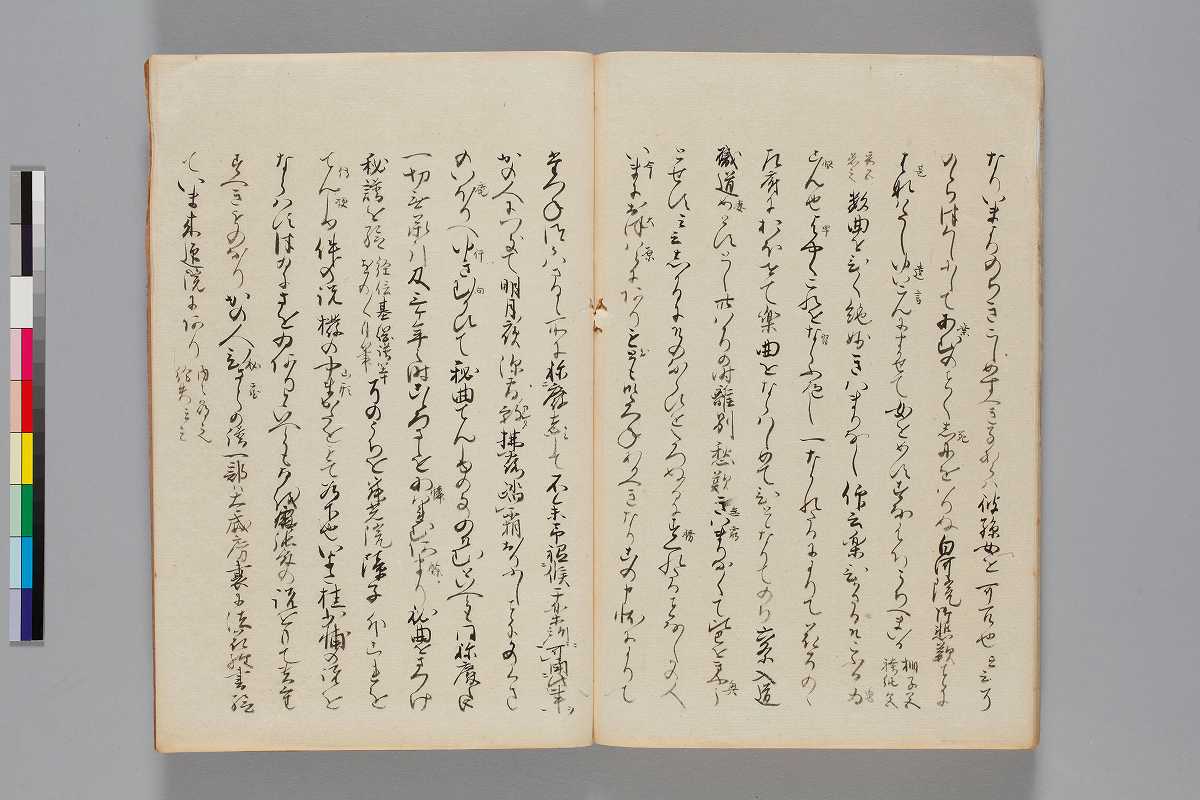 - 朱墨書入あり奥書:「以左近大夫将監中原光氏之秘本/令書写之秘書之間荒凉之人/有其憚仍以女性令書之間僻/字等多得其意追可書改之/左近少将」挟込み紙片:「此ヶ条師説ノ曰ト書出シテ其人ハ則/有安ナリ然レハ此書ハ有安ノ門人ノ/所作歟/大膳大夫/有安ハ後白河之院法住寺殿/御篭居ノトキ伺公シテ笛吹キ/王品讀誦シタル人ナリ時代モ/相當スルナリ」[朱書]印記:「生駒氏藏書」上:44丁、下:38丁
