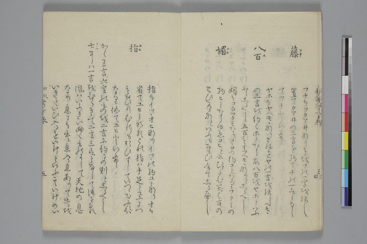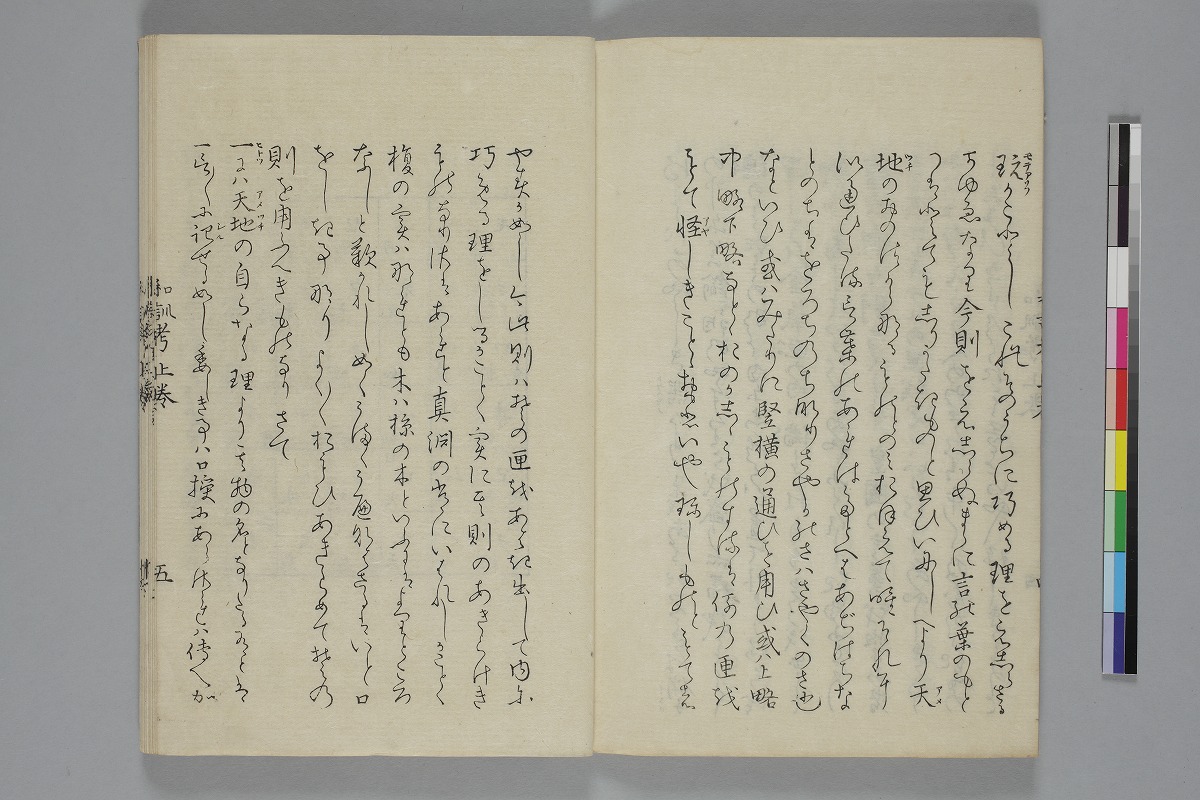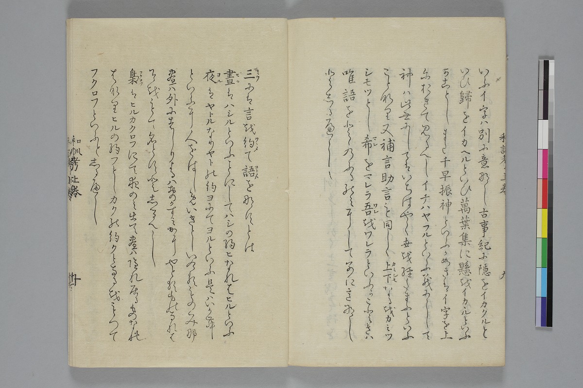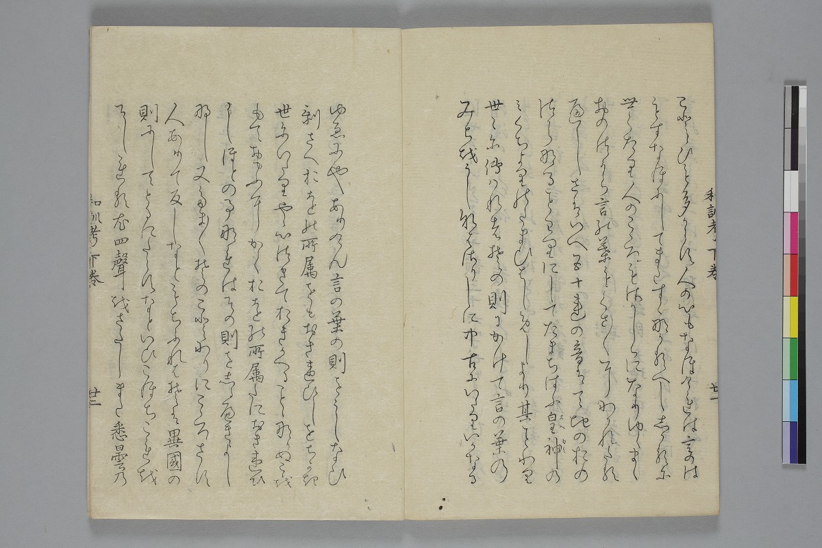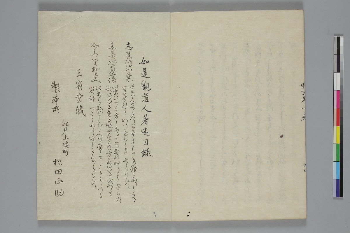 - 裏表紙見返:「如是觀道人著述目録/〔中略〕三省堂蔵/製本所江戸上槙町松田正助」序:「文政九年丙戌臘月/烏山勝忠成」上巻:序2、序3、1、8、16丁、下巻:24丁