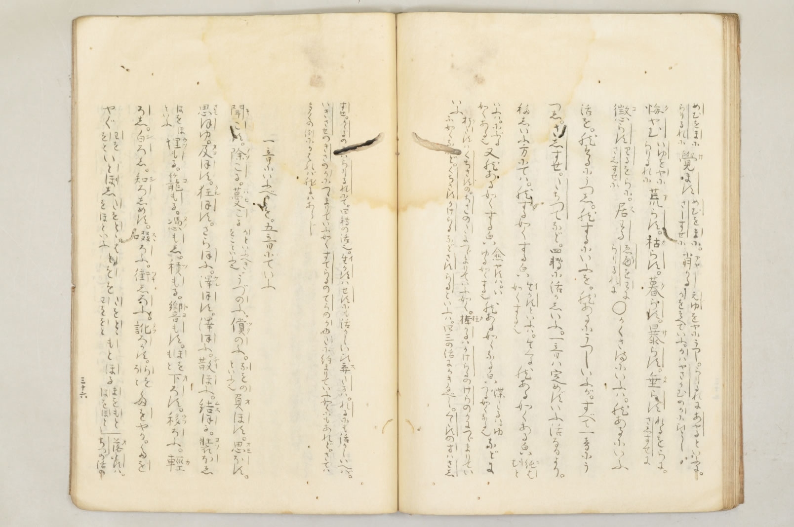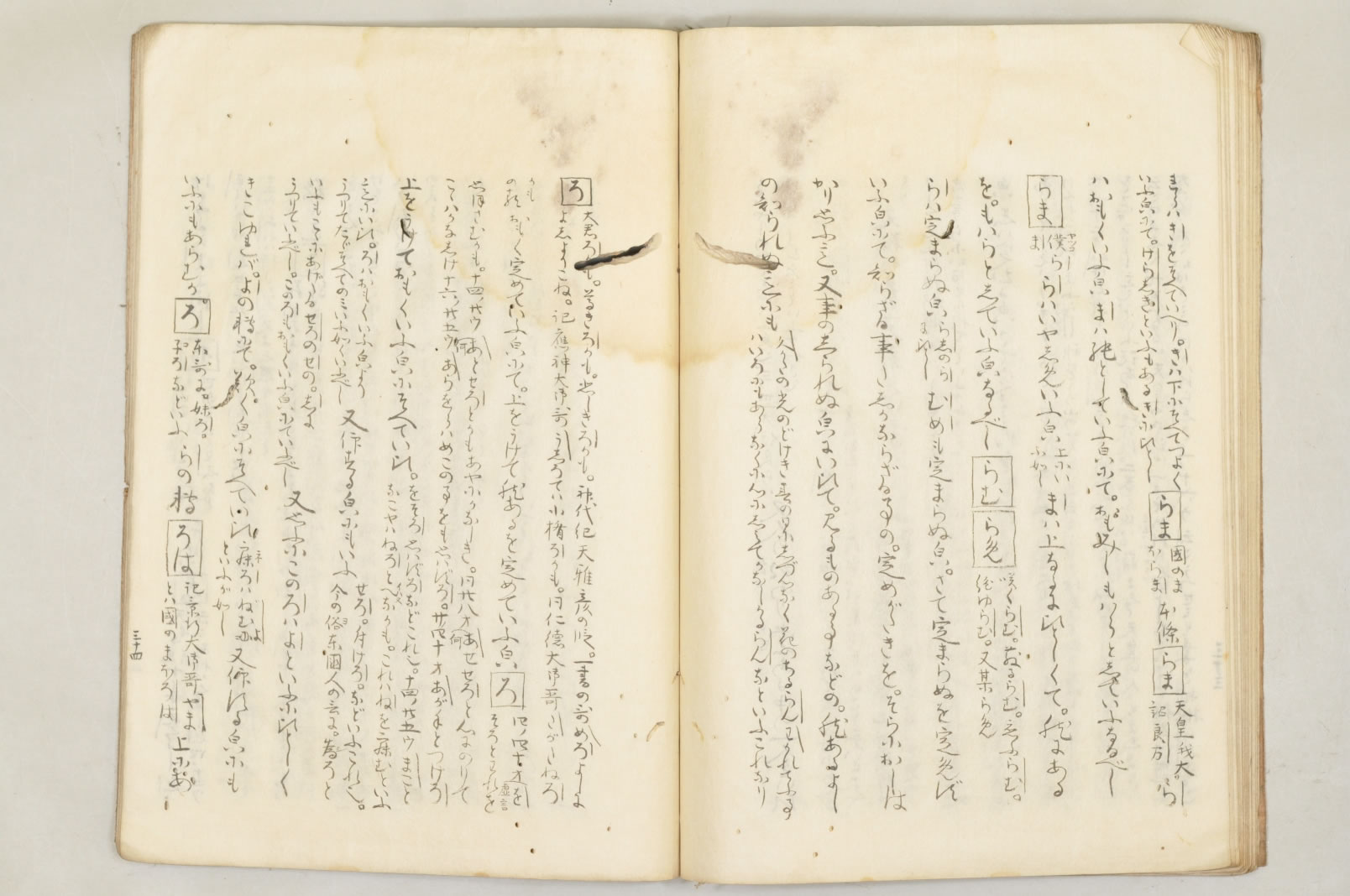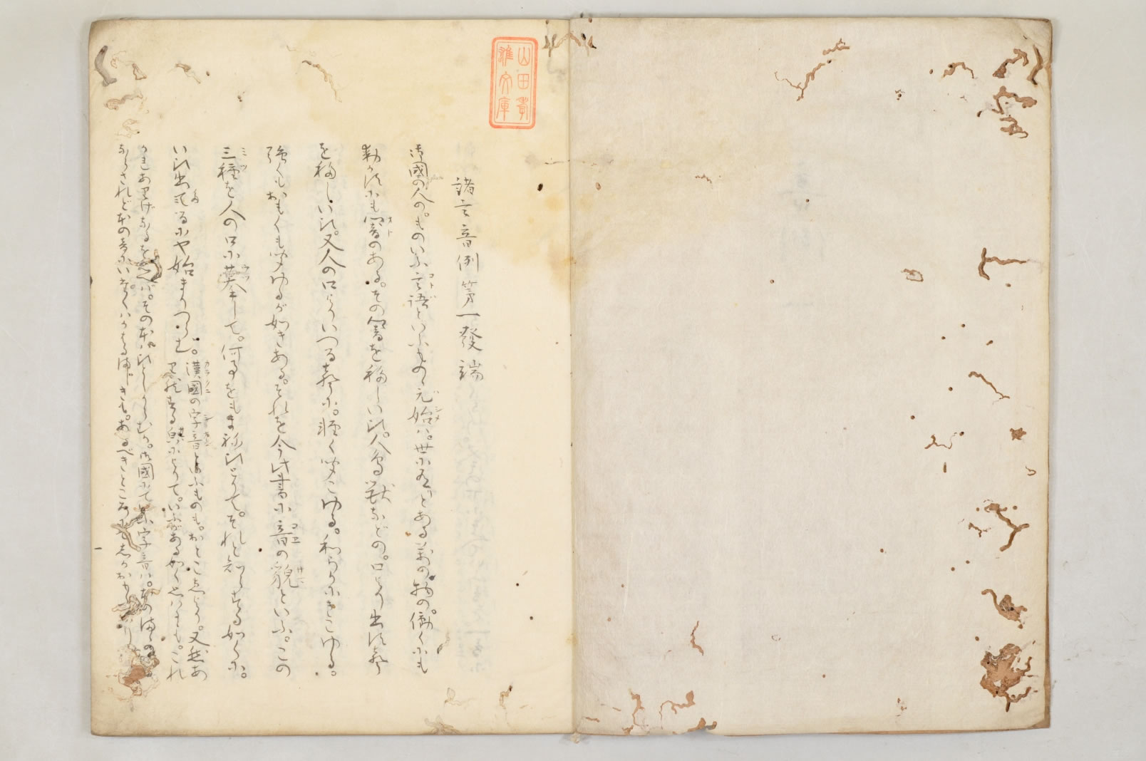 - 零本発端の末:「よくみむ人よく見てよ東家主人守訓」内容:諸言音例第一発端、音のさま大かた、五位の音のさま、はたらき辞、せすとれるとのひとくさの活、體言、てにをは、類例、一音にいふべきを五音にていふ、二音を四音にうつしいふ、はの行まの行音を通はしいふ、〔ほか〕