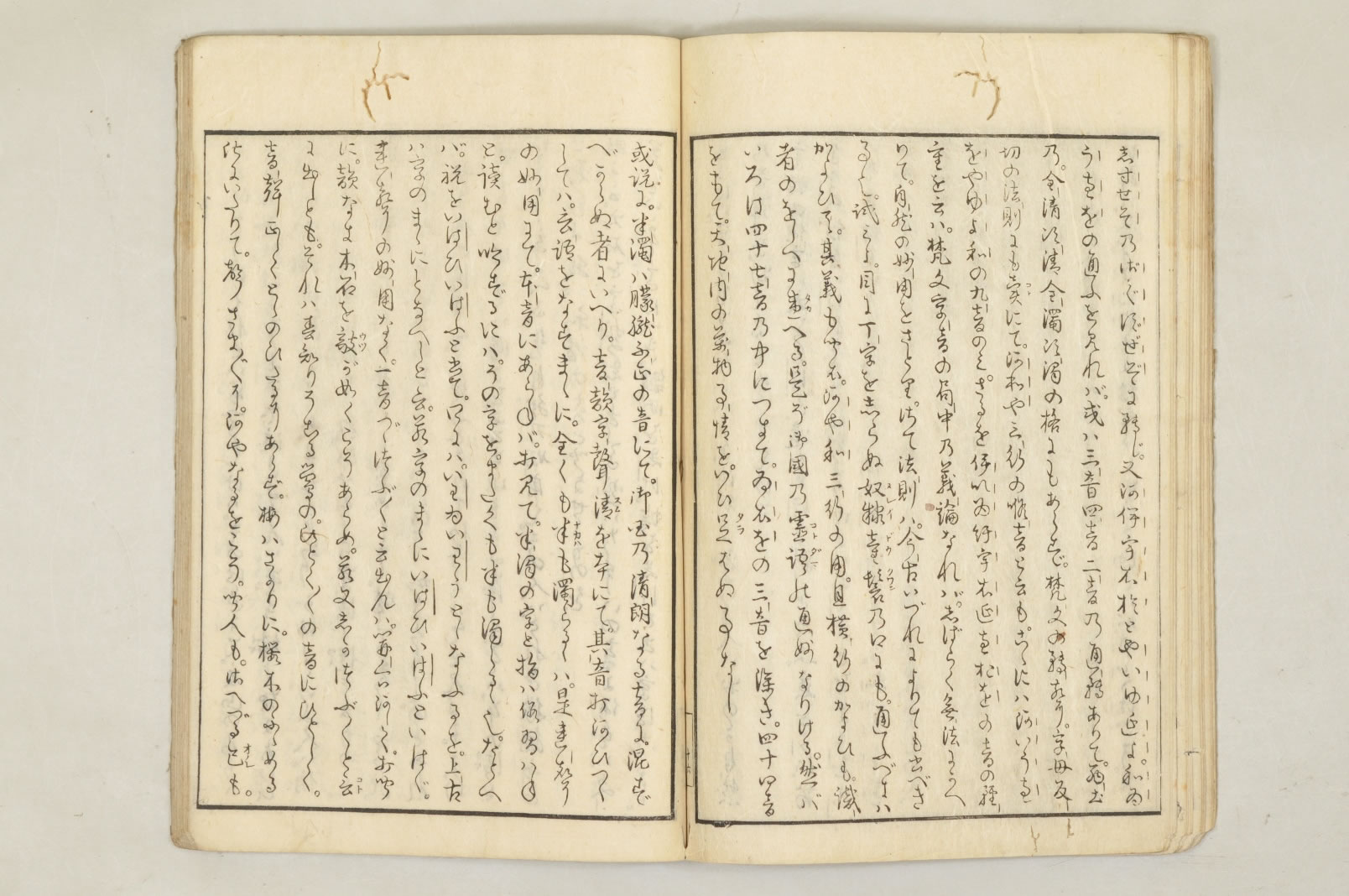 - 序:「寛政七年冬十一月越魚臣等序」跋:「成書」奥附:「寛政八辰秋七月朔日御免/寛政九巳春二月吉辰新刊/東都書林須原屋茂兵衞/浪華書林鹽屋喜助/帝都書林蓍屋儀兵衞梓」