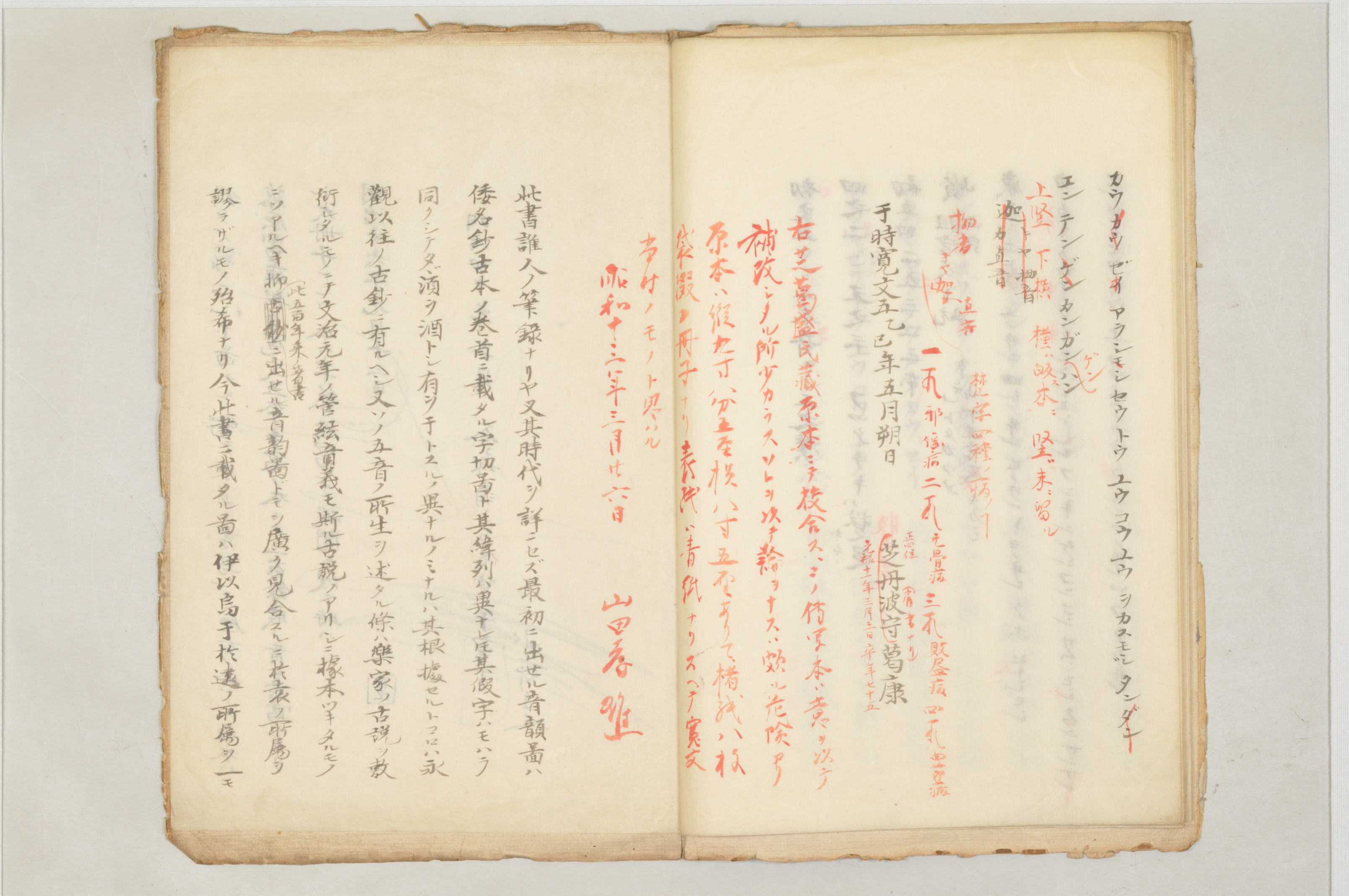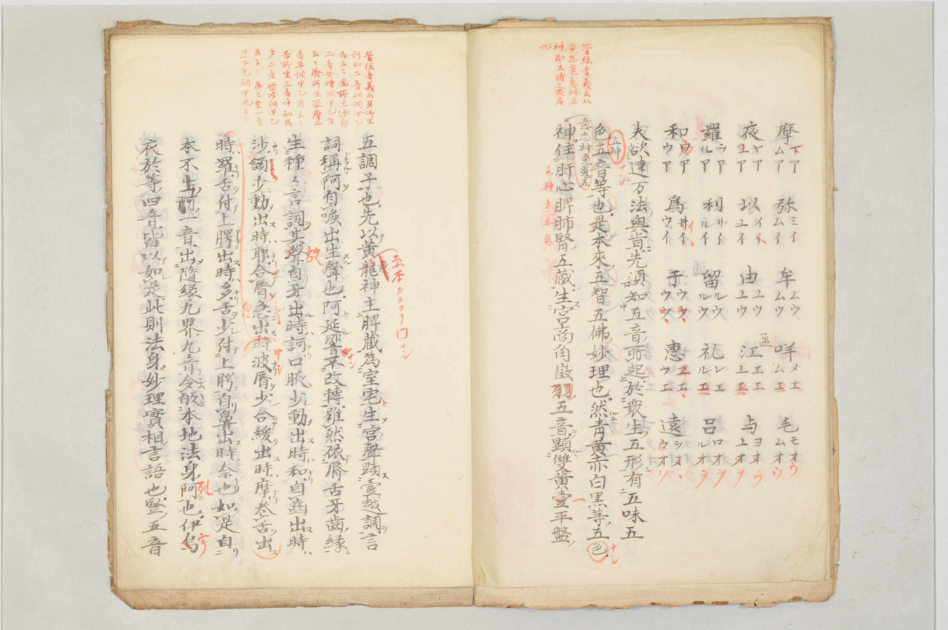 - 奥書:「于時寛文五乙巳年五月朔日芝丹波守葛康/此書誰人ノ筆録ナリヤ又其時代ヲ詳ニセズ最初ニ出セル音韻圖ハ/倭名鈔古本ノ巻首ニ載タル字切圖ト其緯列ハ異ナレトモ其假名ハモハラ/同ク[中略]今此書ニ載タル圖ハ伊以烏于於遠ノ所属ヲ一モ/錯ラズ誠ニ正シキ圖ナルニ愛テ手ツカラ書冩シテ座右ノ珍トス原本ハ/藤原葛康朝臣寛文五年手冩ノ本ニテ二百餘歳ノ昔ニ書冩シタリ/シ大冊子ナルヲ今ハ半紙ニ縮冩シテ披閲ニ便ス時ハ/明治十六年九月十三日善臣[以上本奥書]/明治四十年二月谷森翁より借覽手寫す/水齋主人」識語[朱書]:「右芝葛盛氏藏原本ニテ校合スコノ傳写本ハ意ヲ以テ/補改シタル所少カラスソレヲ以テ論ヲナスハ頗ル危険アリ/原本ハ縦九寸八分五厘ありて楮紙八枚/袋綴ノ冊子ナリ表紙ハ青紙ナリスヘテ寛文/当時ノモノト思ハル/昭和十三年三月廿六日山田孝雄」朱書入あり