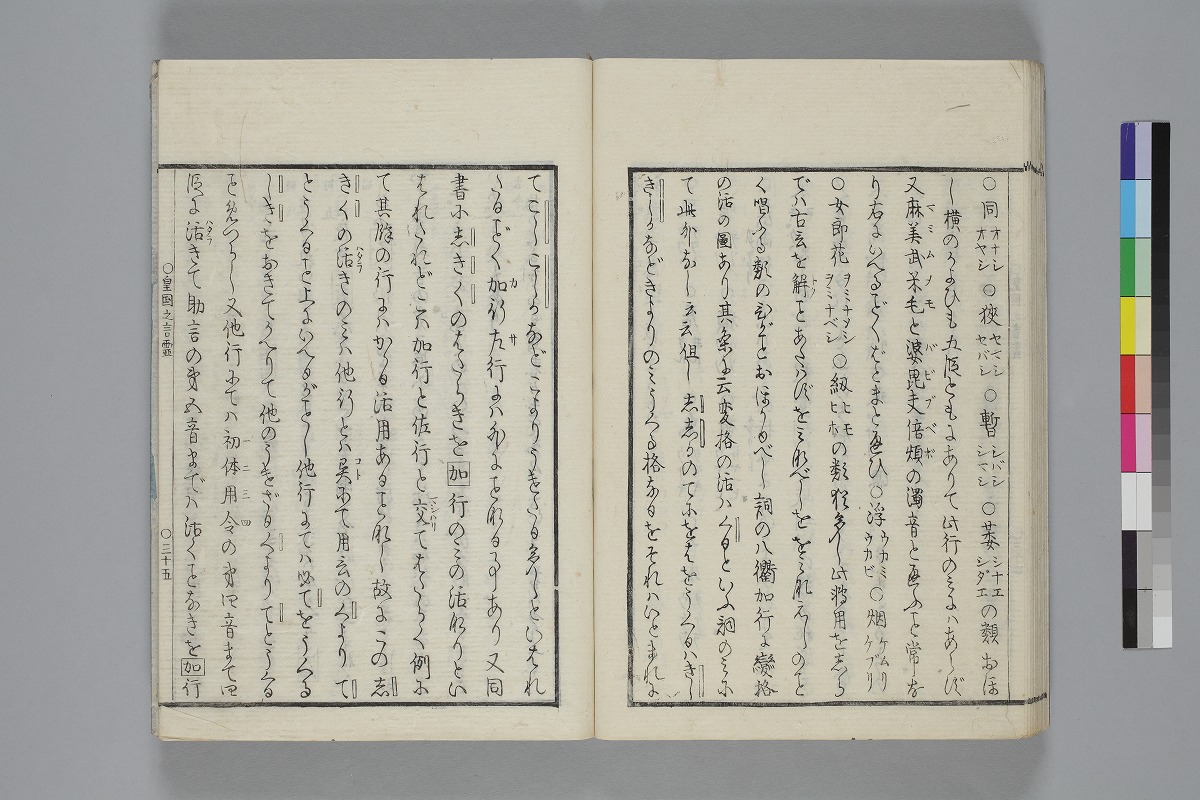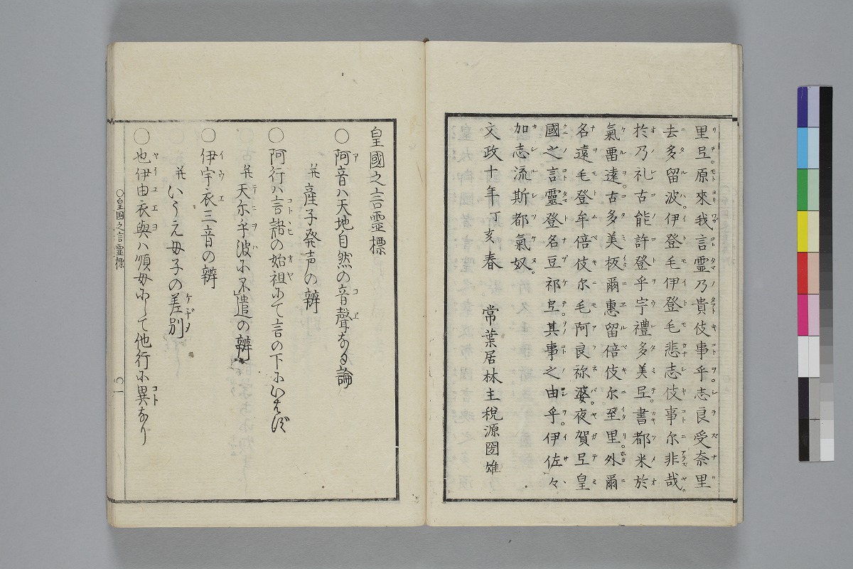 - 序:「文政十まり二/とせといふとしの夘月の十日あまり二日/正三位冨小路藤原朝臣/治部卿藤原さた直」「出雲宿祢俊信」「文政十年丁亥春常葉居林主税源圀〔ママ〕雄」本文末:「文政八とせといふ年のくれに書をへぬ」跋:「かくいふは鳥かなく吾嬬居のあるし/くに風」末尾:「常葉居先生著述目録/路岐居藏版」印記:「山澤藏」
