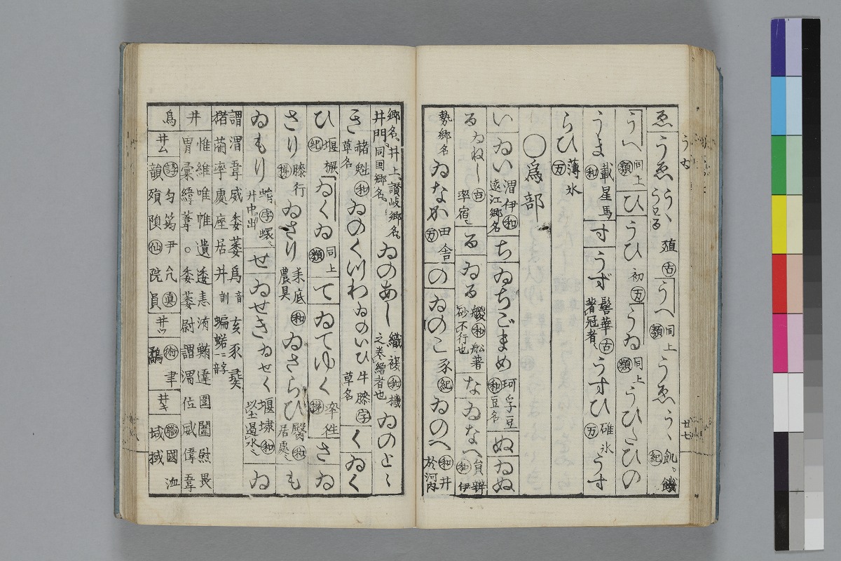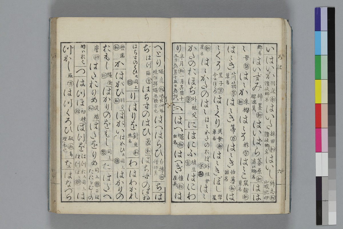 - 見返:「源稲彦編/古今假字つかひ/浪華書林合刻」序:「石津亮澄かしるす時に文化九年/秋九月九日の日」尾題:「古今假字用例」奥附:「文化十酉年八月刻成/大阪書林/本町通貳丁目奈良屋長兵衞/御堂筋瓦町小刀屋六兵衞/心齊橋通南久宝寺町河内屋八兵衞/同唐物町河内屋太助/同傳馬町河内屋嘉七」34丁次に「又卅四」あり