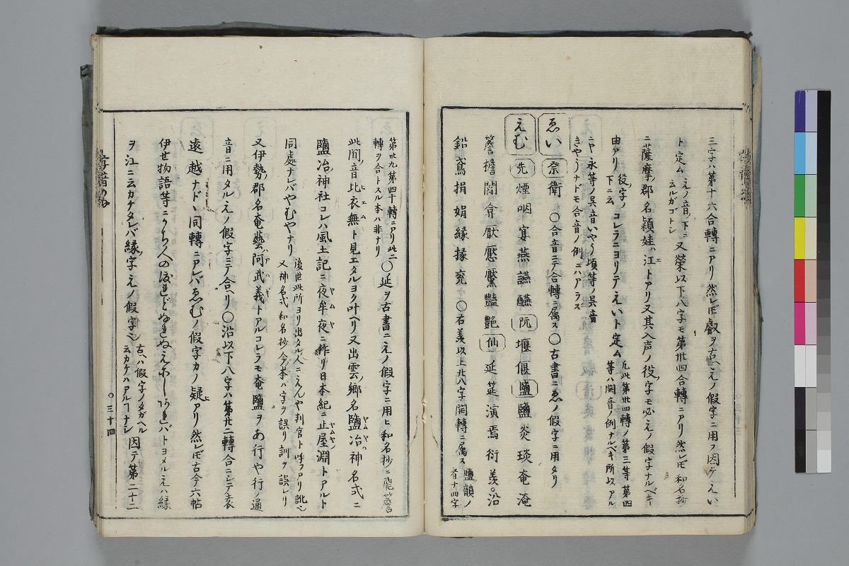 - 序:「安永四年春三月/門人須賀直見謹撰」「如是云者伊勢人本居宣長」刊記:「安永五年丙申發行/書林/勢州松坂日野町柏屋兵助/同所本町田丸屋正藏/京都寺町四条上ル町錢屋利兵衞」奥附:「竹苞蔵板/帝都寺町通本能寺前錢屋惣四郎」