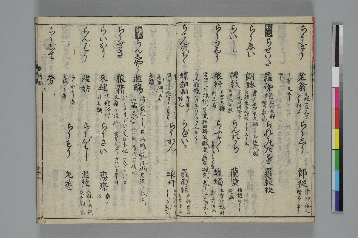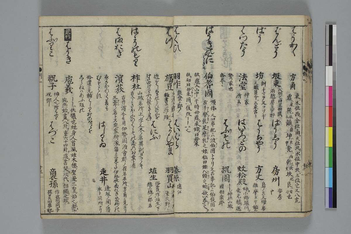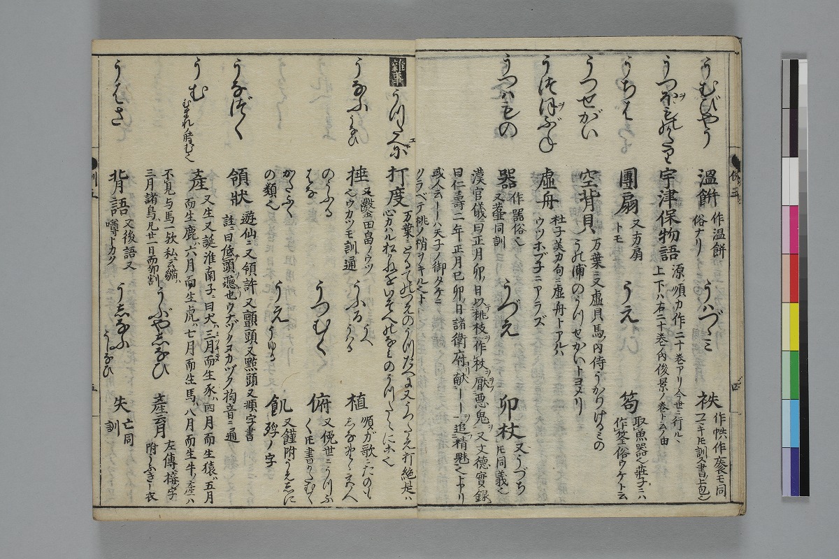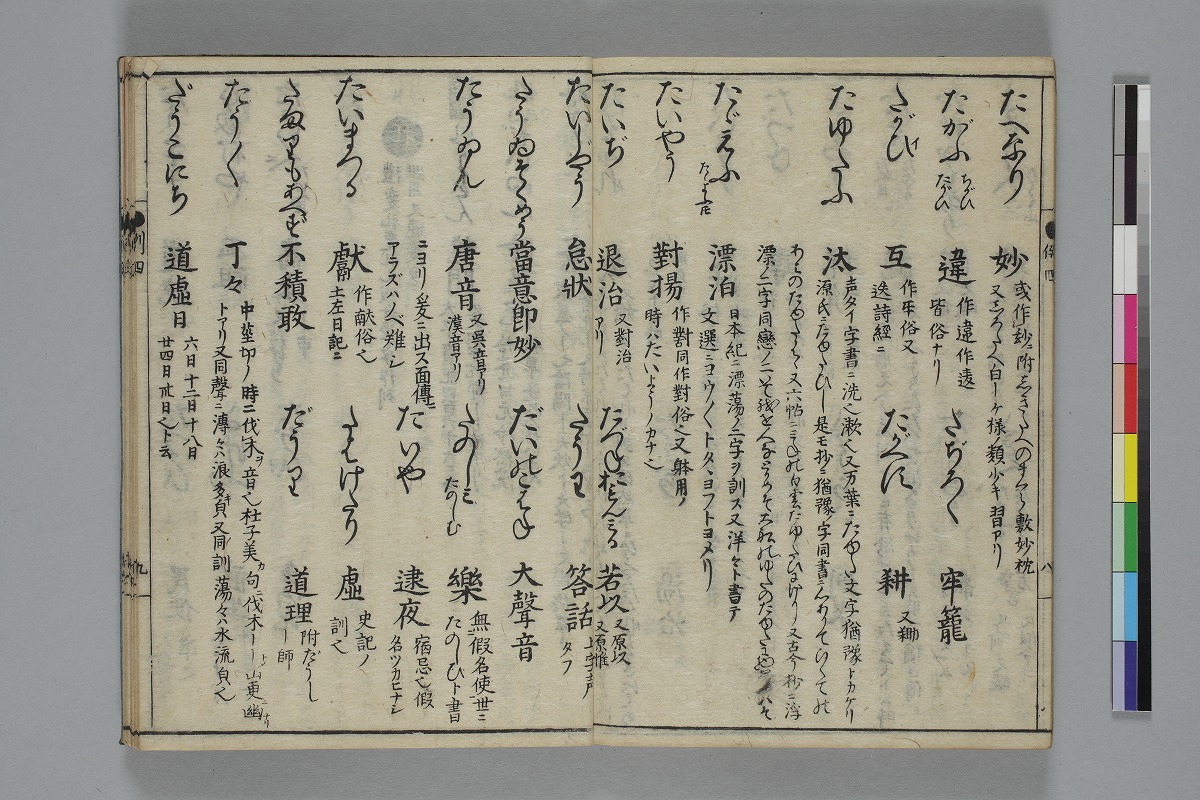 - 扉ウ:「貉睡堂橘仲宇成員編著/梅庵山崎叔長保春較訂/倭字古今通例全書/書肆息障軒藏版」序:「元禄九丙子春三月甲申奇山薄保春序」「元禄八年の秋ふみ月七日橘の成員/筆を江府のかたはらにそめぬ」跋:「元禄九年暮春之日/牛巷逸民幽谷庵伴益敏書」刊記:「元禄九年丙子歳秋八月鬼宿日/柊屋傳兵衞開板」巻一―巻四:12、19、33、22、27丁、巻五―巻八:29、31、33、33丁