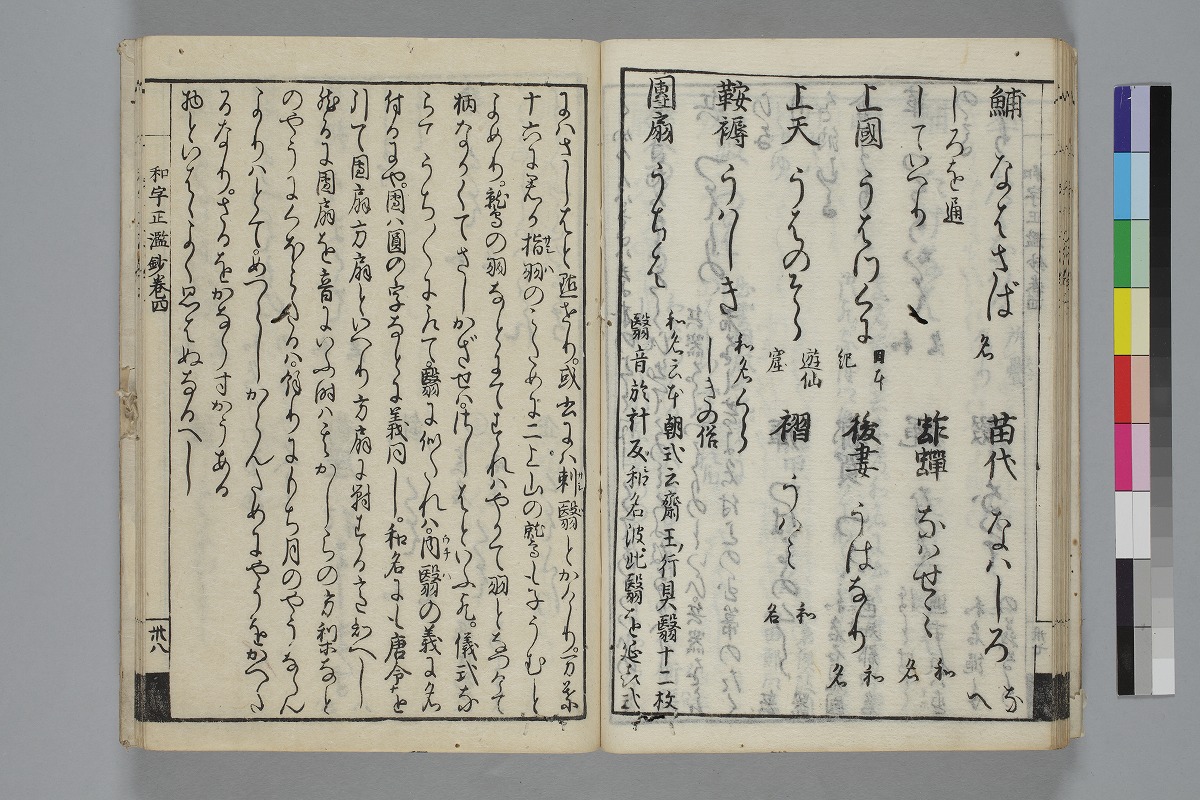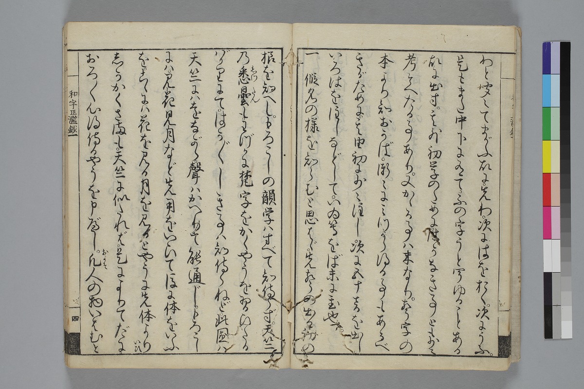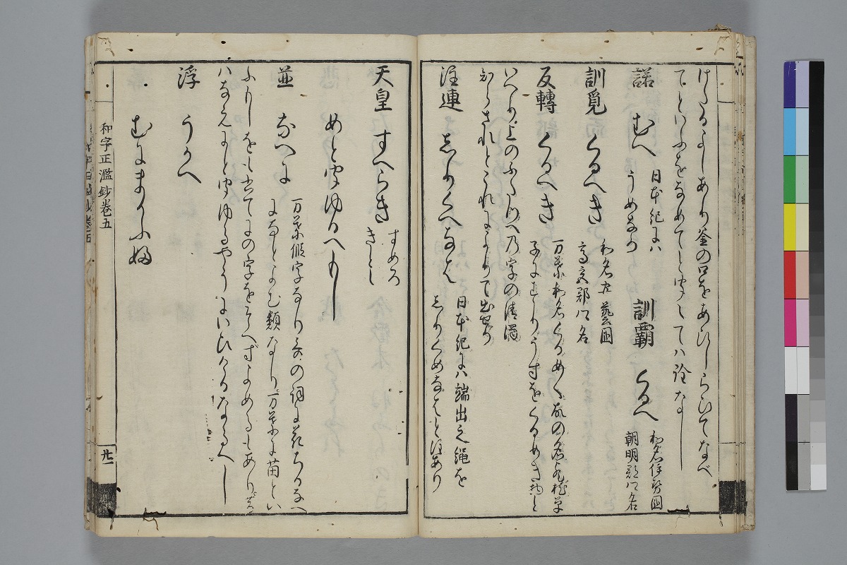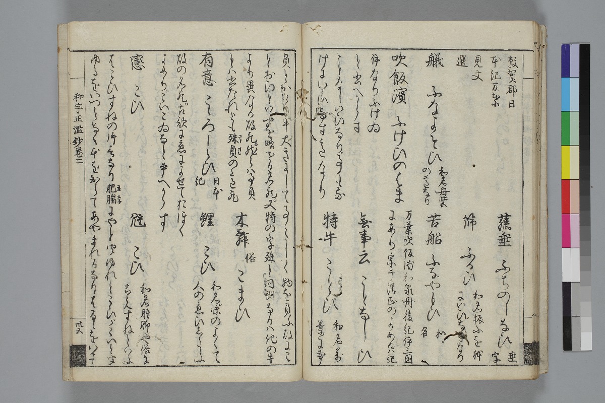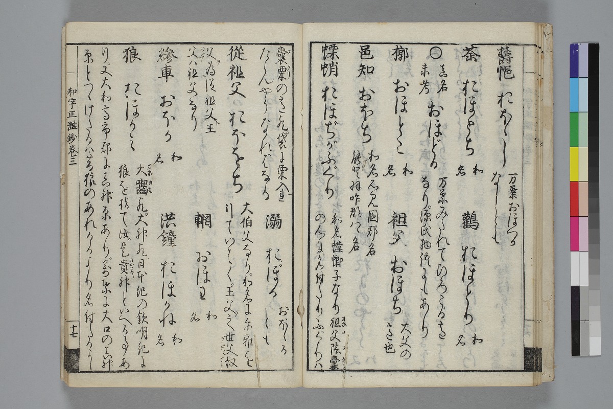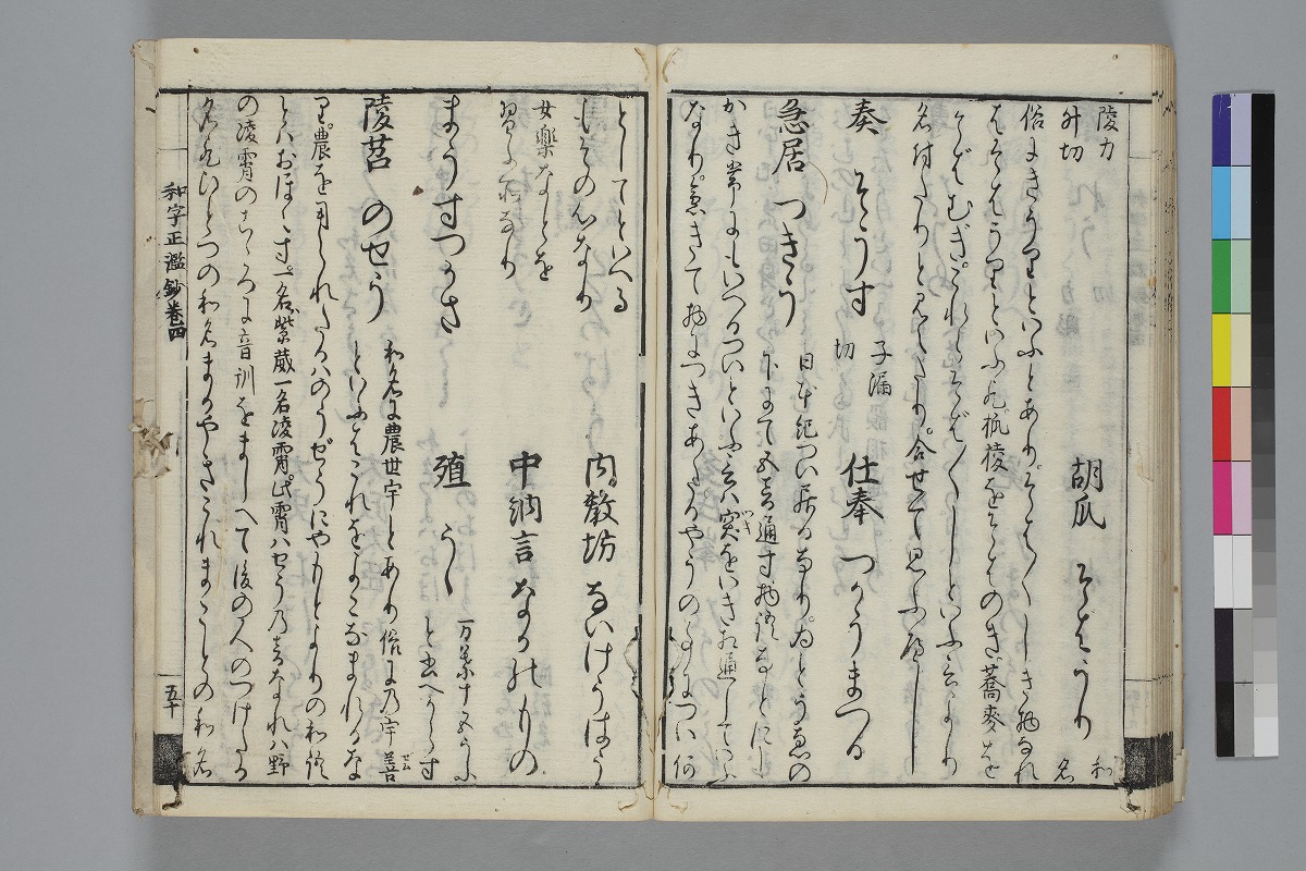 - 序:「勒爲五巻名曰和字正濫鈔焉元禄癸/酉二月二十有一日序」奥附:「元文四巳未歳正月吉旦求版/書林大坂心齋橋筋順慶町柏原屋澁川清右衛門/同與市」印記:「中尾藏書」「中尾書藏」巻一:4、31丁、巻二:41丁、巻三:41丁、巻四:56丁、巻五:48丁