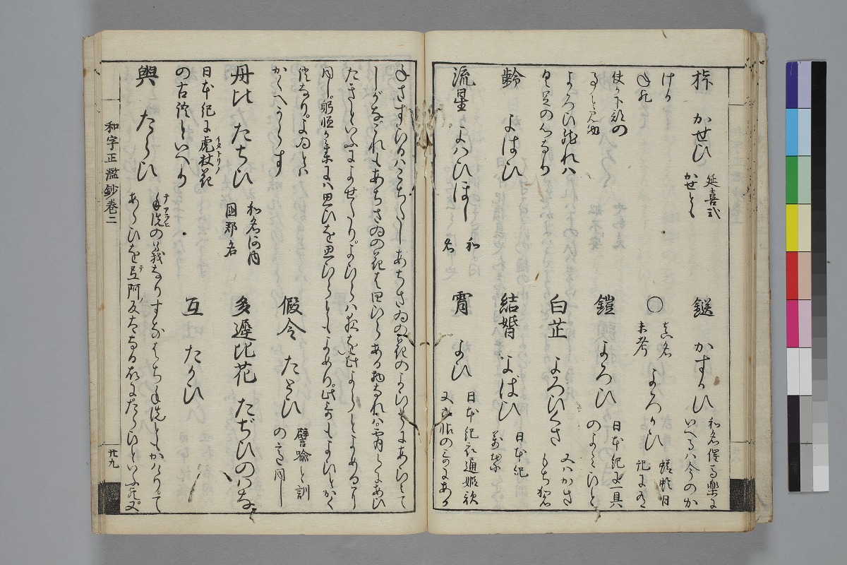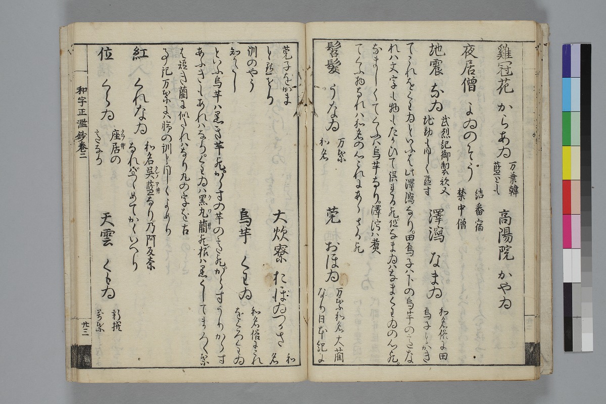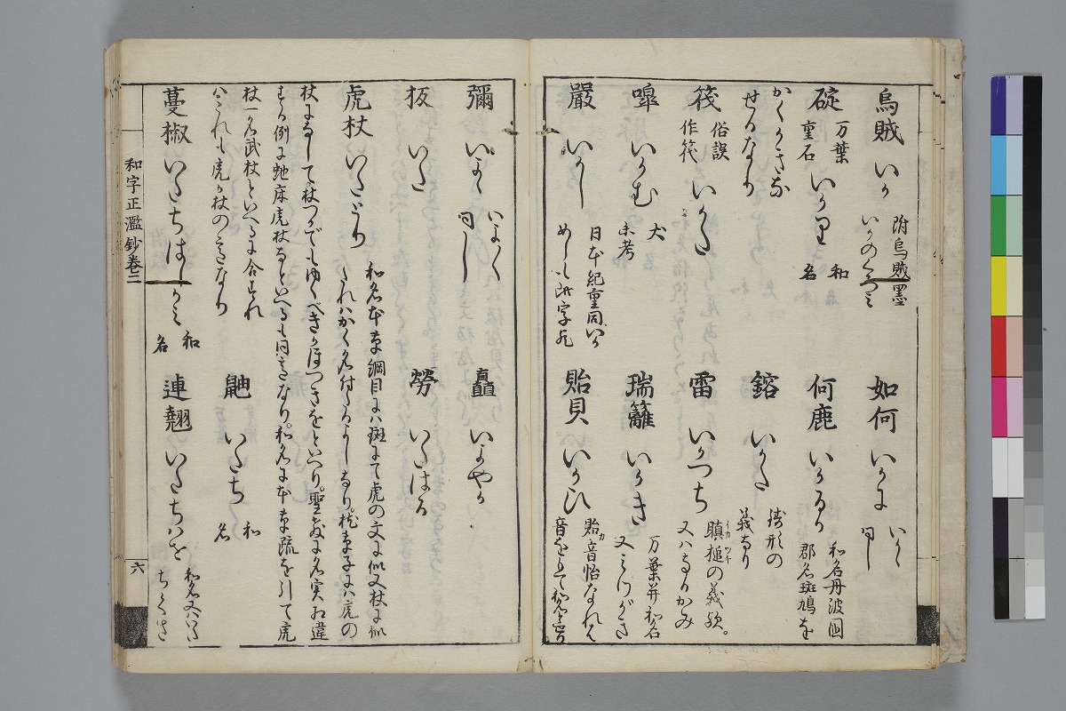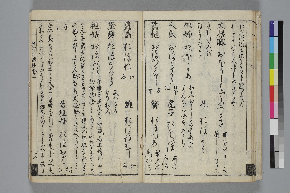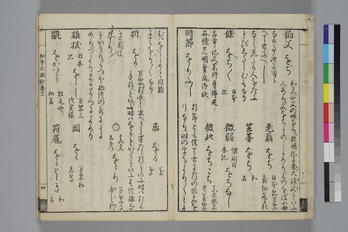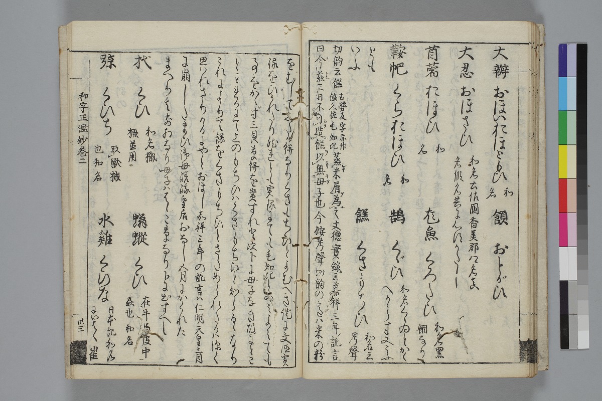 - 序:「勒爲五巻名曰和字正濫鈔焉元禄癸/酉二月二十有一日序」奥附:「元文四巳未歳正月吉旦求版/書林大坂心齋橋筋順慶町柏原屋澁川清右衛門/同與市」印記:「中尾藏書」「中尾書藏」巻一:4、31丁、巻二:41丁、巻三:41丁、巻四:56丁、巻五:48丁