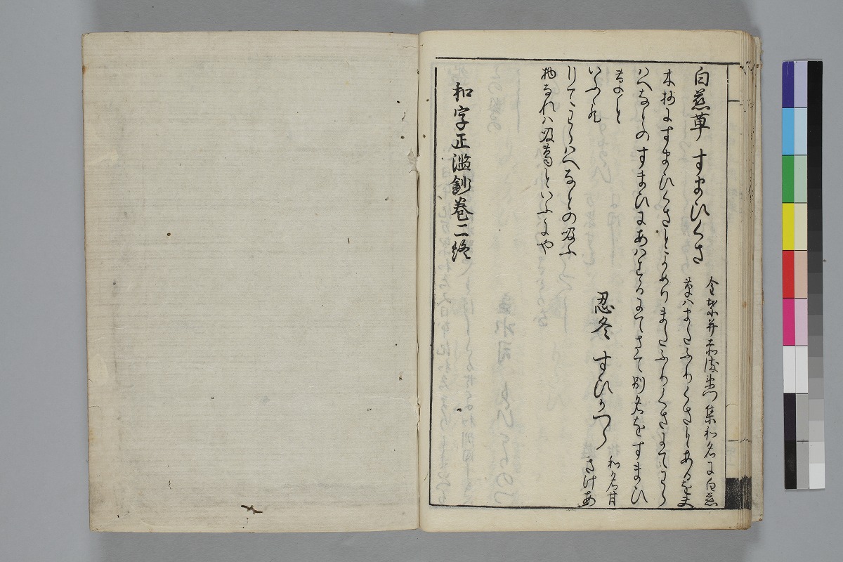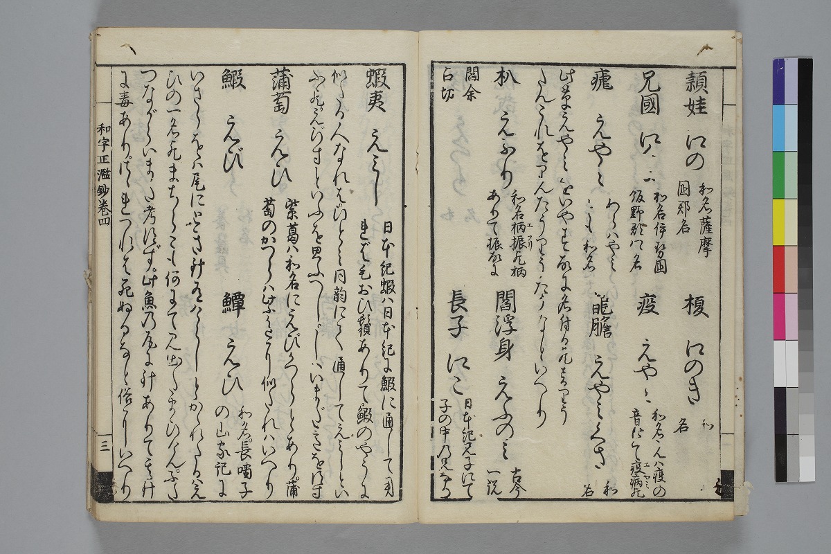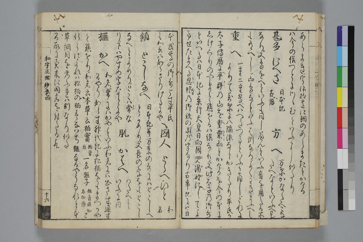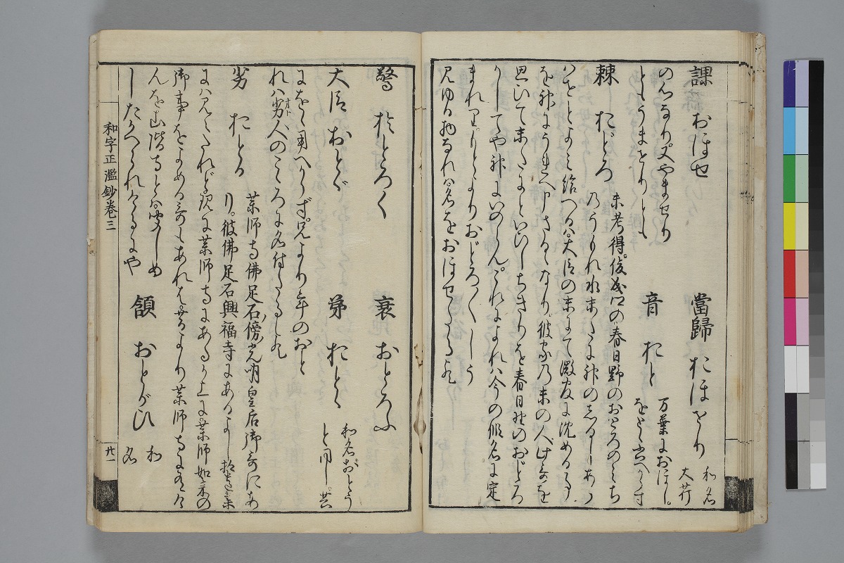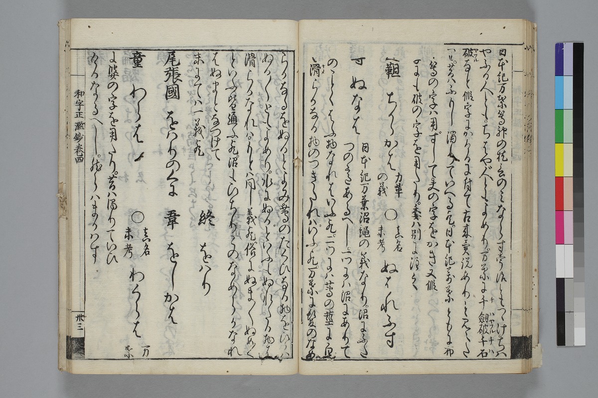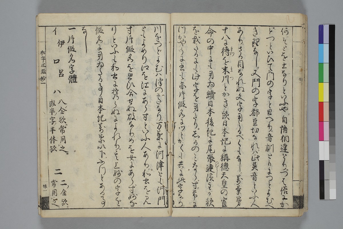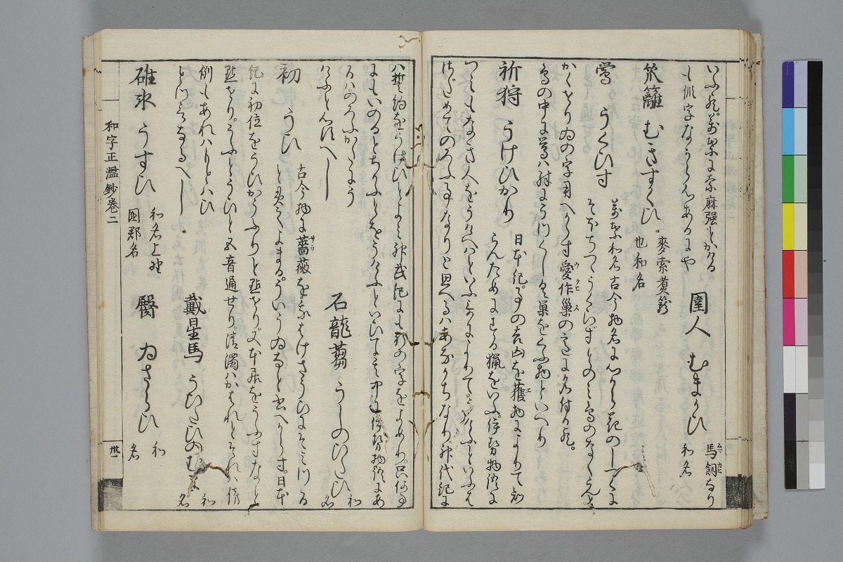 - 序:「勒爲五巻名曰和字正濫鈔焉元禄癸/酉二月二十有一日序」奥附:「元文四巳未歳正月吉旦求版/書林大坂心齋橋筋順慶町柏原屋澁川清右衛門/同與市」印記:「中尾藏書」「中尾書藏」巻一:4、31丁、巻二:41丁、巻三:41丁、巻四:56丁、巻五:48丁
