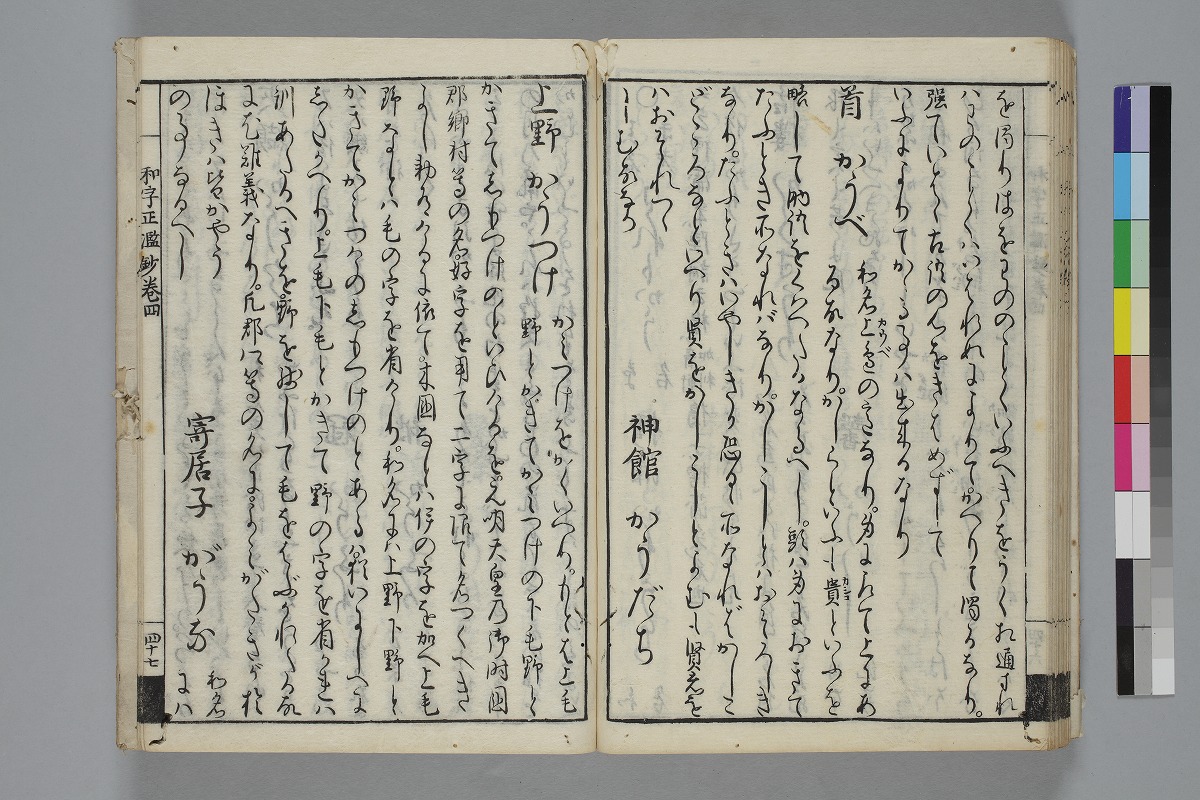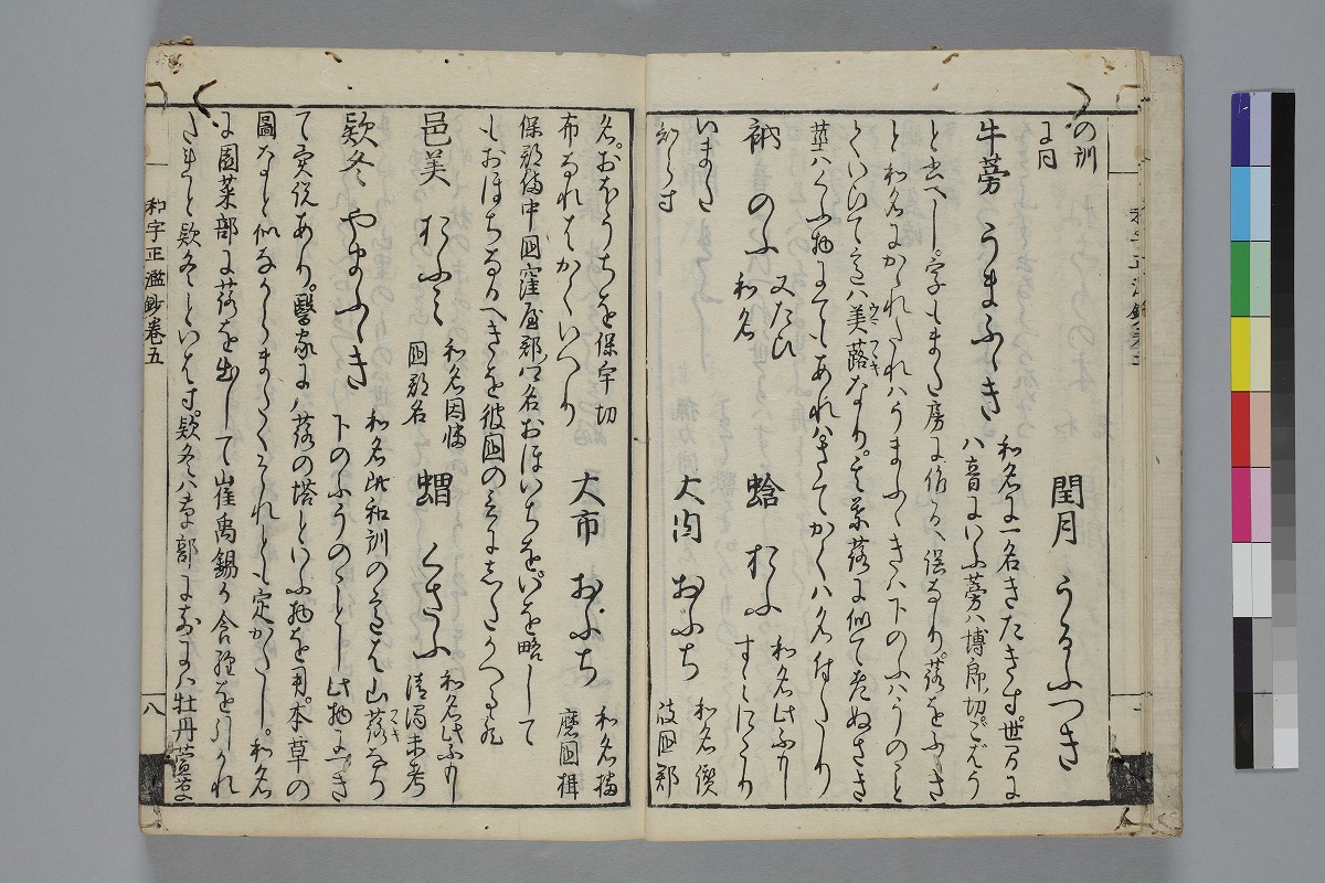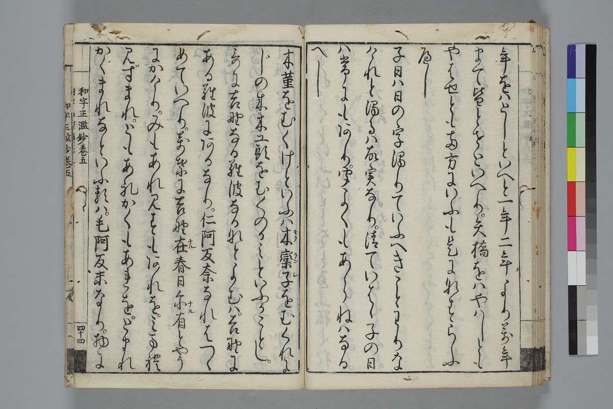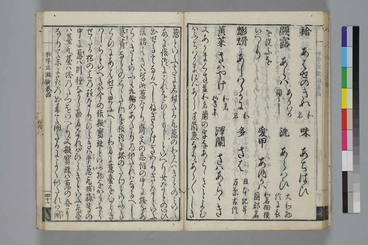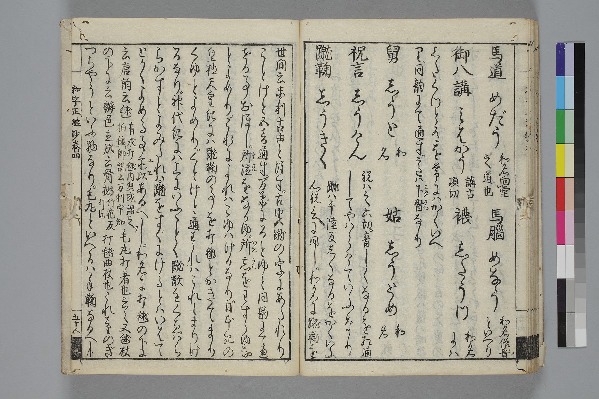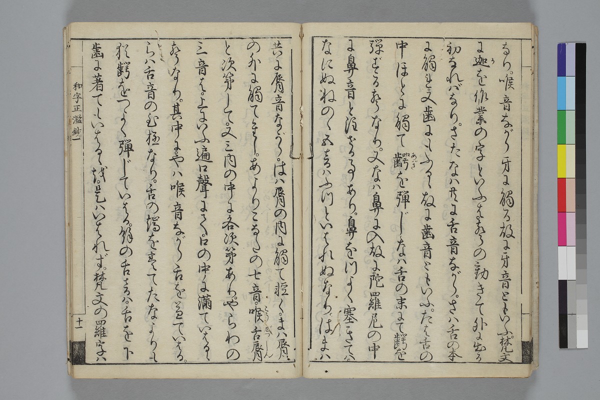 - 序:「勒爲五巻名曰和字正濫鈔焉元禄癸/酉二月二十有一日序」奥附:「元文四巳未歳正月吉旦求版/書林大坂心齋橋筋順慶町柏原屋澁川清右衛門/同與市」印記:「中尾藏書」「中尾書藏」巻一:4、31丁、巻二:41丁、巻三:41丁、巻四:56丁、巻五:48丁