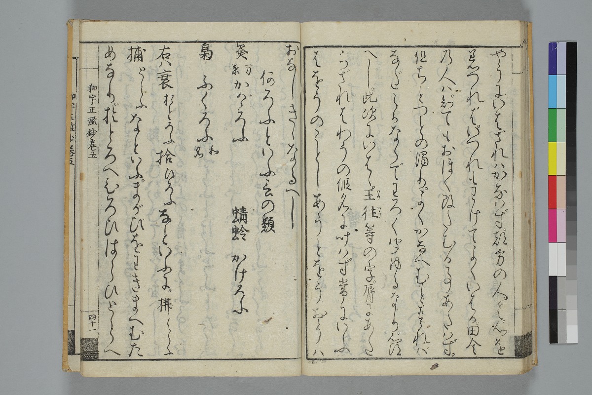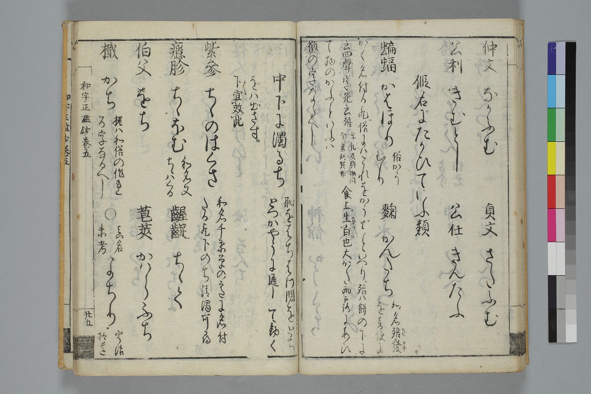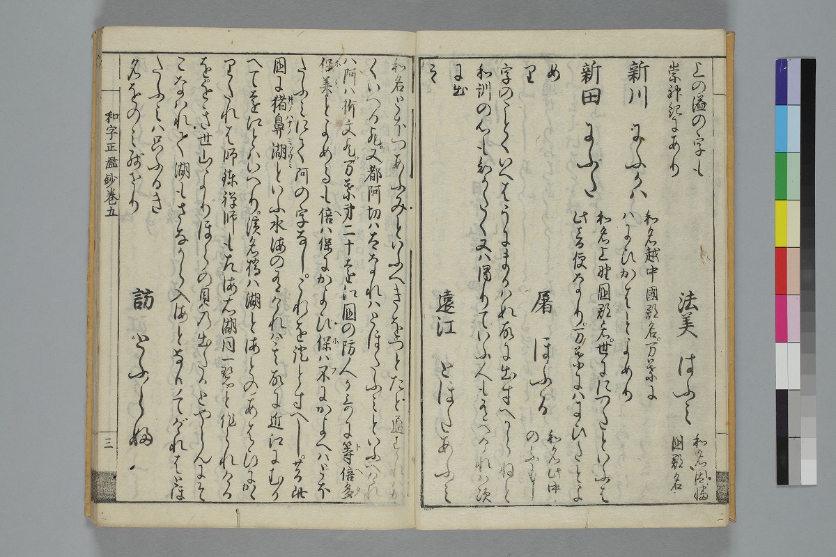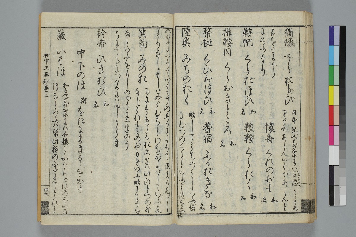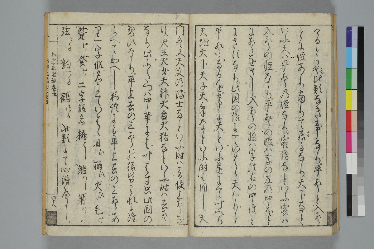 - 闕本巻一を欠く奥附:「元文四己未歳正月吉旦求版/書林/大坂心齋橋筋順慶町柏原屋澁川清右衛門/同與市」印記:「萬香文庫」「内家文庫」巻二:41丁、巻三:41丁、巻四:56丁、巻五:48丁