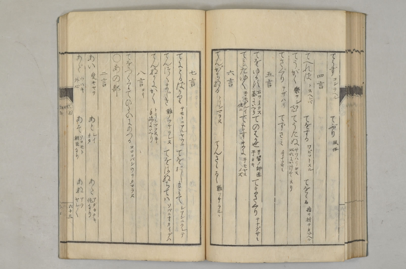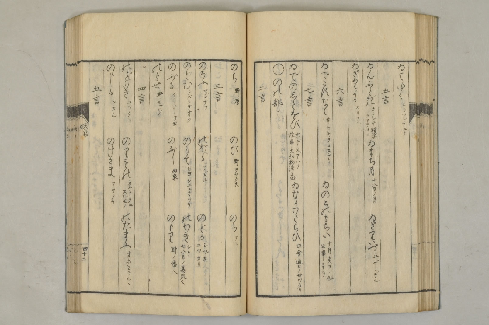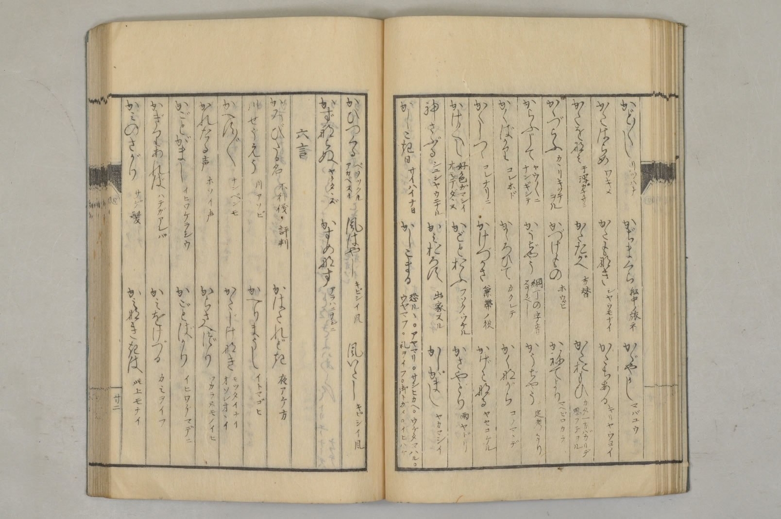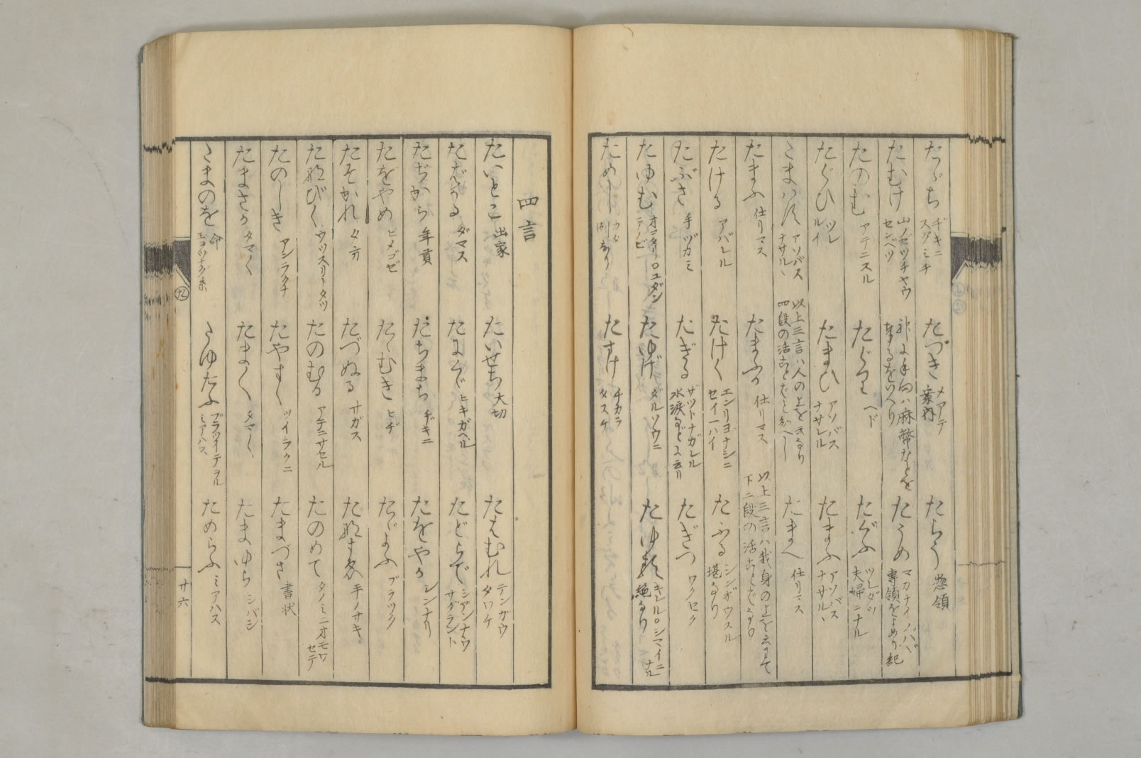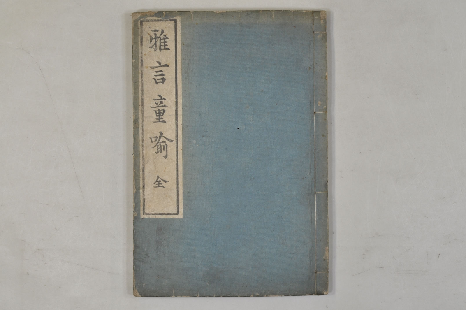 - 見返:「河崎清厚大人著/雅言童喩/停雲舎藏」序:「天保の六とせといふとしの水無月/安濃津人高橋知周」奥附:「天保十五年甲辰六月/發行書肆/京都風月荘左衞門/江戸岡田屋嘉七/大坂秋田屋太右衞門/同河内屋茂兵衞/名古屋美濃屋伊六/伊勢津篠田伊十郎板」印記:「賢木舎」