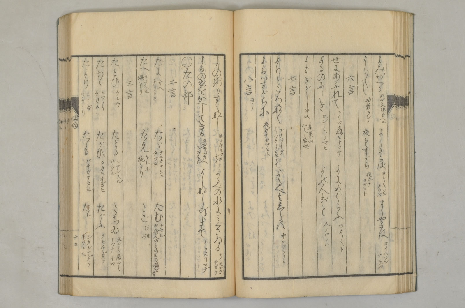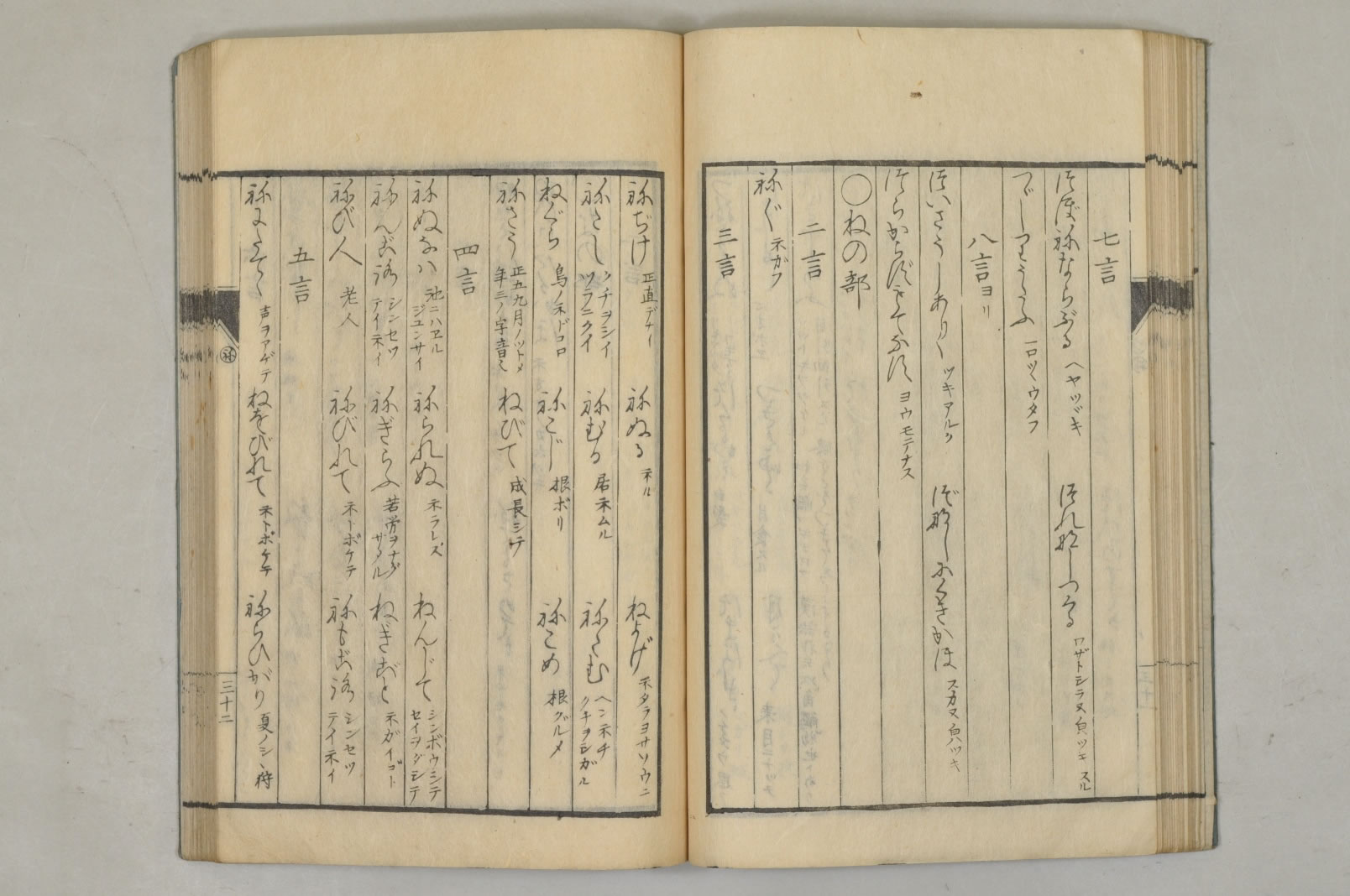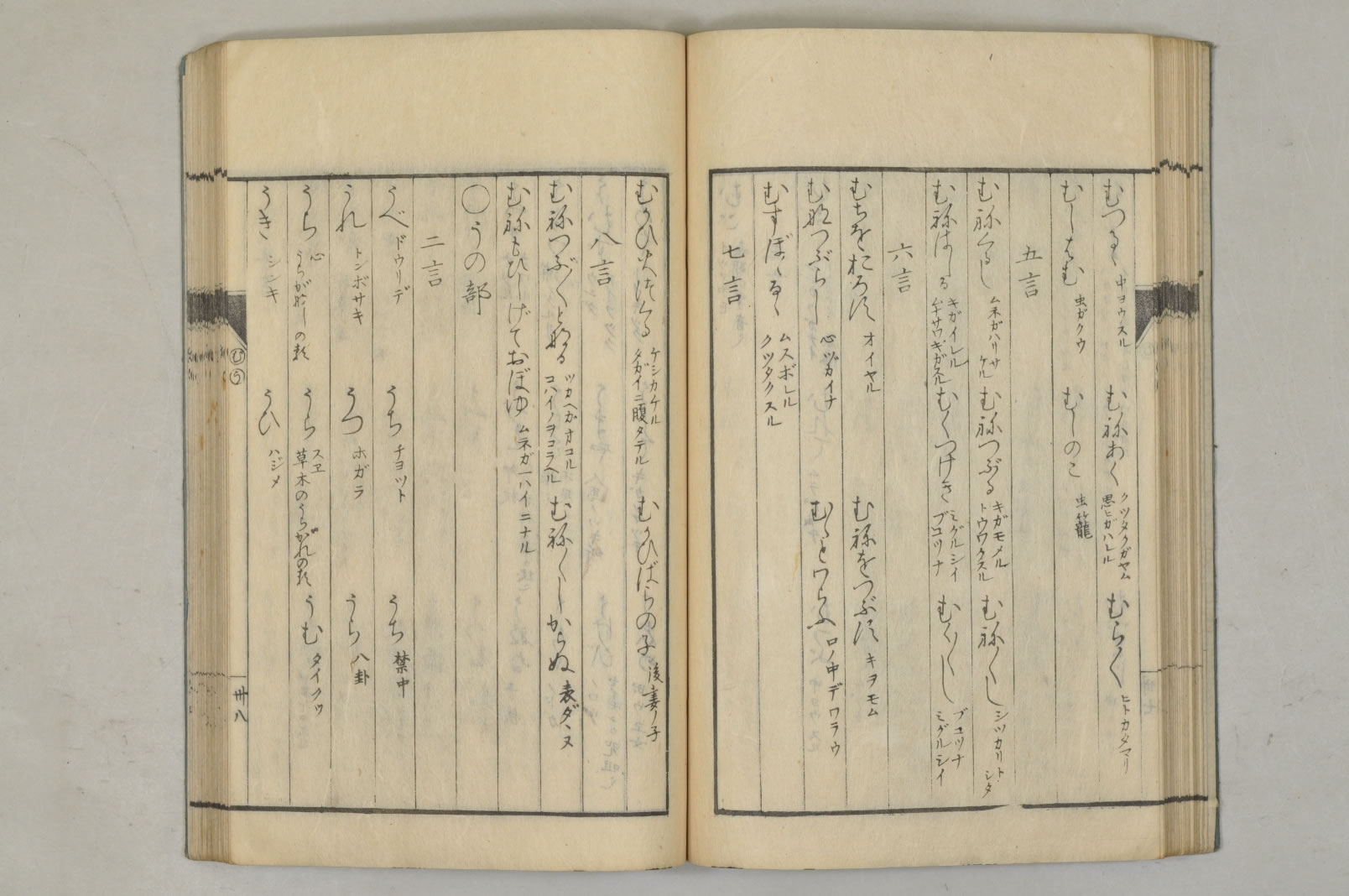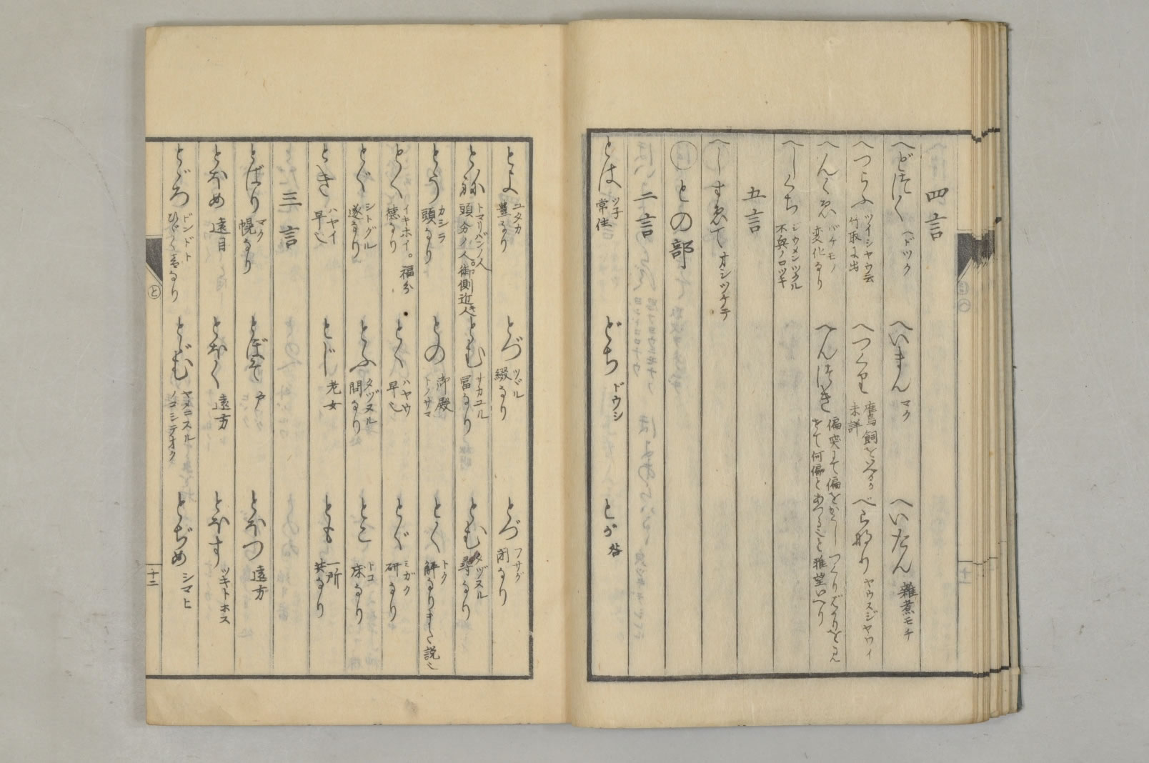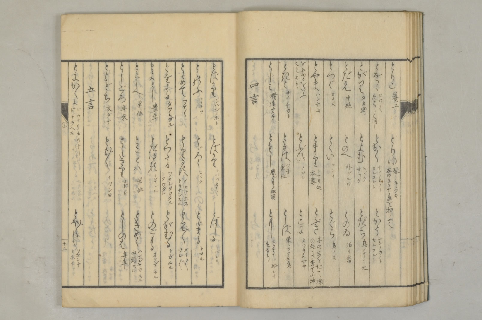 - 見返:「河崎清厚大人著/雅言童喩/停雲舎藏」序:「天保の六とせといふとしの水無月/安濃津人高橋知周」奥附:「天保十五年甲辰六月/發行書肆/京都風月荘左衞門/江戸岡田屋嘉七/大坂秋田屋太右衞門/同河内屋茂兵衞/名古屋美濃屋伊六/伊勢津篠田伊十郎板」印記:「賢木舎」