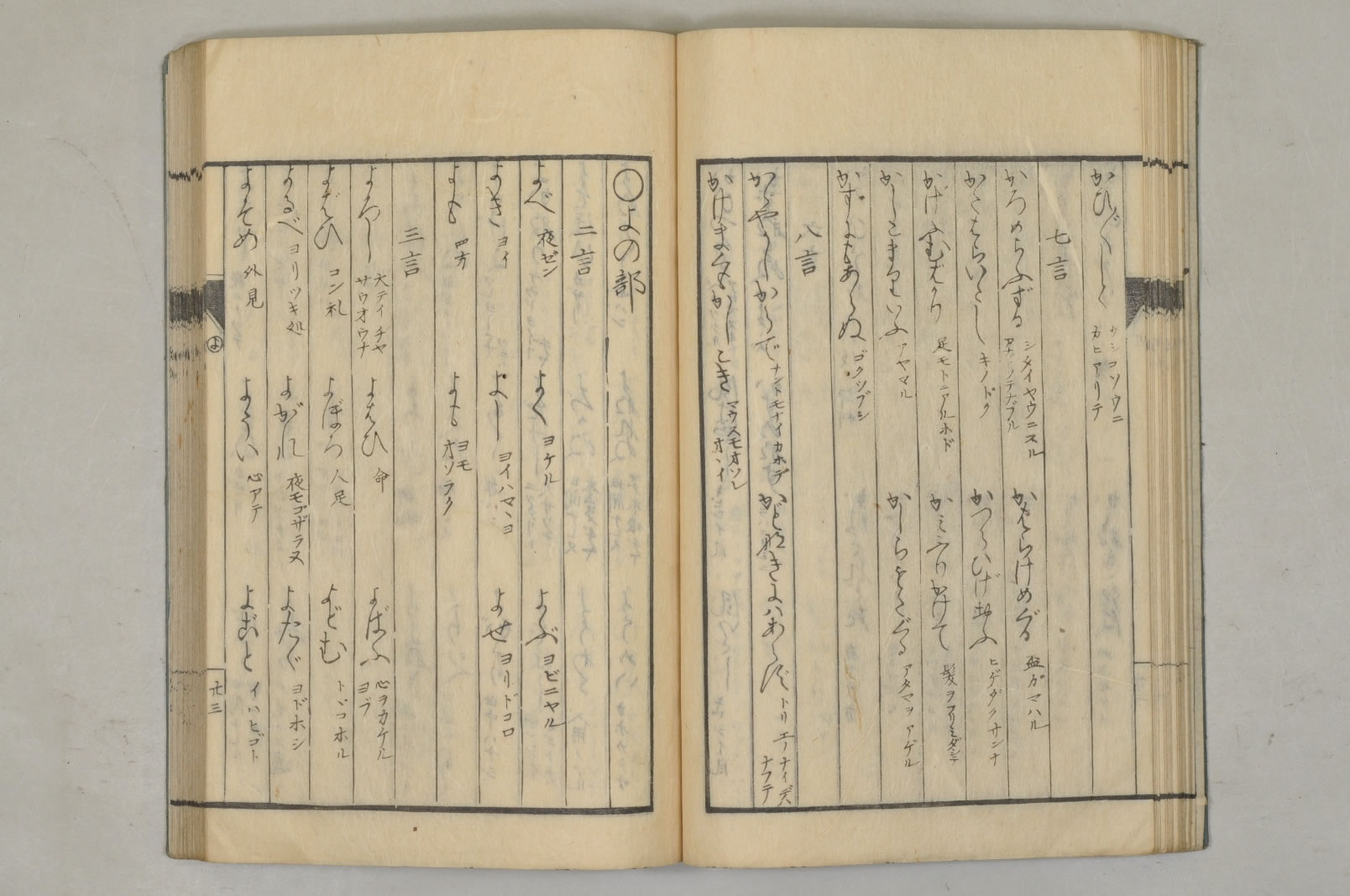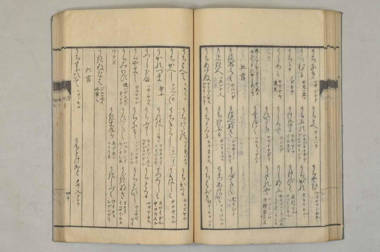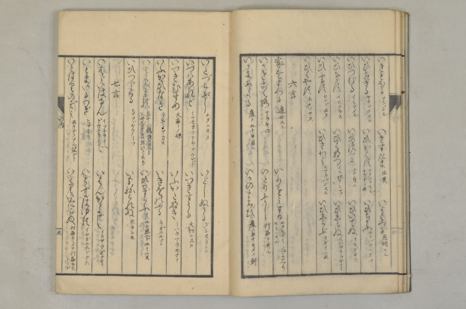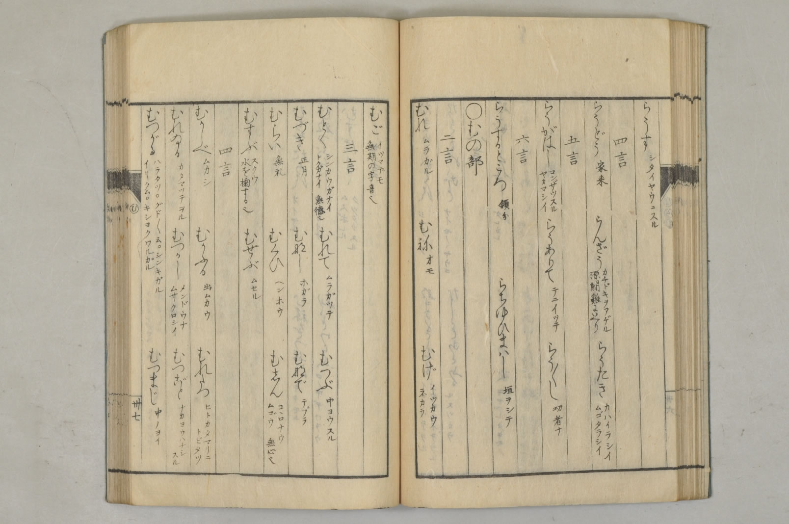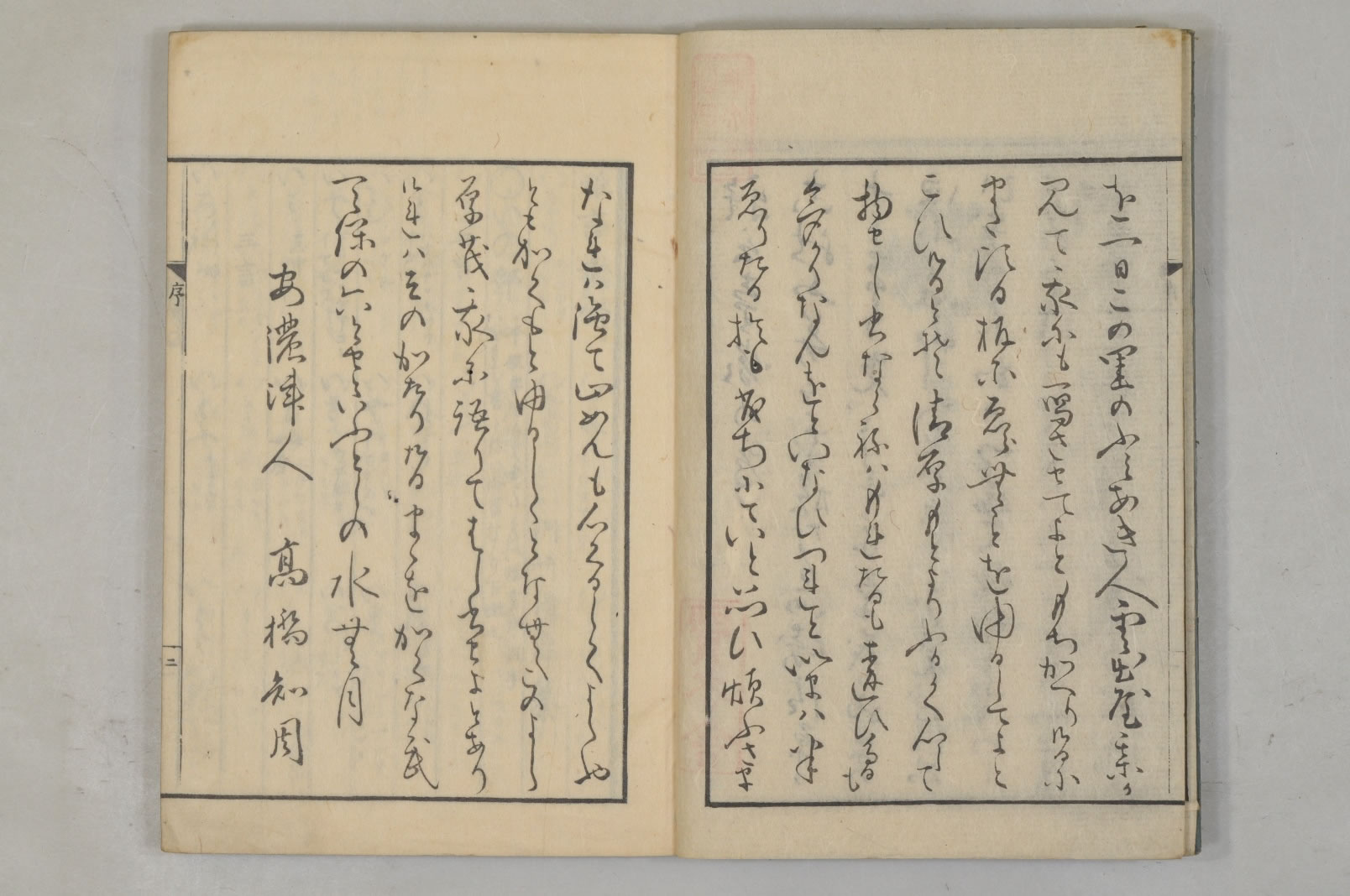 - 見返:「河崎清厚大人著/雅言童喩/停雲舎藏」序:「天保の六とせといふとしの水無月/安濃津人高橋知周」奥附:「天保十五年甲辰六月/發行書肆/京都風月荘左衞門/江戸岡田屋嘉七/大坂秋田屋太右衞門/同河内屋茂兵衞/名古屋美濃屋伊六/伊勢津篠田伊十郎板」印記:「賢木舎」