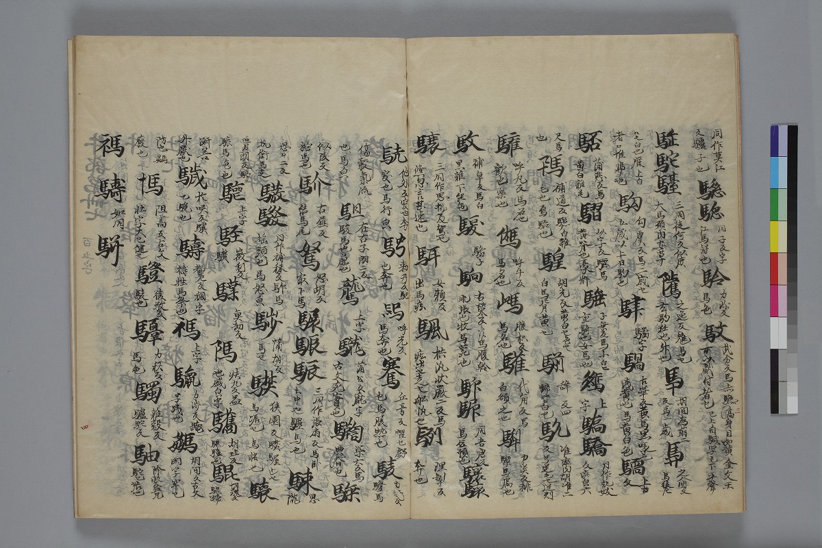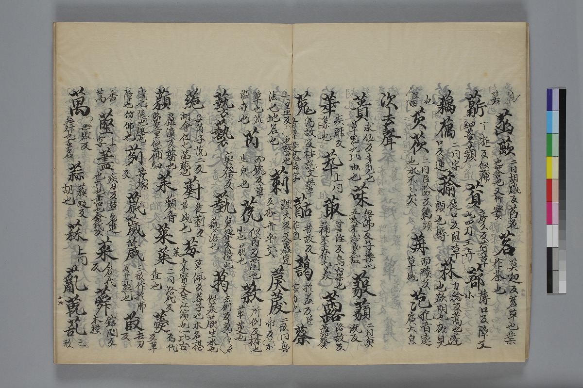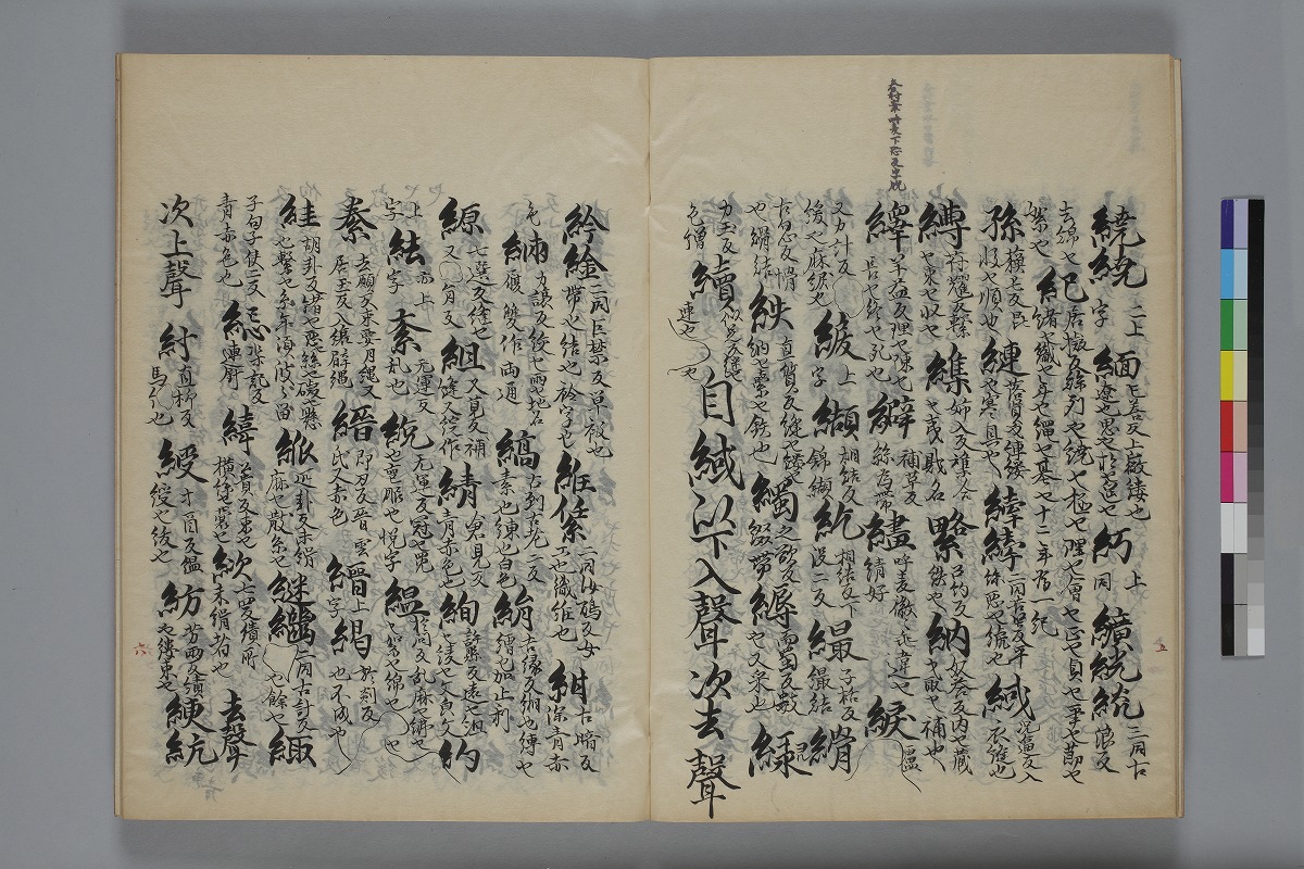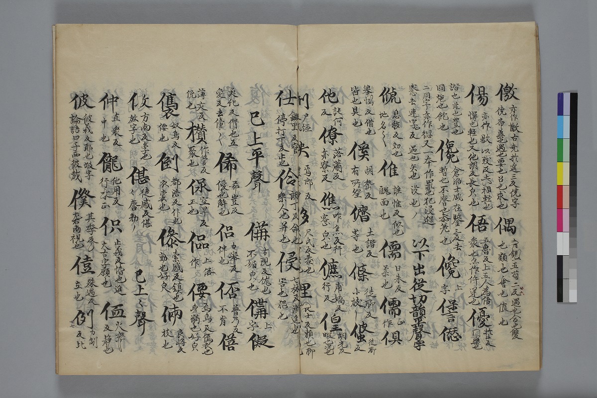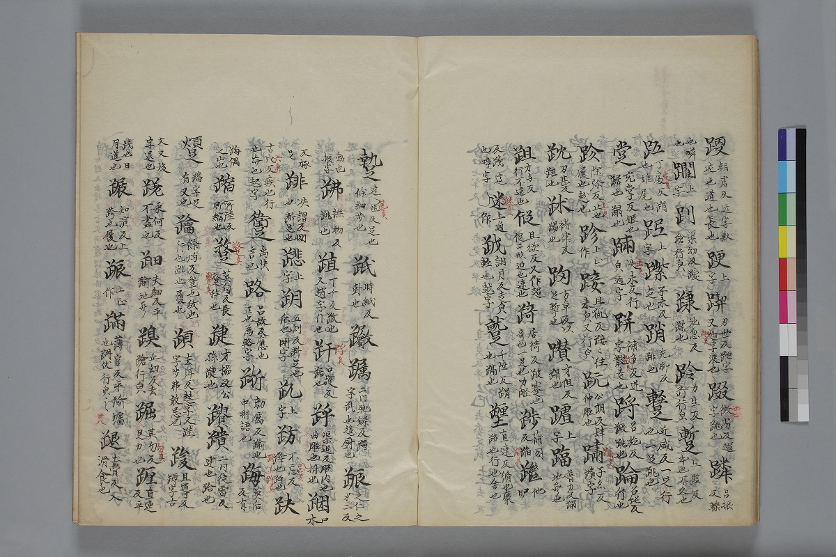 - 巻第一奥書:「天治元年(甲/辰)五月下旬書冩之畢/法隆寺一切経書冩之次為字決諸人各一巻書冩之中/此巻是五師静因之分以矇筆所冩了/[以下小字]安政四年四月念二日以禿筆摸冩了藤原春村」巻第二奥書:「天治元年(甲/辰)五月二日(戊/寅)書冩畢法隆寺一切/經音義䉼也為自他法界平等利益勸進僧林幸/文政七年甲申三月以天治真夲摸冩拠藏本比校之岡正武/天保三年正月以岡氏本謄冩之黒河春村/[以下朱書]同十三年十一月據伴信友所影冩之真本令一校了」巻第四奥書:「天保十三年壬寅八月十六日以伴信友夲影冩/六十九老人螢澤齋岡正武/同年十月以岡氏本令摸冩了黒河春村」巻第五奥書:「[以下小字]天治元年四月廿九日為今法久住法隆寺一切經蔵利書冩執筆任覺□之/一校了」巻第七奥書:「一交了/天治元(才次/甲辰)五月十九日交了」巻第一:1、36丁、巻第二:1、30丁、巻第三:1、28丁、巻第四:1、27丁、巻第五:1、27丁、巻第六:1、33丁、巻第七:37、1丁