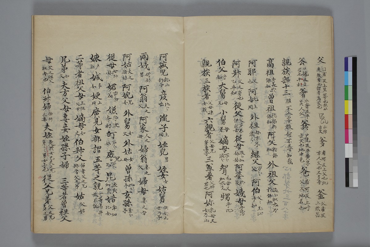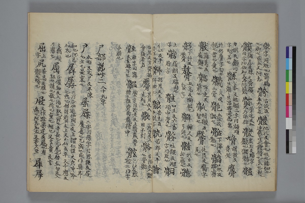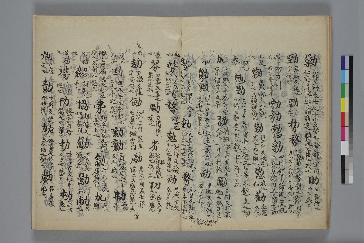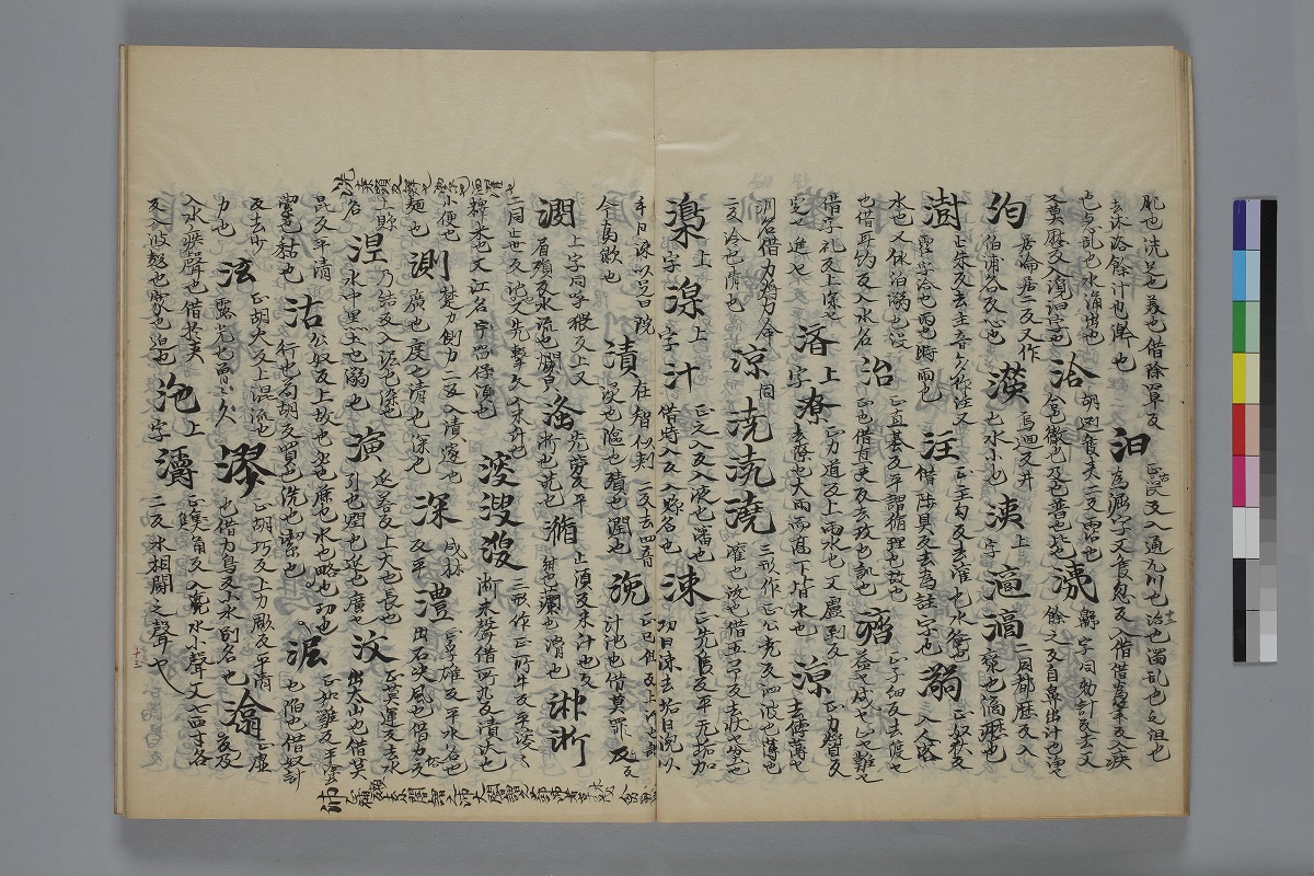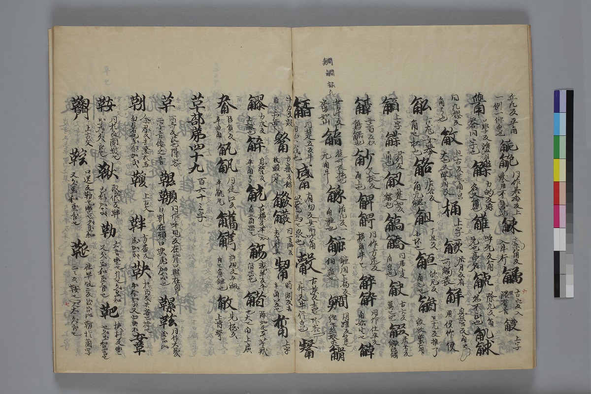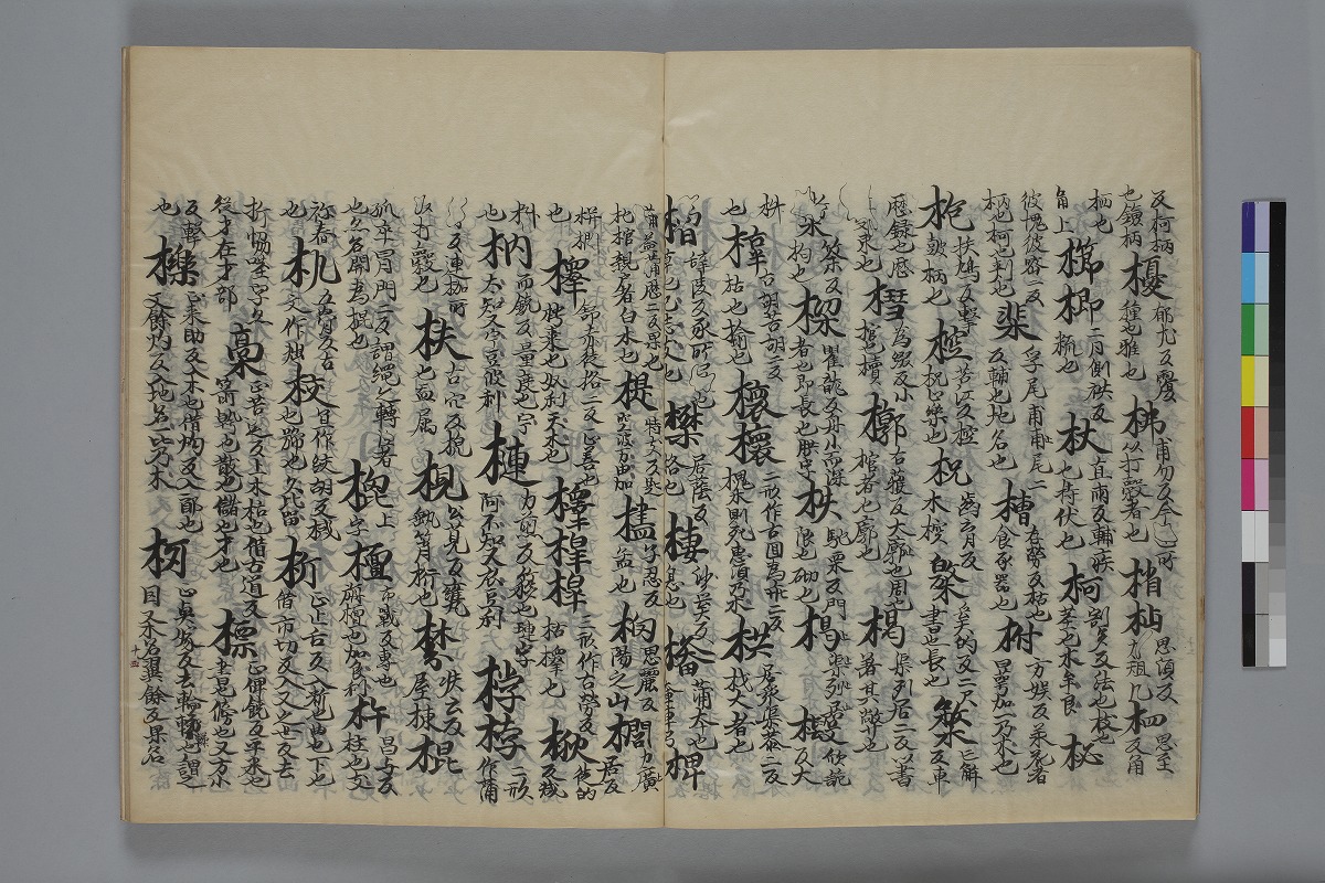 - 巻第一奥書:「天治元年(甲/辰)五月下旬書冩之畢/法隆寺一切経書冩之次為字決諸人各一巻書冩之中/此巻是五師静因之分以矇筆所冩了/[以下小字]安政四年四月念二日以禿筆摸冩了藤原春村」巻第二奥書:「天治元年(甲/辰)五月二日(戊/寅)書冩畢法隆寺一切/經音義䉼也為自他法界平等利益勸進僧林幸/文政七年甲申三月以天治真夲摸冩拠藏本比校之岡正武/天保三年正月以岡氏本謄冩之黒河春村/[以下朱書]同十三年十一月據伴信友所影冩之真本令一校了」巻第四奥書:「天保十三年壬寅八月十六日以伴信友夲影冩/六十九老人螢澤齋岡正武/同年十月以岡氏本令摸冩了黒河春村」巻第五奥書:「[以下小字]天治元年四月廿九日為今法久住法隆寺一切經蔵利書冩執筆任覺□之/一校了」巻第七奥書:「一交了/天治元(才次/甲辰)五月十九日交了」巻第一:1、36丁、巻第二:1、30丁、巻第三:1、28丁、巻第四:1、27丁、巻第五:1、27丁、巻第六:1、33丁、巻第七:37、1丁