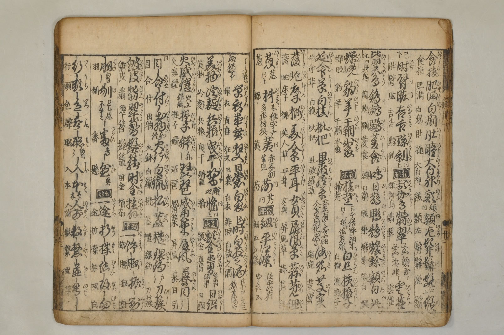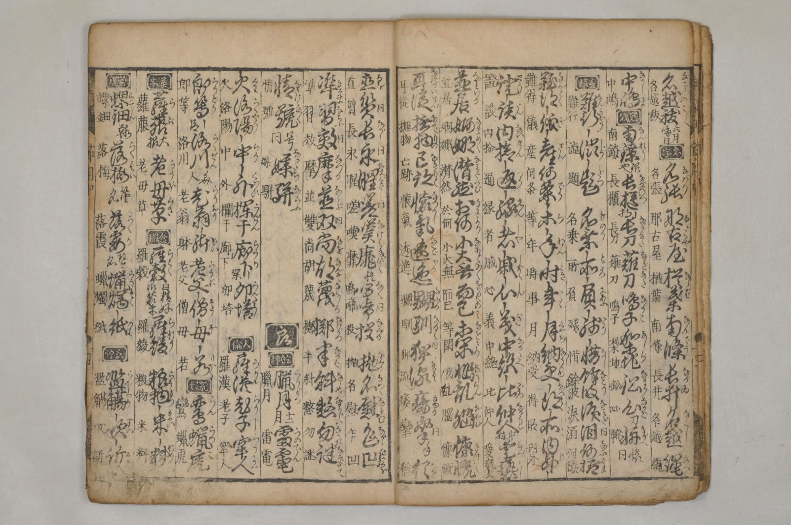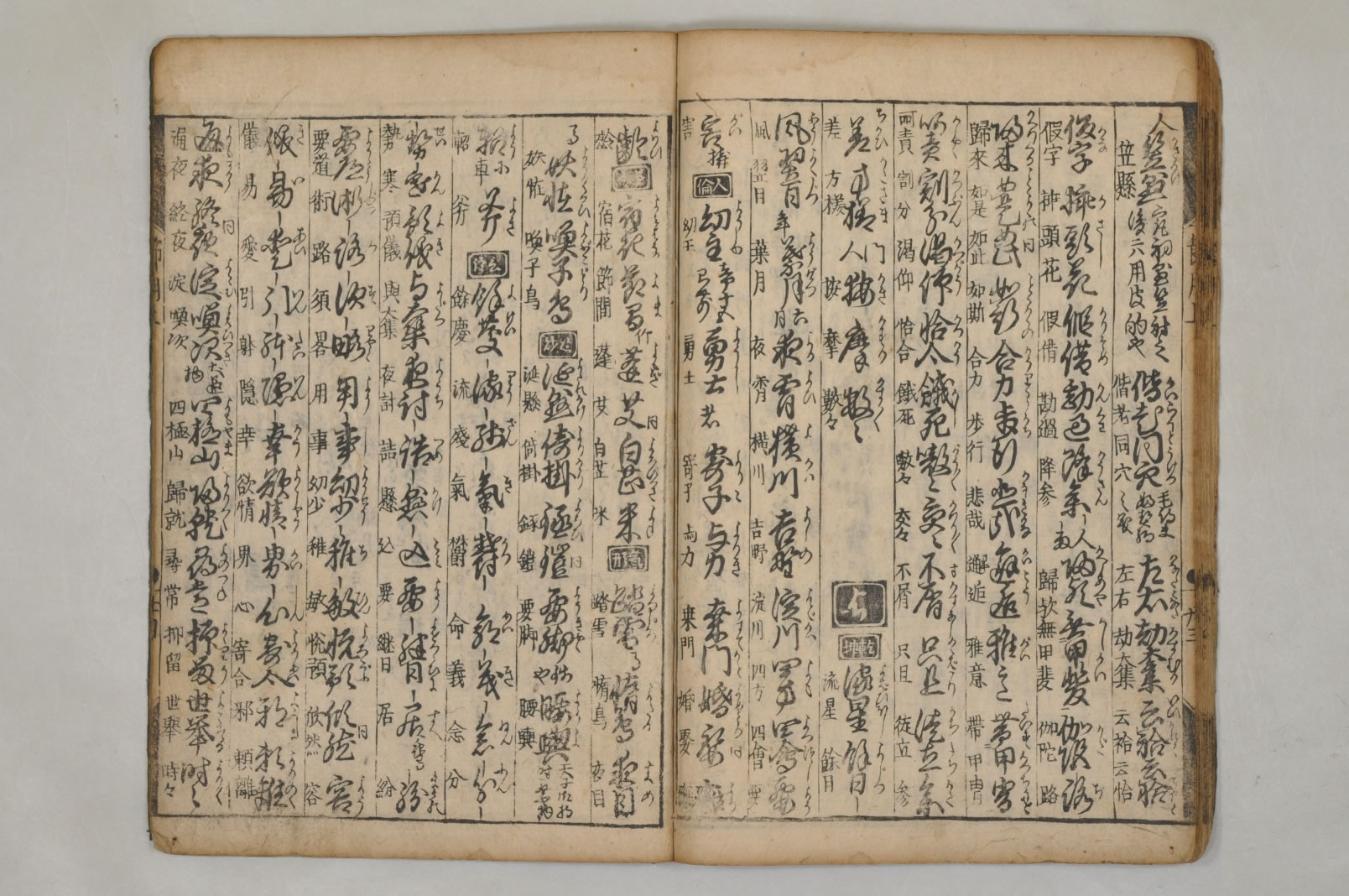 - 短冊簽と方簽共にあり〔一部剥落〕刊記:「寛文五乙巳年五月吉日」上:28丁〔飛丁:13丁を「十三十四」、16丁を「十六十七」とす〕、中:33丁〔飛丁:5丁を「五六」、23丁を「廿三四」とす、12丁目を欠く〕、下:31丁〔飛丁:2丁を「二三」、8丁を「八九」とする、32丁目は裏表紙見返に張付〕