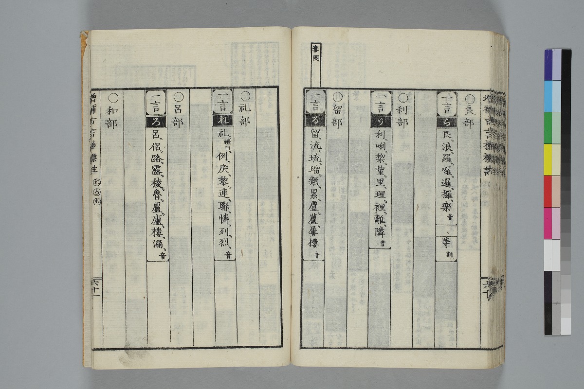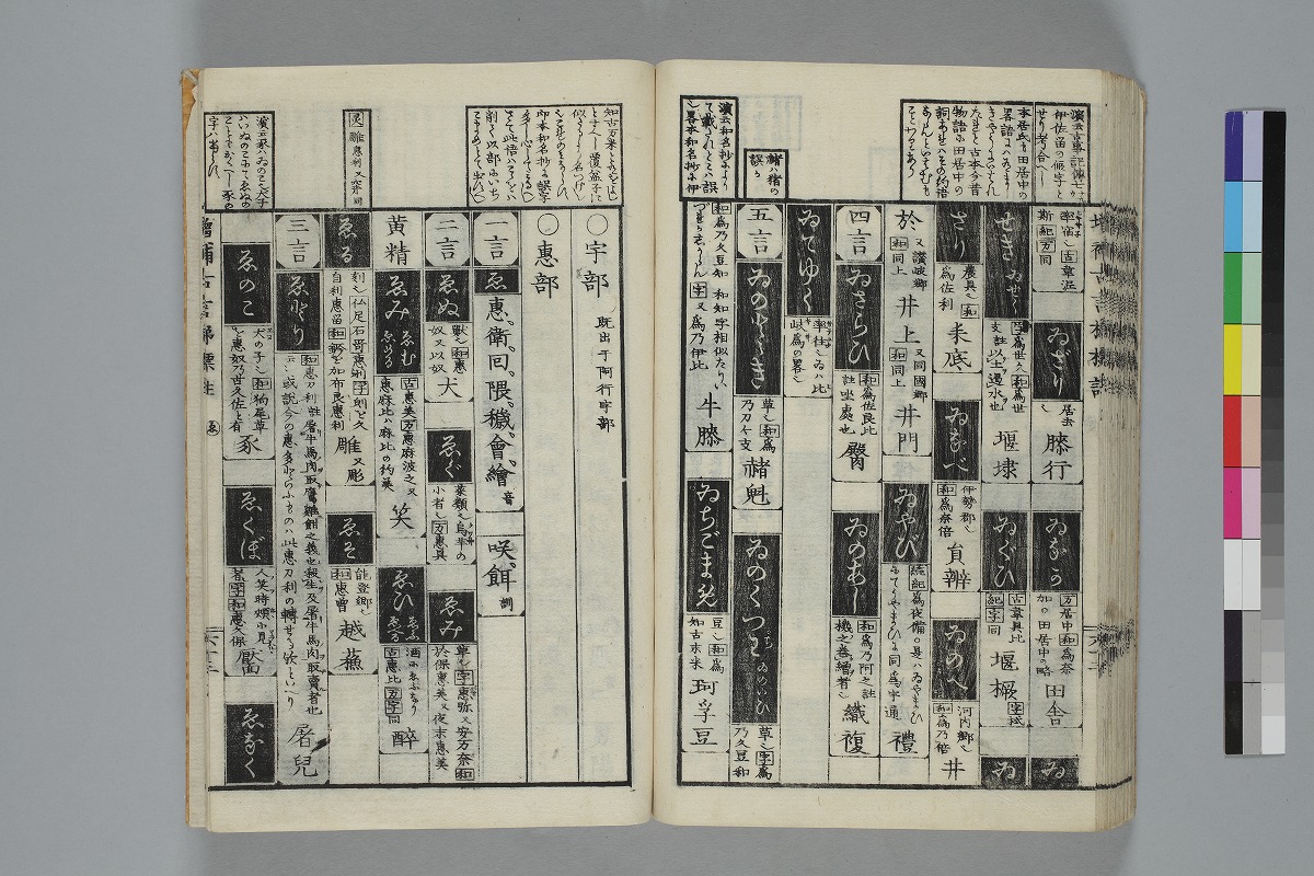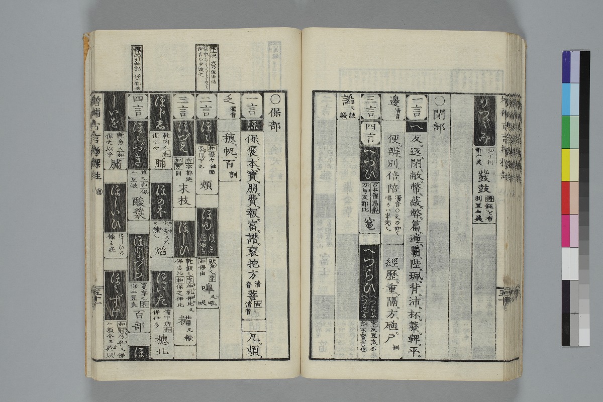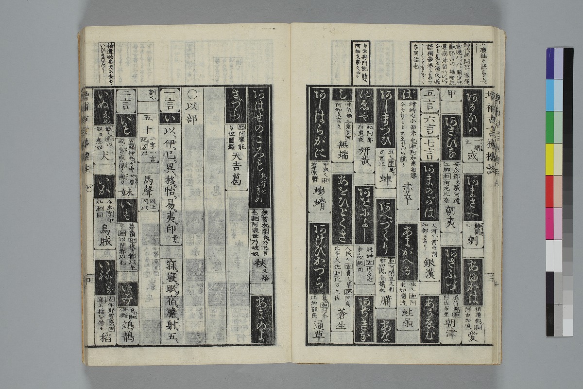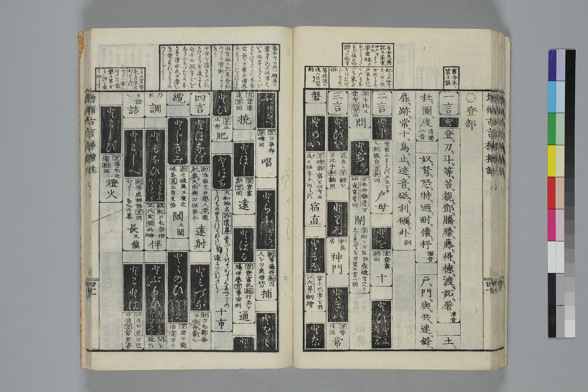 - 小口書:「古言梯全」見返:「弘化四丁未春發兌/(増/補)古言梯標註全/東都書肆青雲堂梓」序:「明和二のとし四月藤原の宇万伎がいふ」附言「魚彦」本文末:「明和のはしめのとしの八月にあつめ終ぬ/下つ総の國なる楫取魚彦/千賀の真恒をくにの浅つら/よみかうかへつ」跋:「是をいた/つきなせしは楫取魚彦/なり、勤かも事かも、賀茂/真淵云」刊記:「山田常助増補/江戸書林英文蔵梓」巻末出版広告:「江都書林下谷御成道青雲堂英文藏板」〔4丁あり〕印記:「釋氏□□」