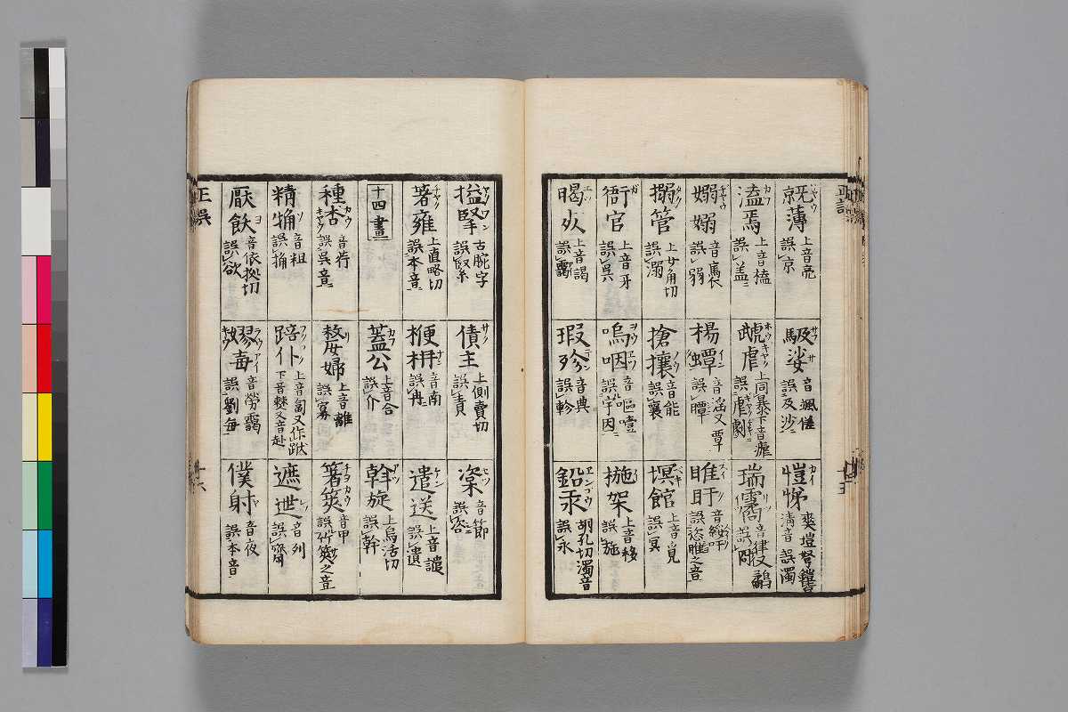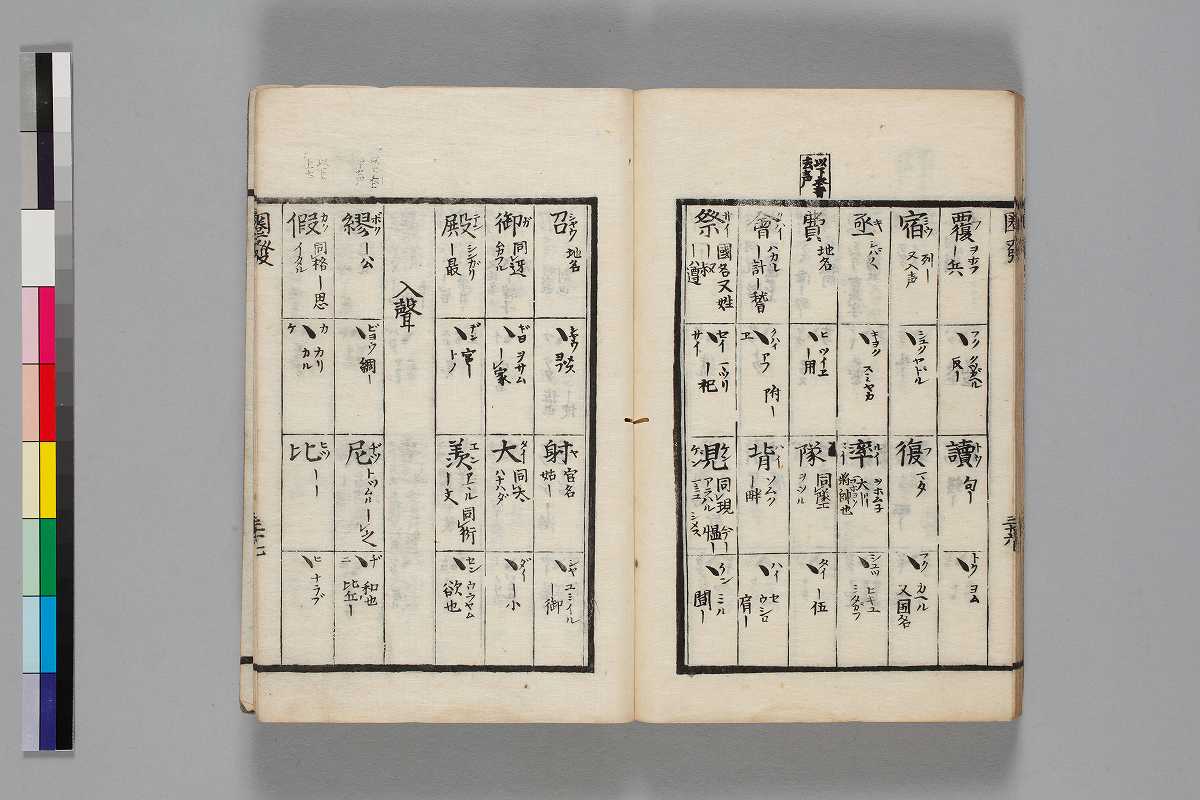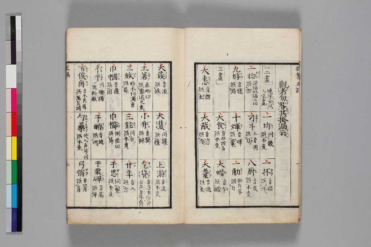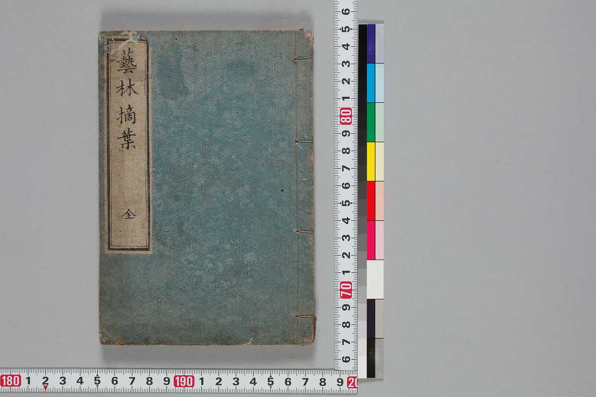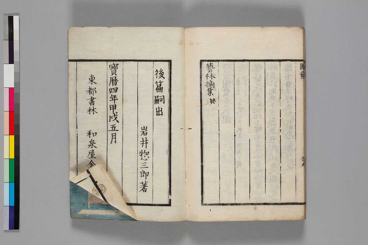 - 見返:「中山井先生著(不許飜刻/千里必究)/蓻林摘葉/東都玉巖堂」序:「寶暦癸酉秋八月笠澤井世翼」奥附:「岩井惣三郎著/寶暦四年甲戌五月/東都書林和泉屋金右衛門」