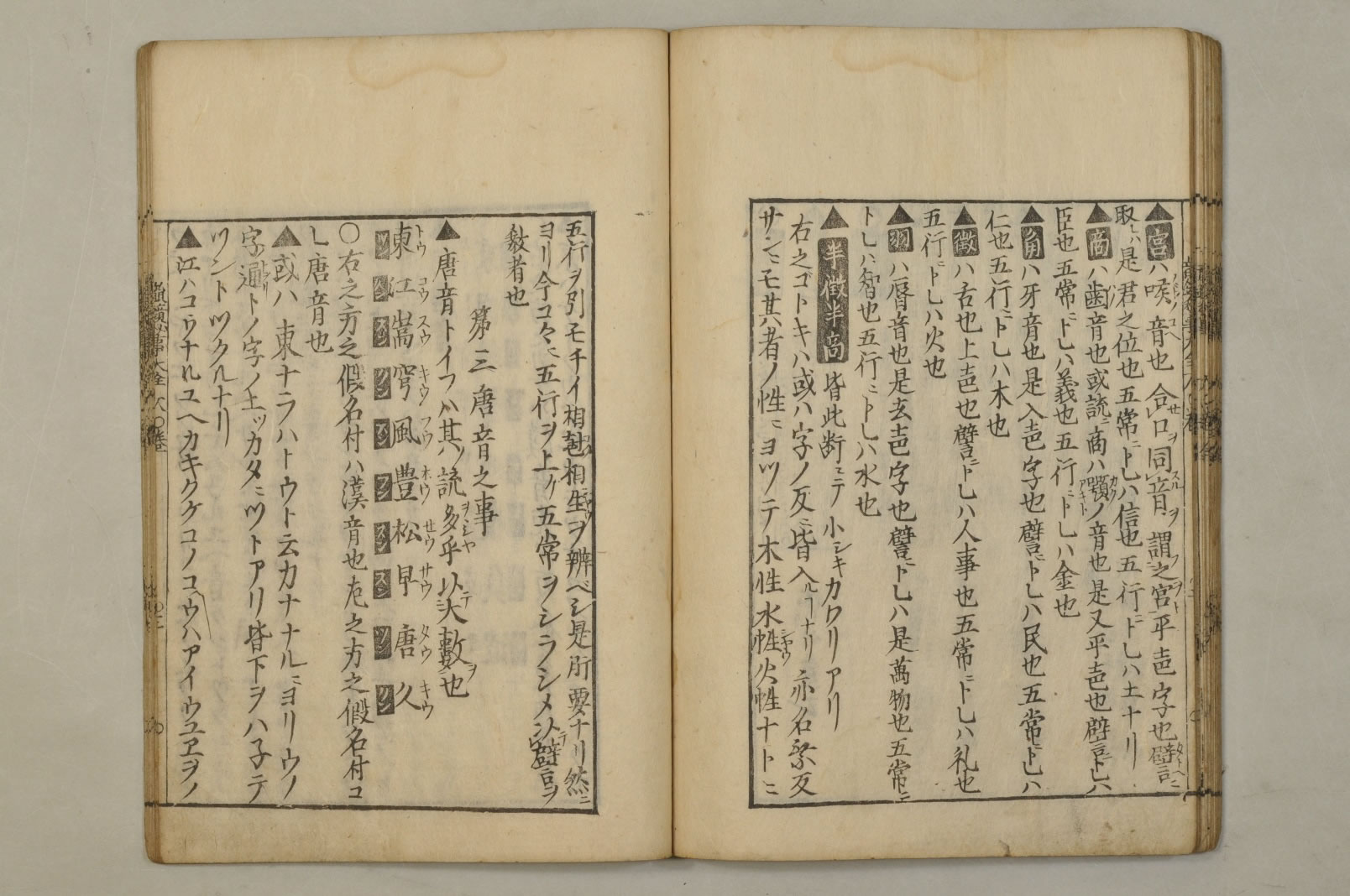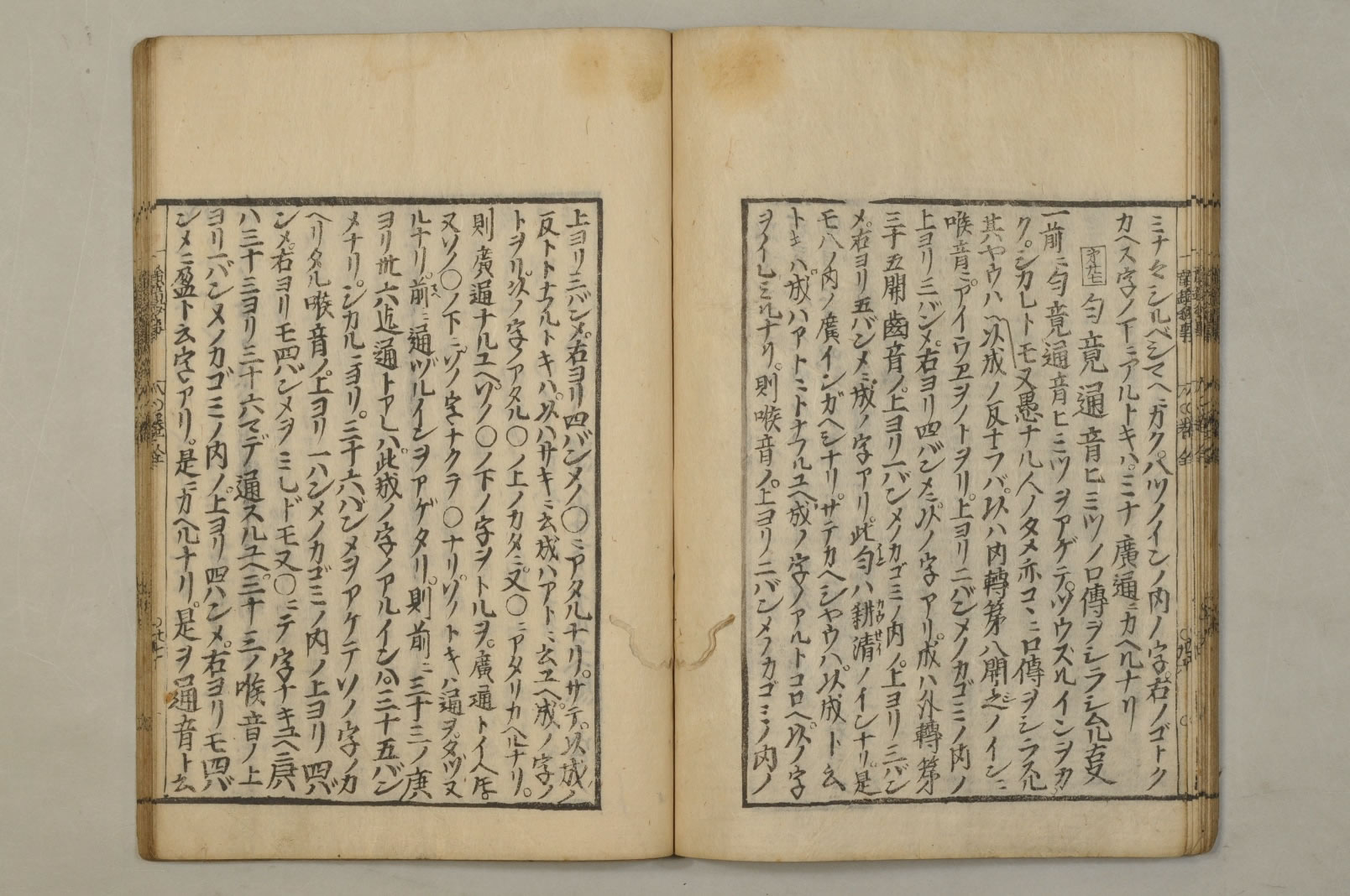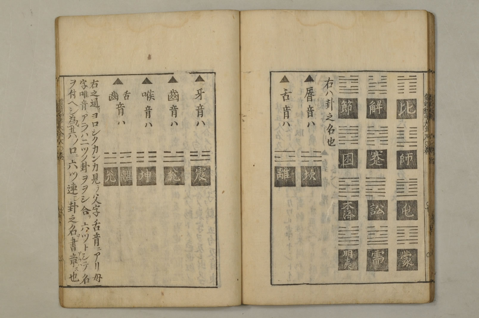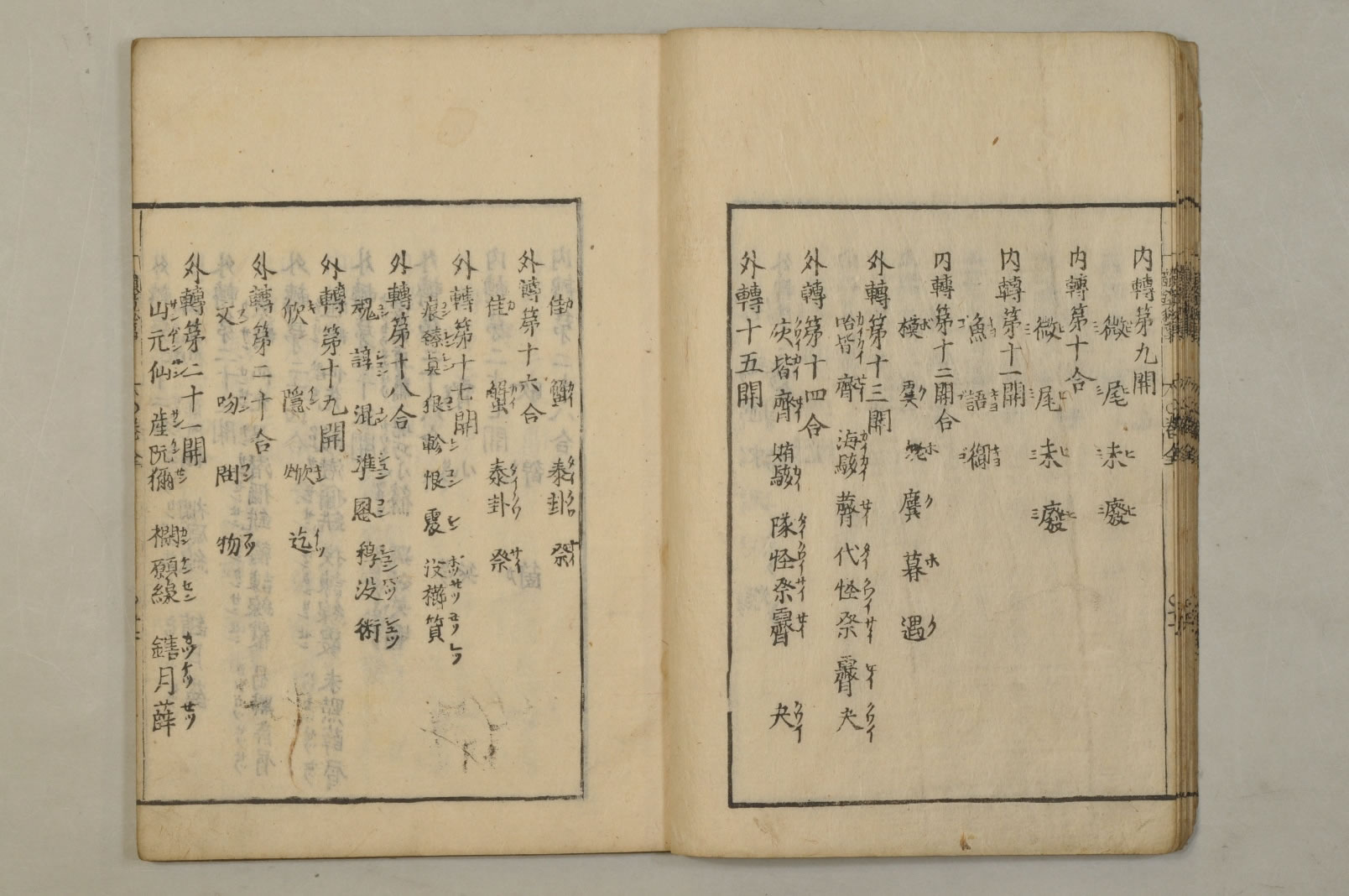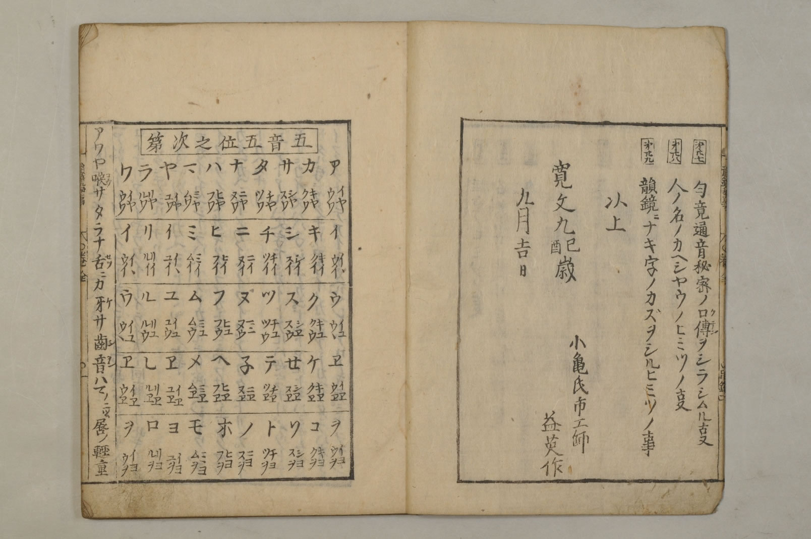 - 表紙欠目録末:「寛文九(己/酉)歳小亀氏市工師益英作/九月吉日」尾題:「韻鏡秘事大全」刊記:「寛文九年菊月吉日益英述之/室町小亀三左衛門板行」巻1:「韻鏡秘事抄」巻2:「韻鏡秘事大全二」巻1:2、31、巻2:1、22丁