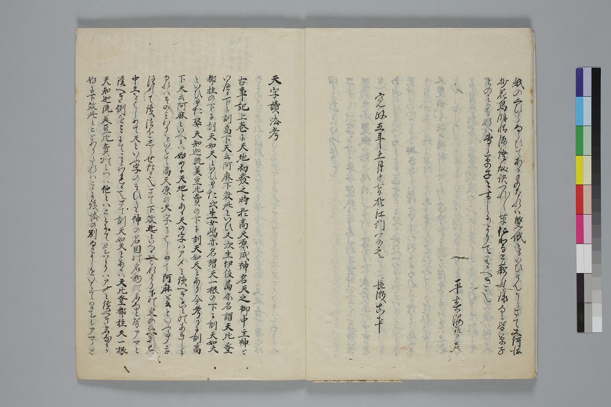 - 宇合稱呼考奥書:「寛政三のとし夘月一日春海しるす/馬甘(ウマカヒ/ウカフ)合カフ/カンカミミト通シ/寛政五年十一月廿日於江門冩之」枕草子題號説奥書:「平春海/寛政五年十一月廿七日於江門写之長瀬眞幸」天字讀法考奥書:「寛政三のとしの夏人々と古事記をよみ考へしついてに記/しぬ平春海」五十音辨誤奥書:「寛政五年三月六日平春海/寛政五年夏於江門写之長瀬眞幸」巻末奥書:「〔以下朱書〕此宇合称呼考以下三書借得橿園藏書書冩焉/明治十二年五月下旬中尾五百(花押)」印記:「中尾藏書」