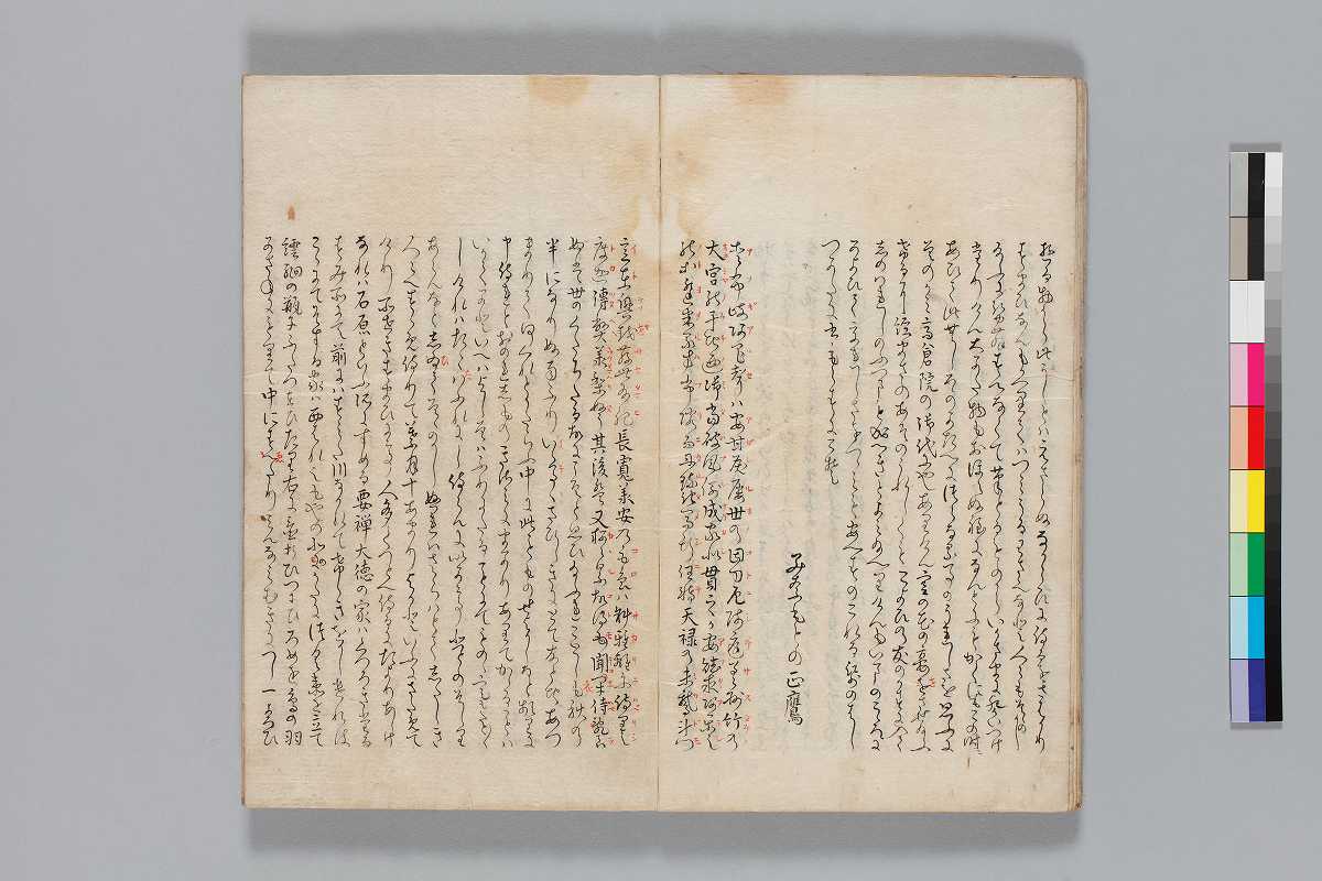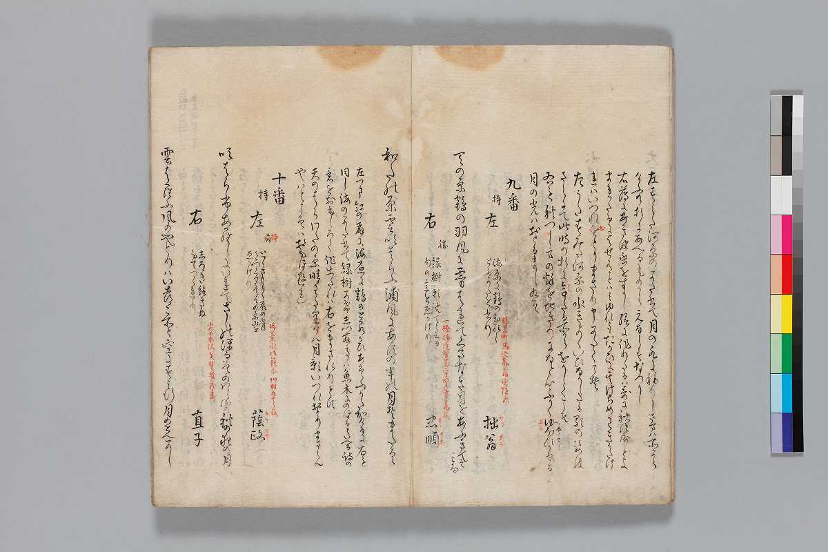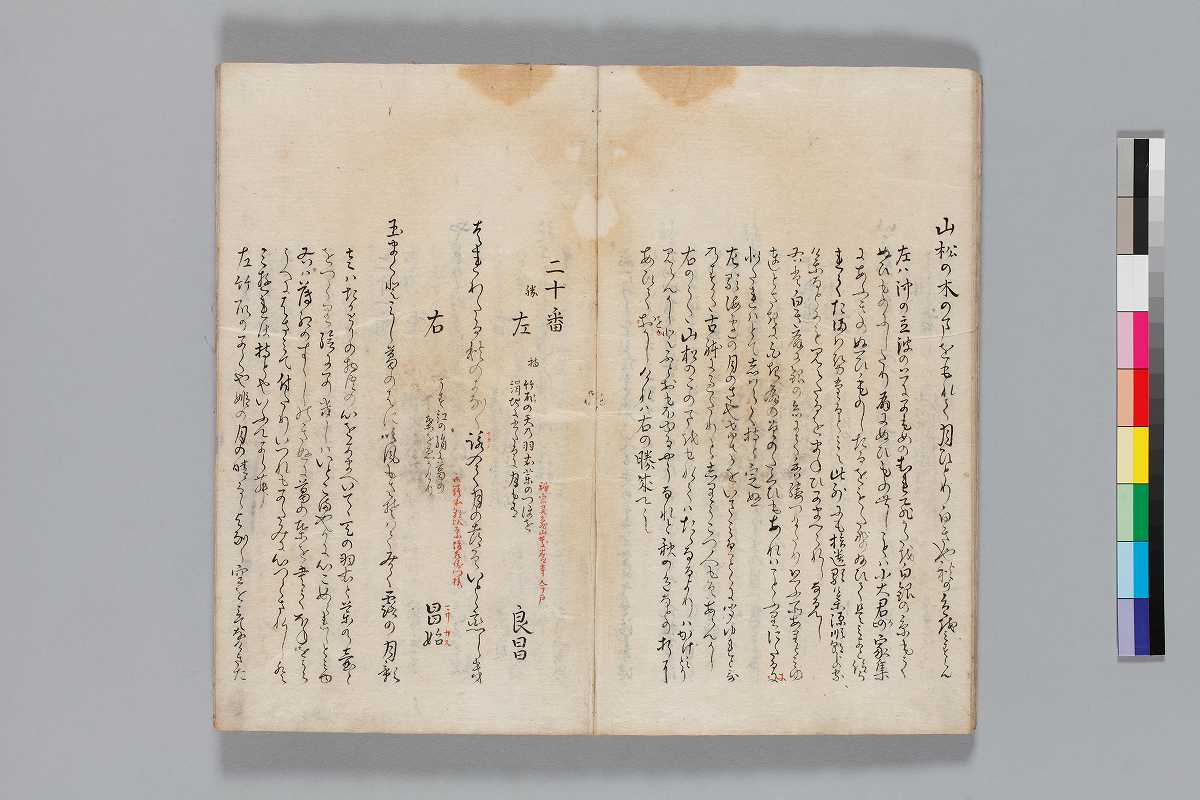 - 裏表紙見返にも跋あり跋:「此廿三番の扇合はこたみ同じ心の友か〔中略〕新發意明阿弥陀佛」「八月中の四日はかりちかき川邊のやとりにて〔中略〕蚊田蒼生子」「物合は石上ふりにたる世の事にて〔中略〕みなもとの正鷹」奥書:「文化八(辛/未)年春藩御祐筆川島源之丞書写/林光正茂屋玄樹蔵本」印記:「茂屋」ほか印文未詳印1顆