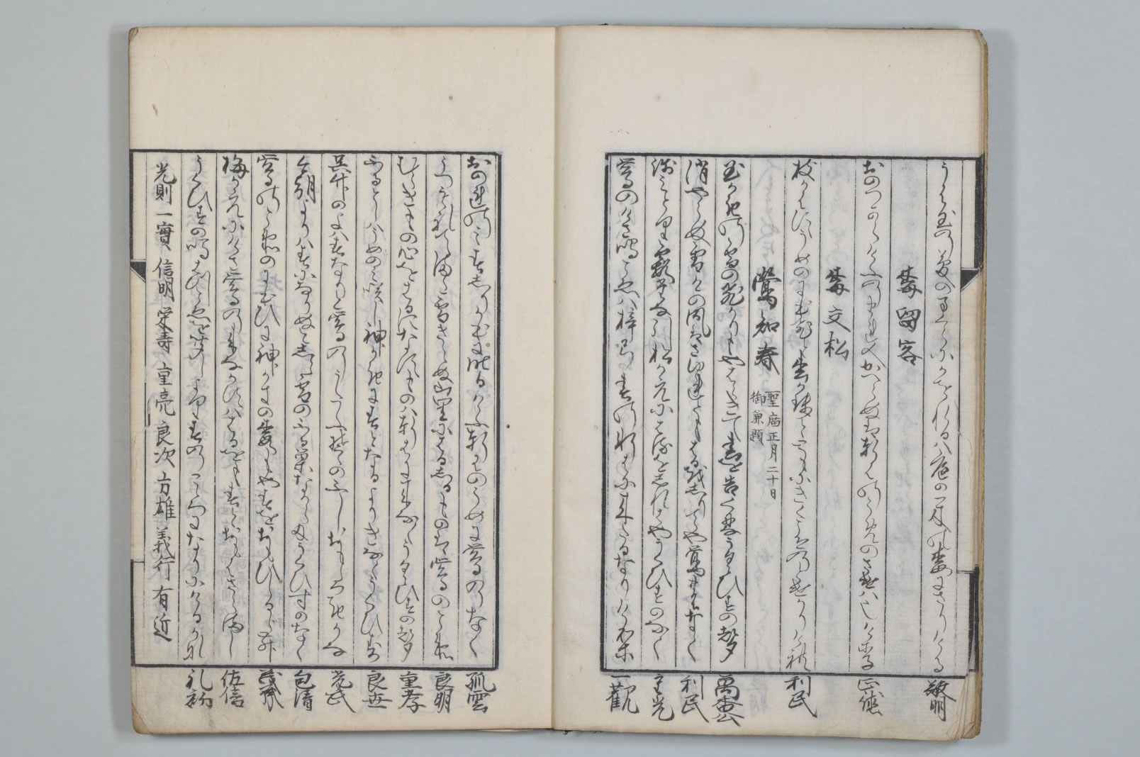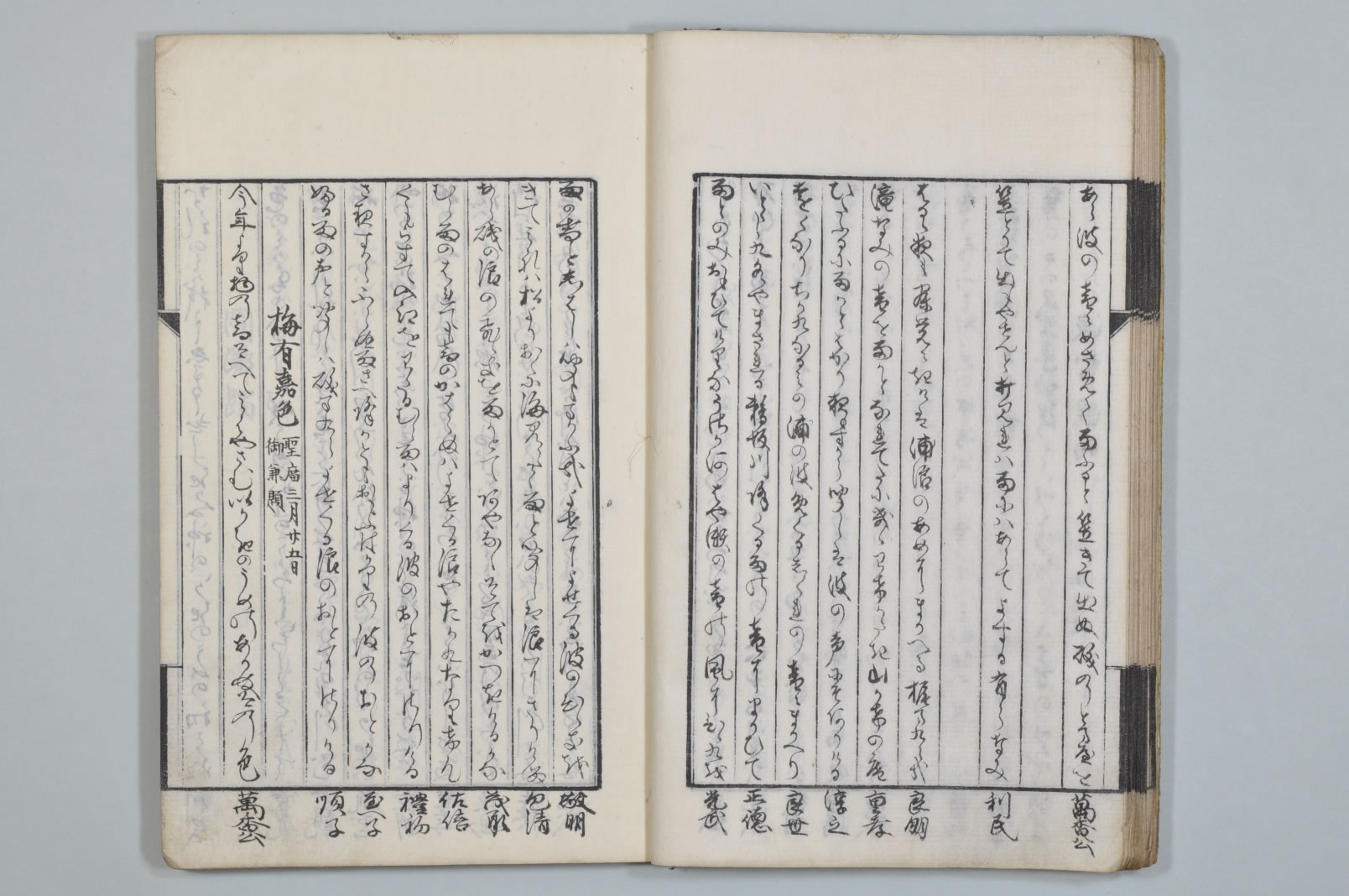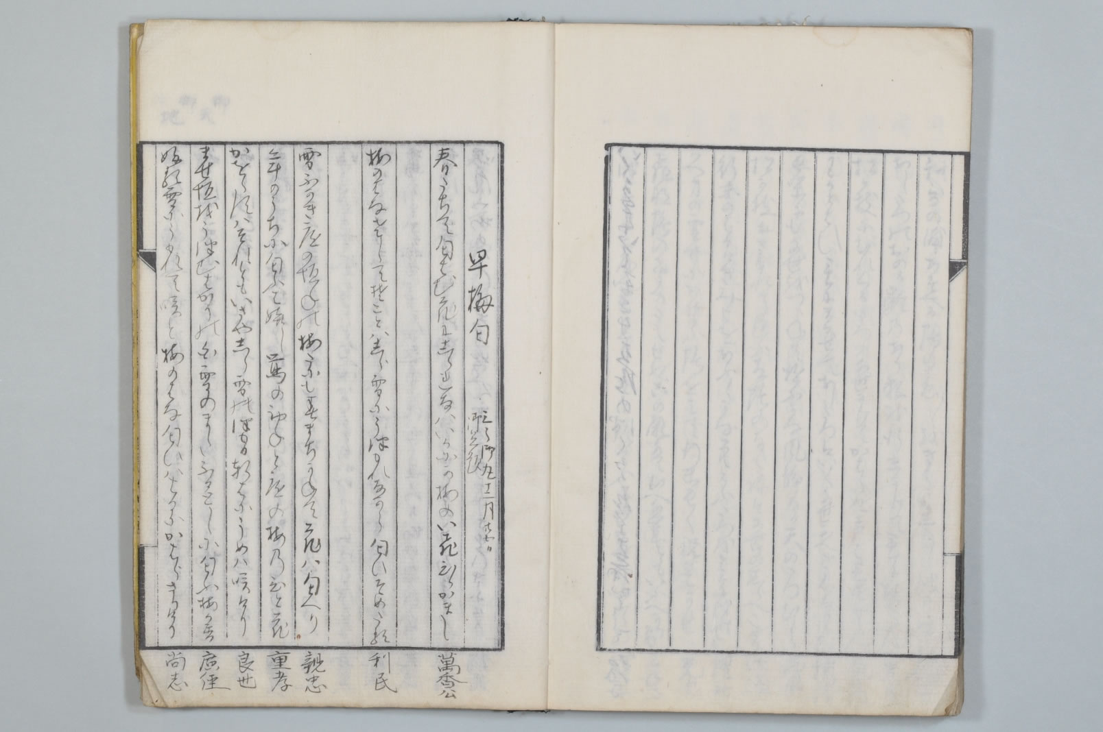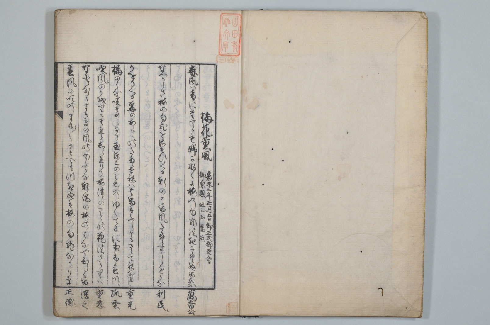 - 巻頭:「梅花薫風(嘉永三年正月五日御正式御発會/御兼題但シ御懐紙)最終丁版心:「御歌留中ノ紙百貳拾七枚也」印記:「若鳥」他印文未詳印2〔うち1つは「萬香文庫」か〕顆